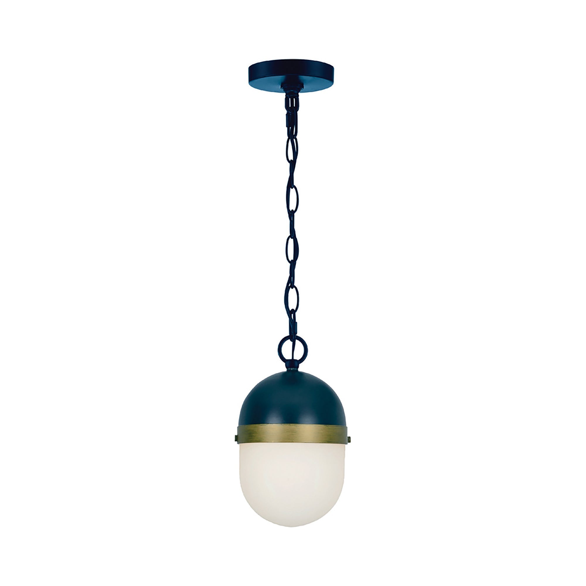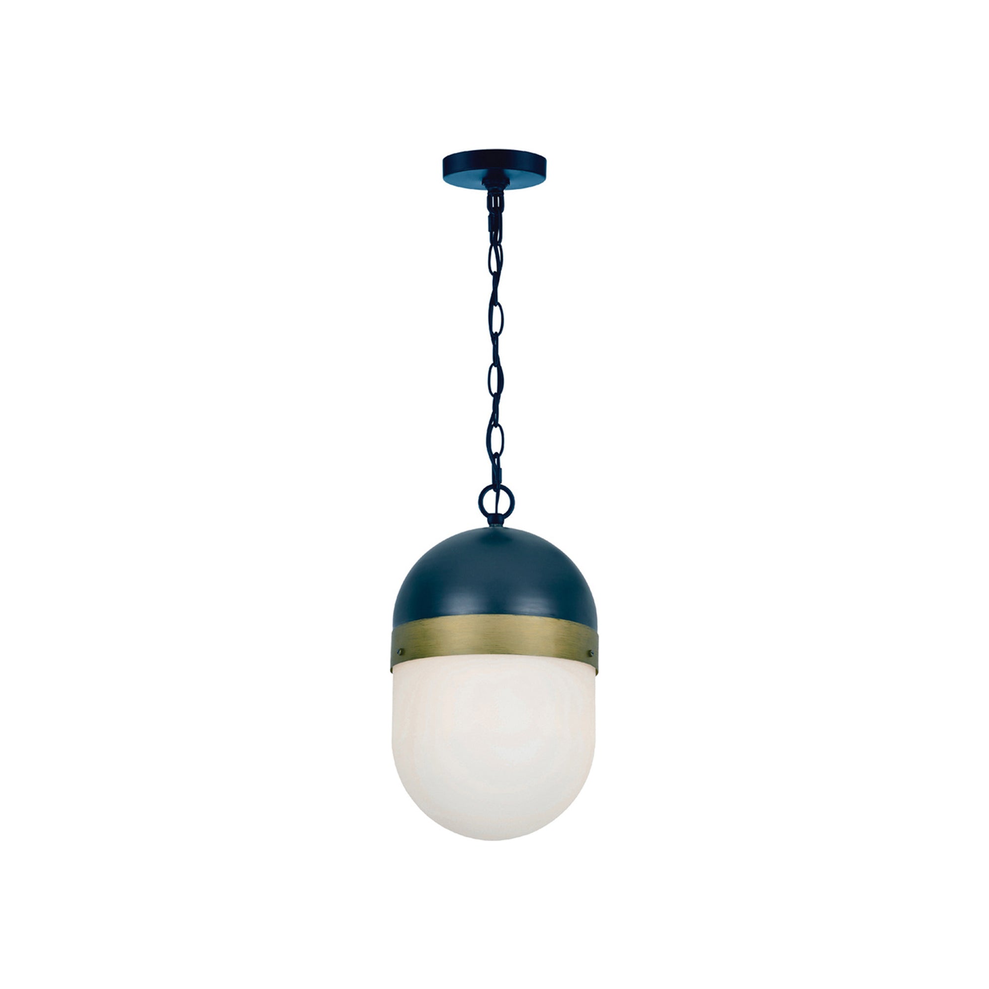 The Capsule Outdoor Pendant Light from Crystorama revives a storied design era with Art Deco vibes. Retro influence blends a dome shade with mixed finishes, as a long, domed shade and chain link suspension maintains the casual ambiance perfect for outdoor spaces.