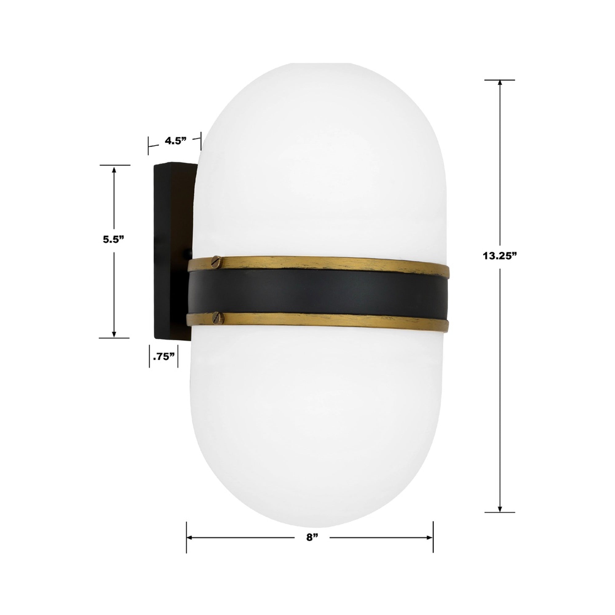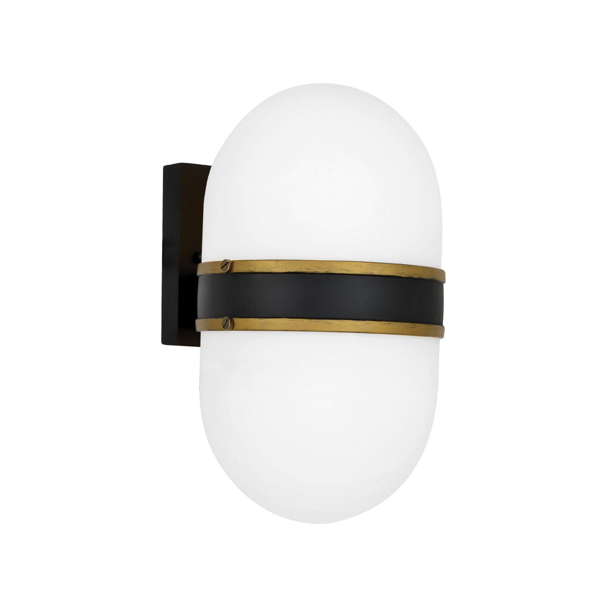 Retro style goes romantic and feisty in an exterior light fixture with personality. Dress up a structure with the Capsule Outdoor Wall Light from Crystorama and enjoy a bit of Art Deco attitude with matte black and textured gold finish metal framing, and a dual oval shade finishing an eye-catching silhouette.