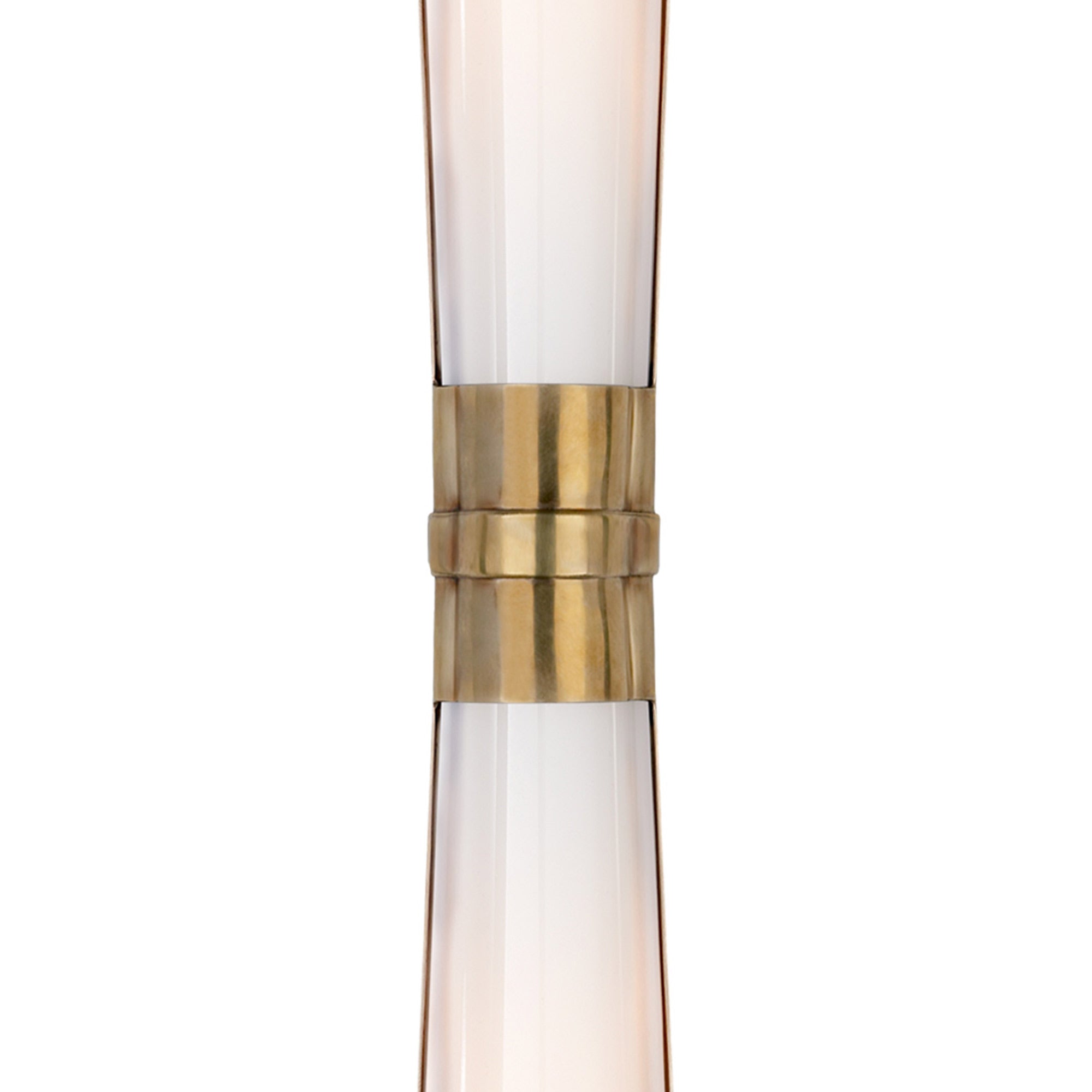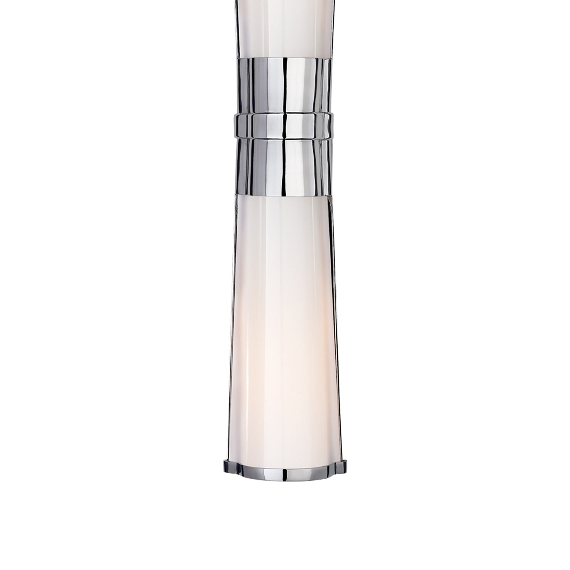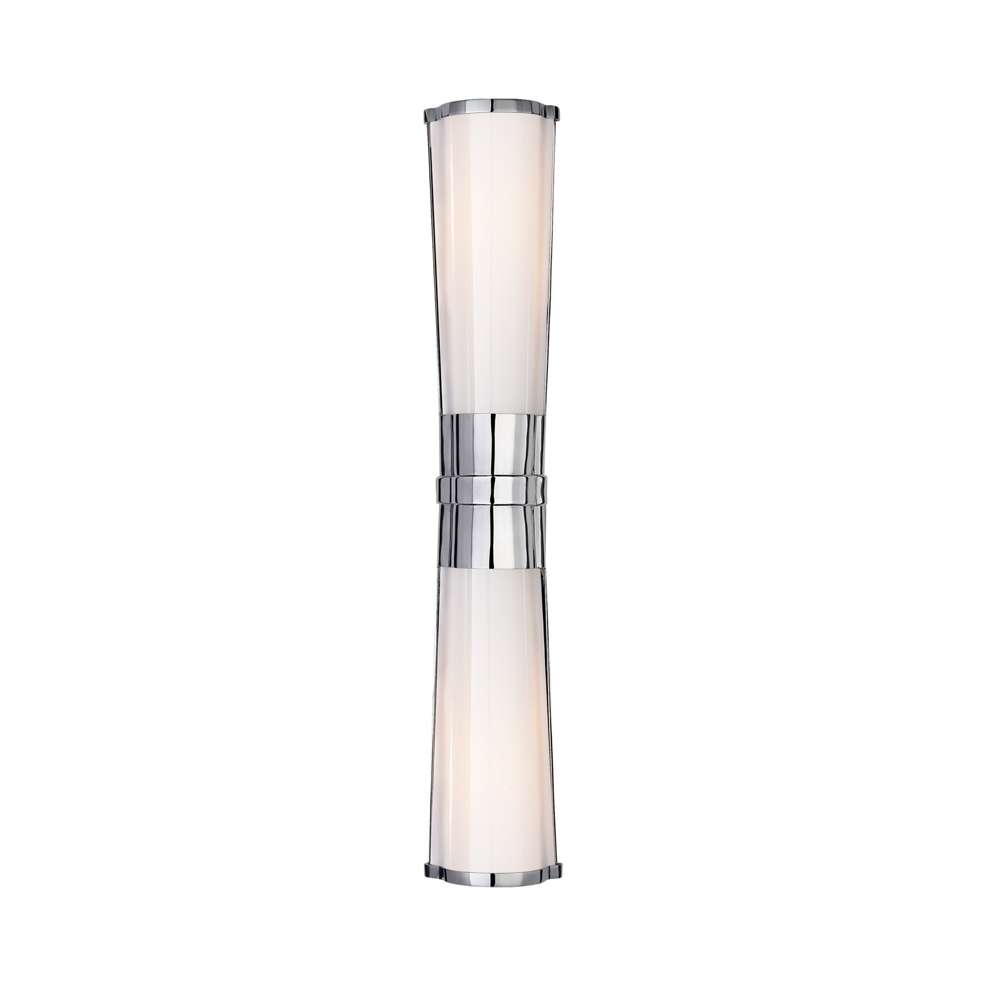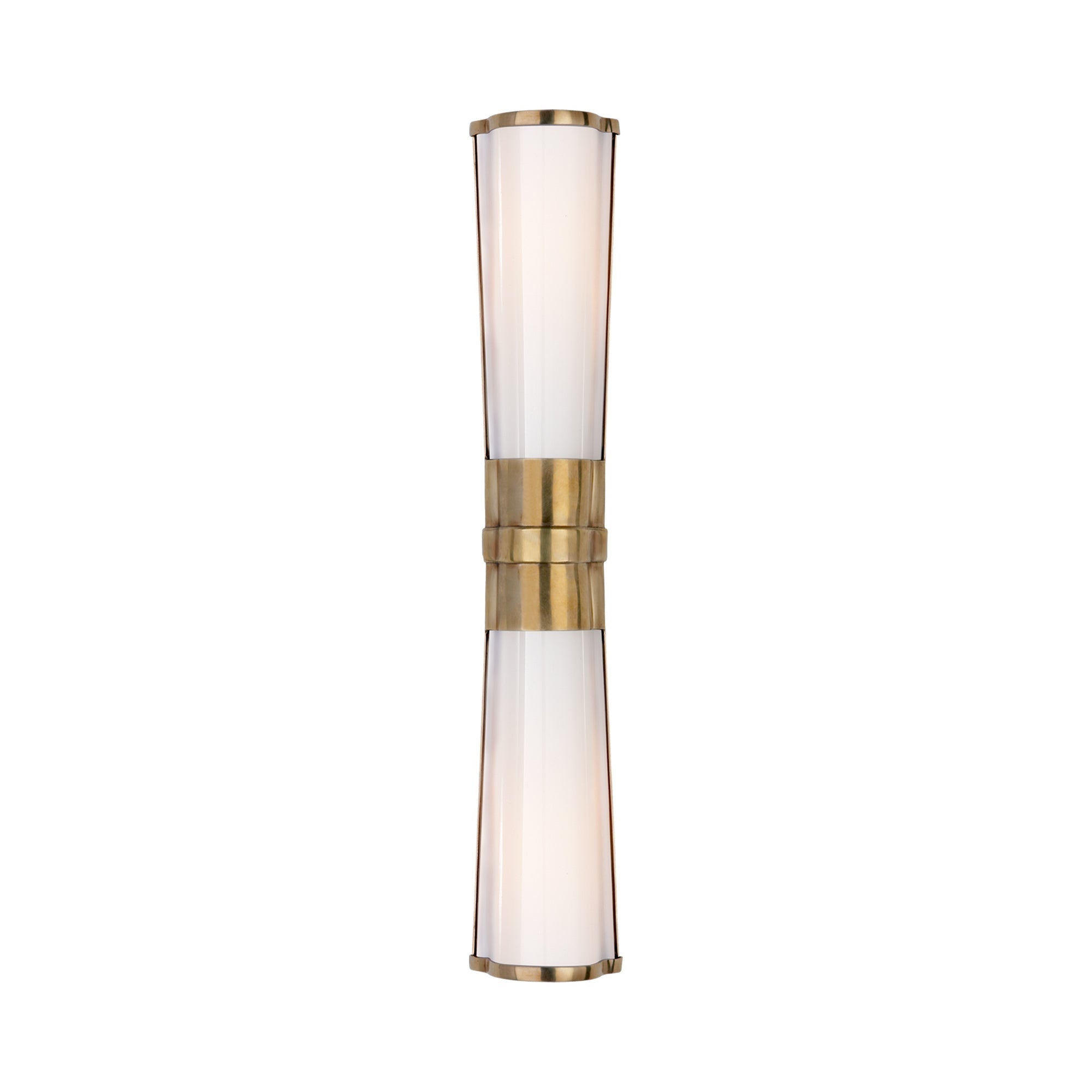 Art Deco-inspired influences shine through in this modern Carew Vanity Wall Light from Visual Comfort Signature, designed as a slender hourglass shape that offers a refined handsome aesthetic and glam touch. A white glass shade gives off a diffused glow, enhancing a dressing area and offering a lovely minimalist flair to bathrooms and powder rooms.