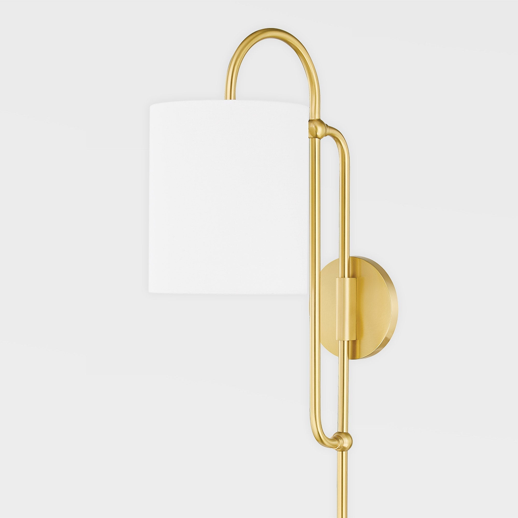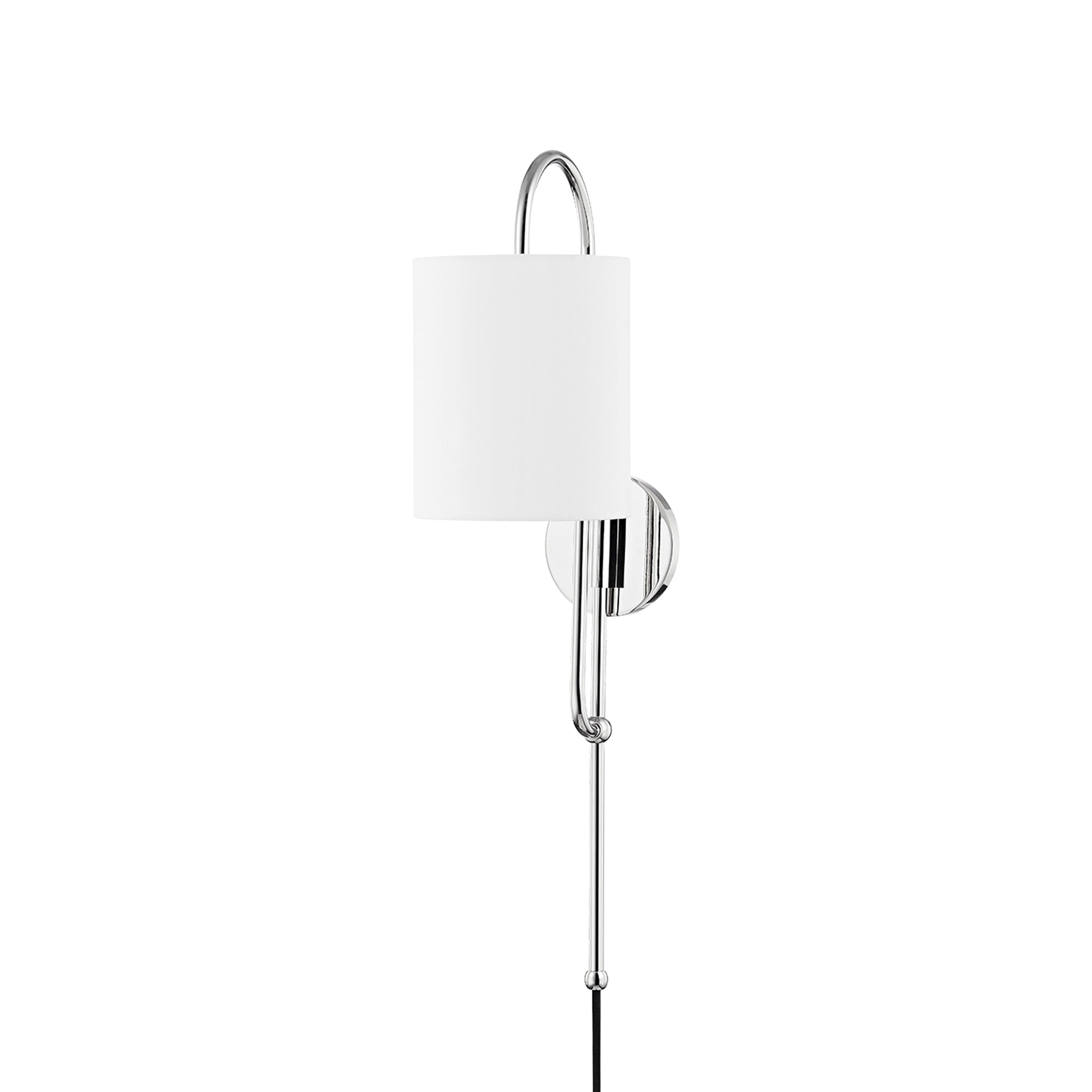 Industrial influences carry through in this elegant contemporary Caroline Plug-In Wall Light from Mitzi. Minimalist with a glam touch, this plug-in wall sconce sweeps into action, dropping in a tall cylindrical white linen shade with its dimensional open arms.