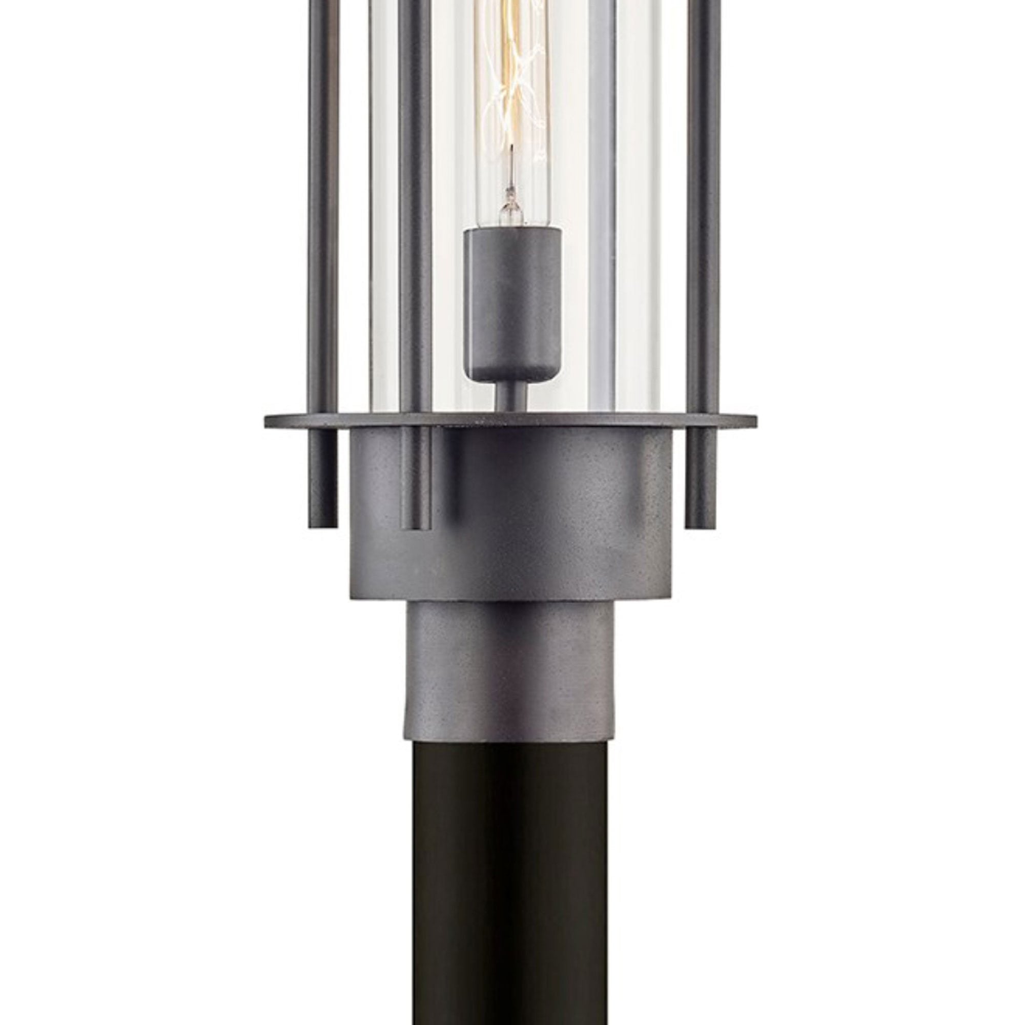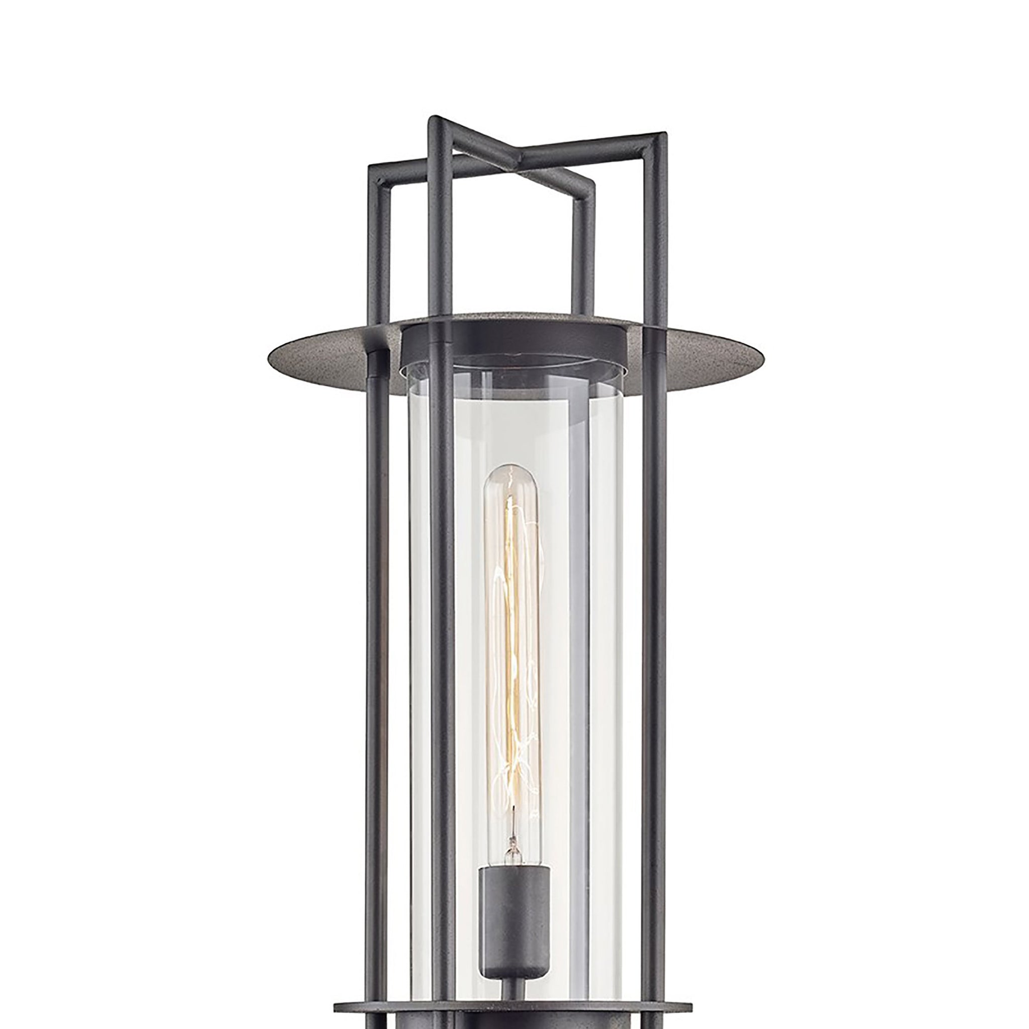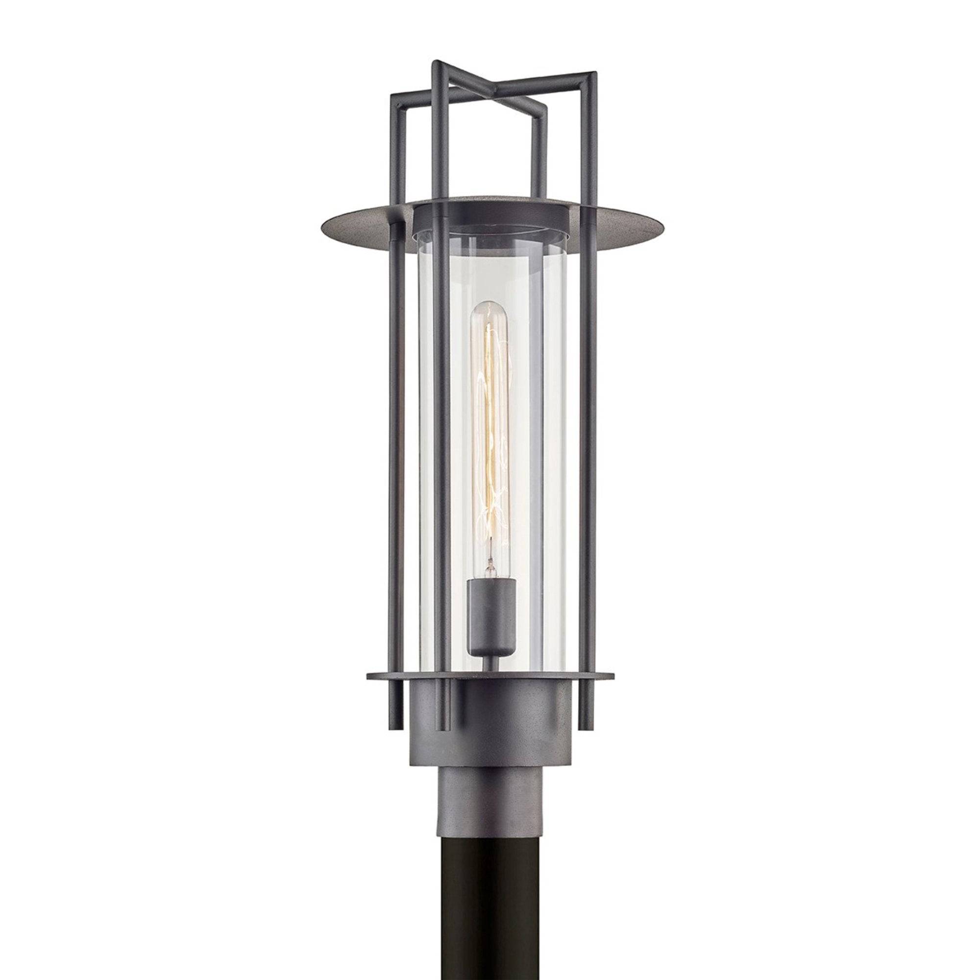 Intersecting U-frames and a wide canopy create a compelling, modern industrial silhouette for the bronze finish Carroll Park Outdoor Post Light from Troy Lighting.