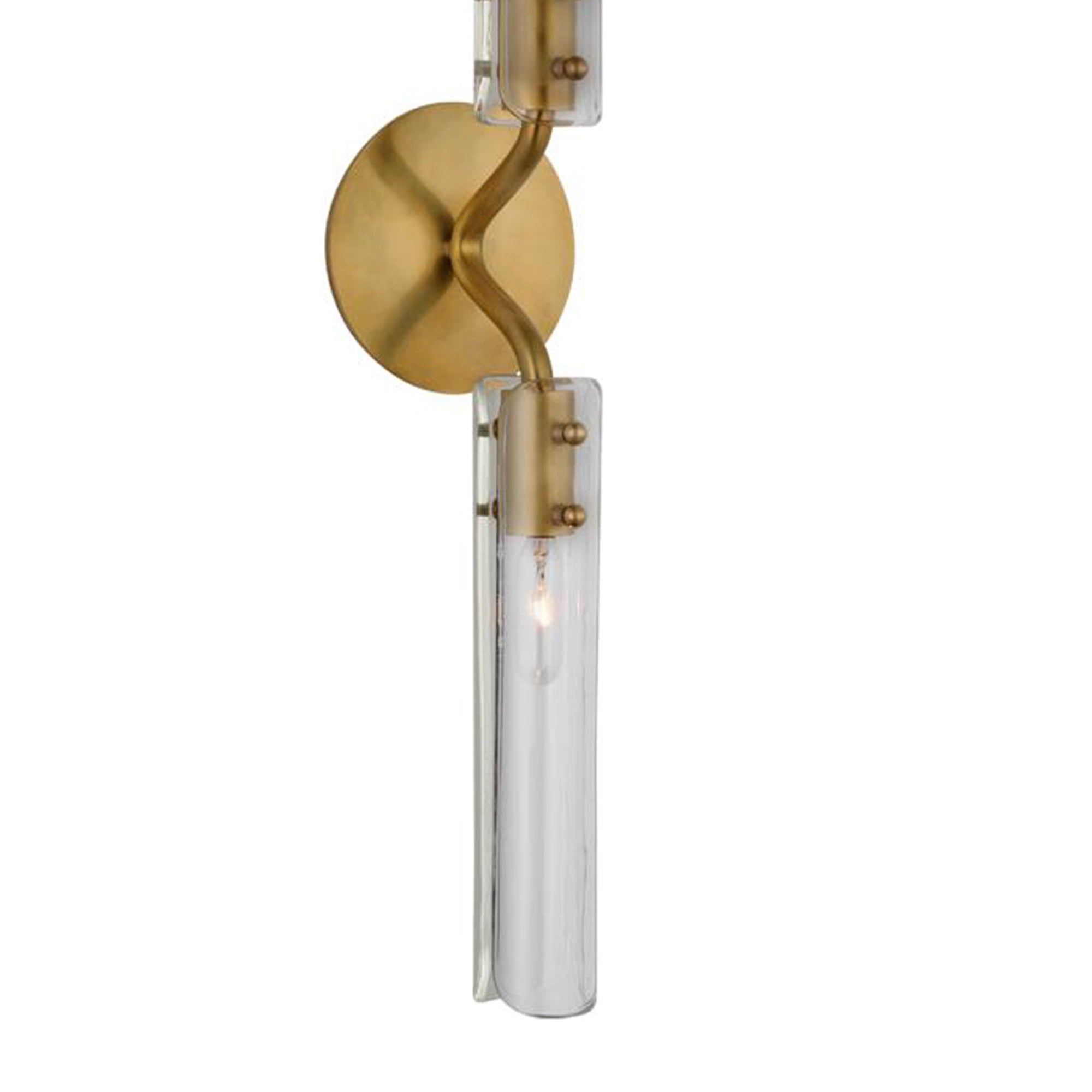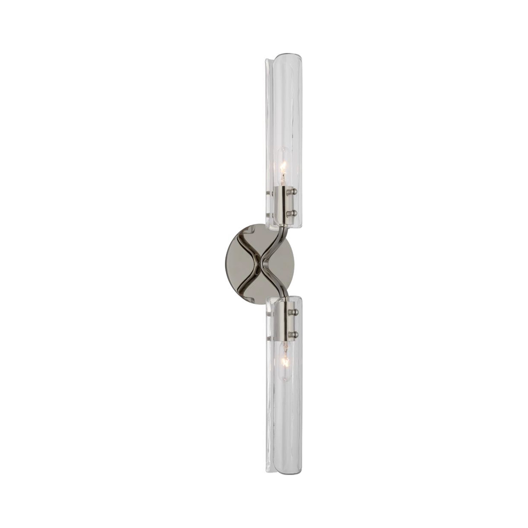 A sleek linear silhouette transforms the modernized retro-inspired contemporary Casoria Vanity LED Wall Light from Visual Comfort Signature into a minimalist-inspired statement piece. This energy-efficient wall light boasts split clear glass tube shades on each end, accented by rivet details and metallic elements that enhance the industrial Mid-Century Modern aesthetic.