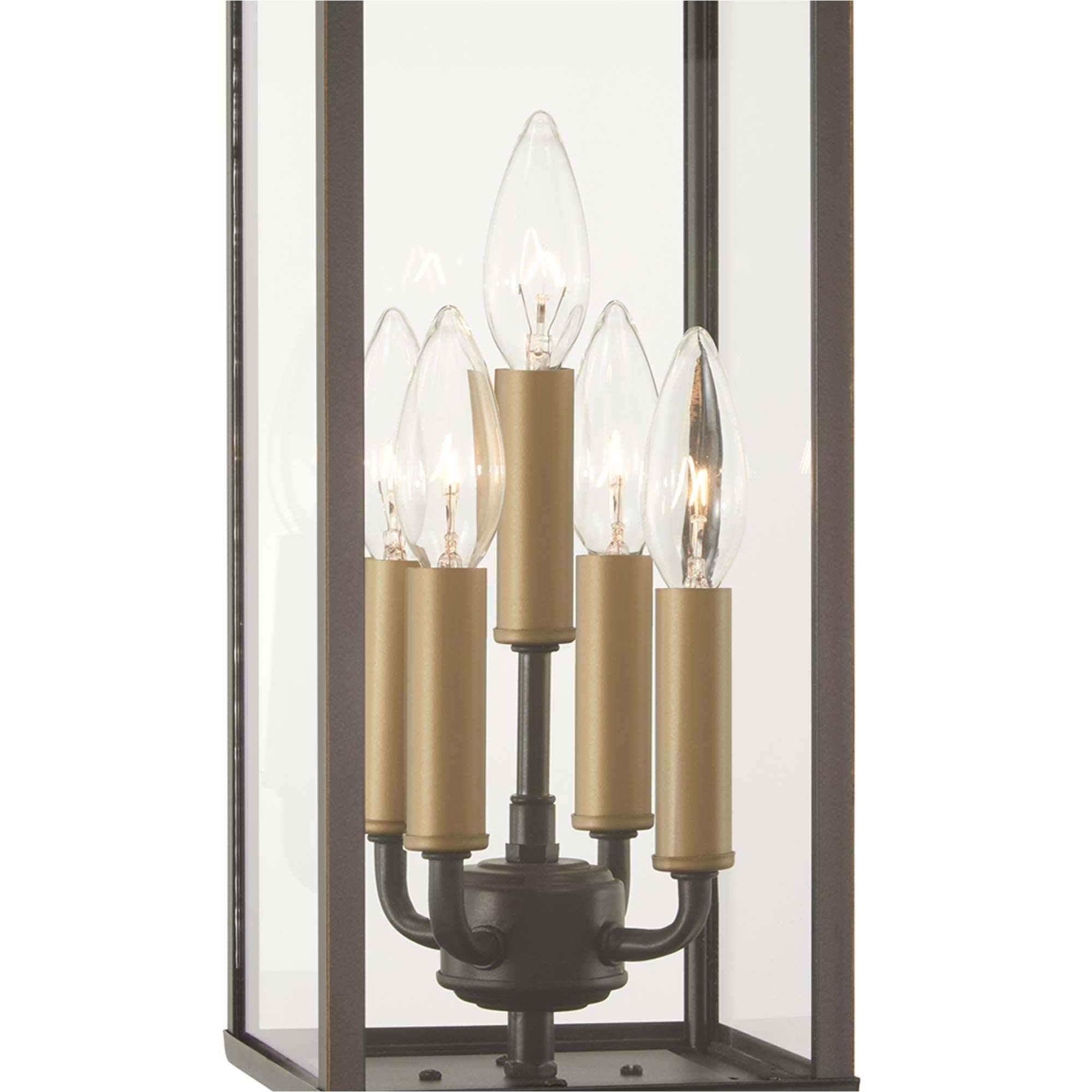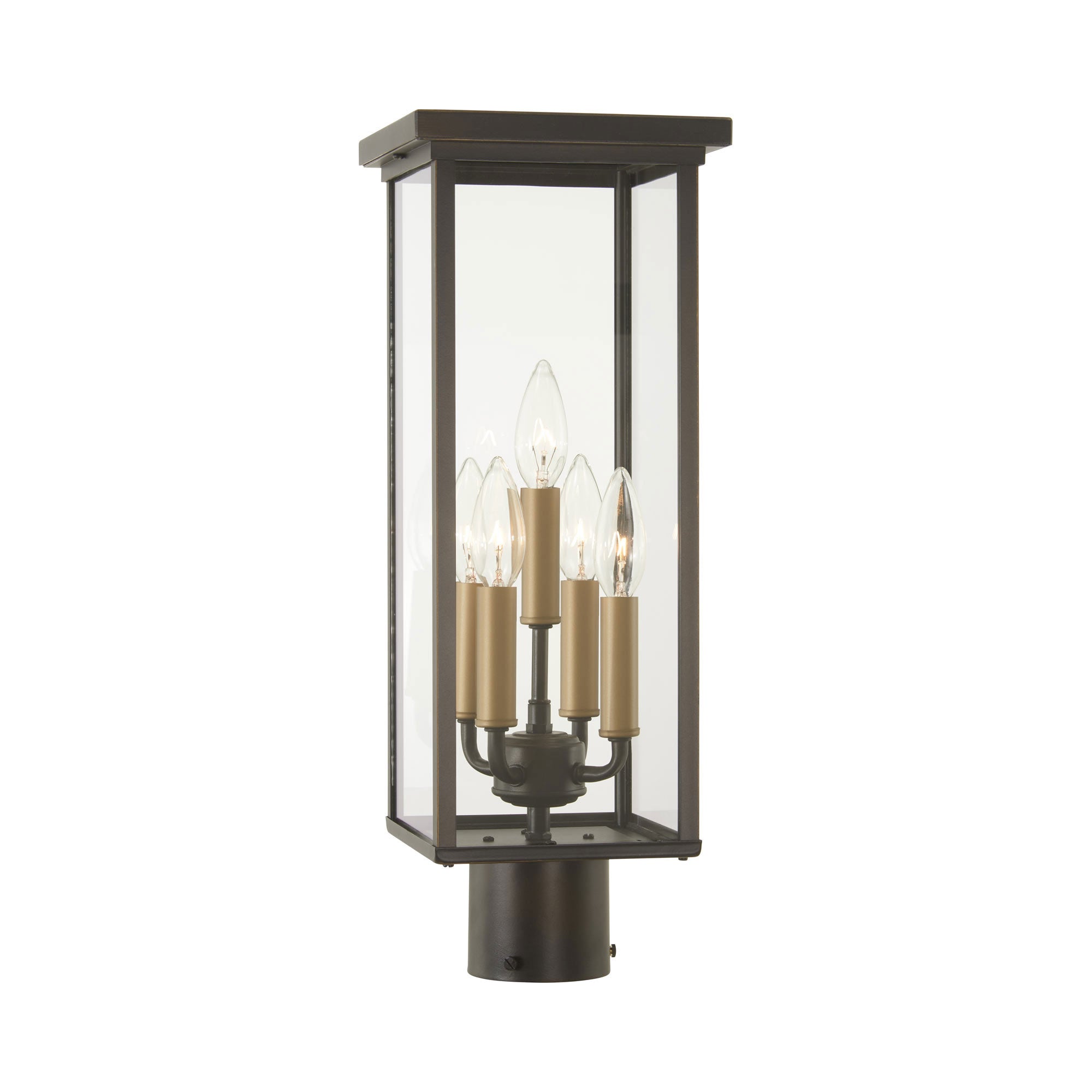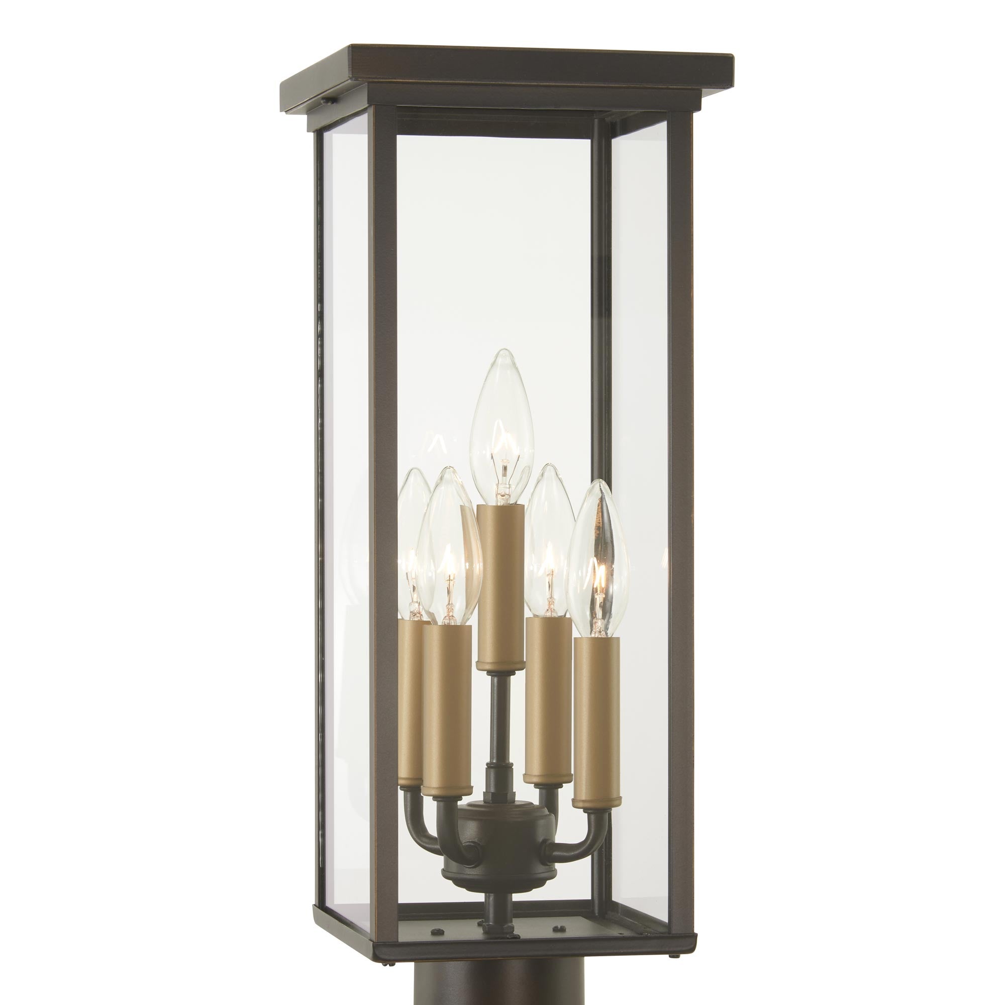 Clean lines hint at a sleek modern motif creating a tasteful exterior fixture in the Casway Outdoor Post Light from The Great Outdoors. Custom landscaped settings and walkways deserve stylish highlighting, and this post light delivers with a boxy lantern-inspired frame fashioned of oil rubbed bronze metal with soft gold highlights. A multi-light candelabra-style bulb socket with gold accenting expands its rustic yet contemporary palette.