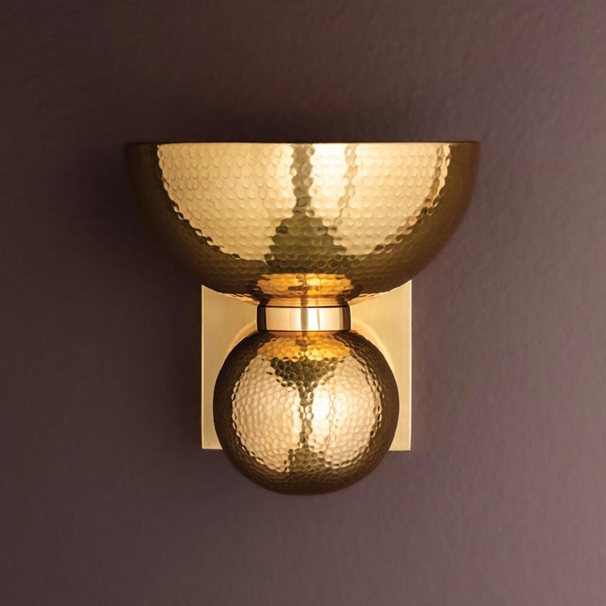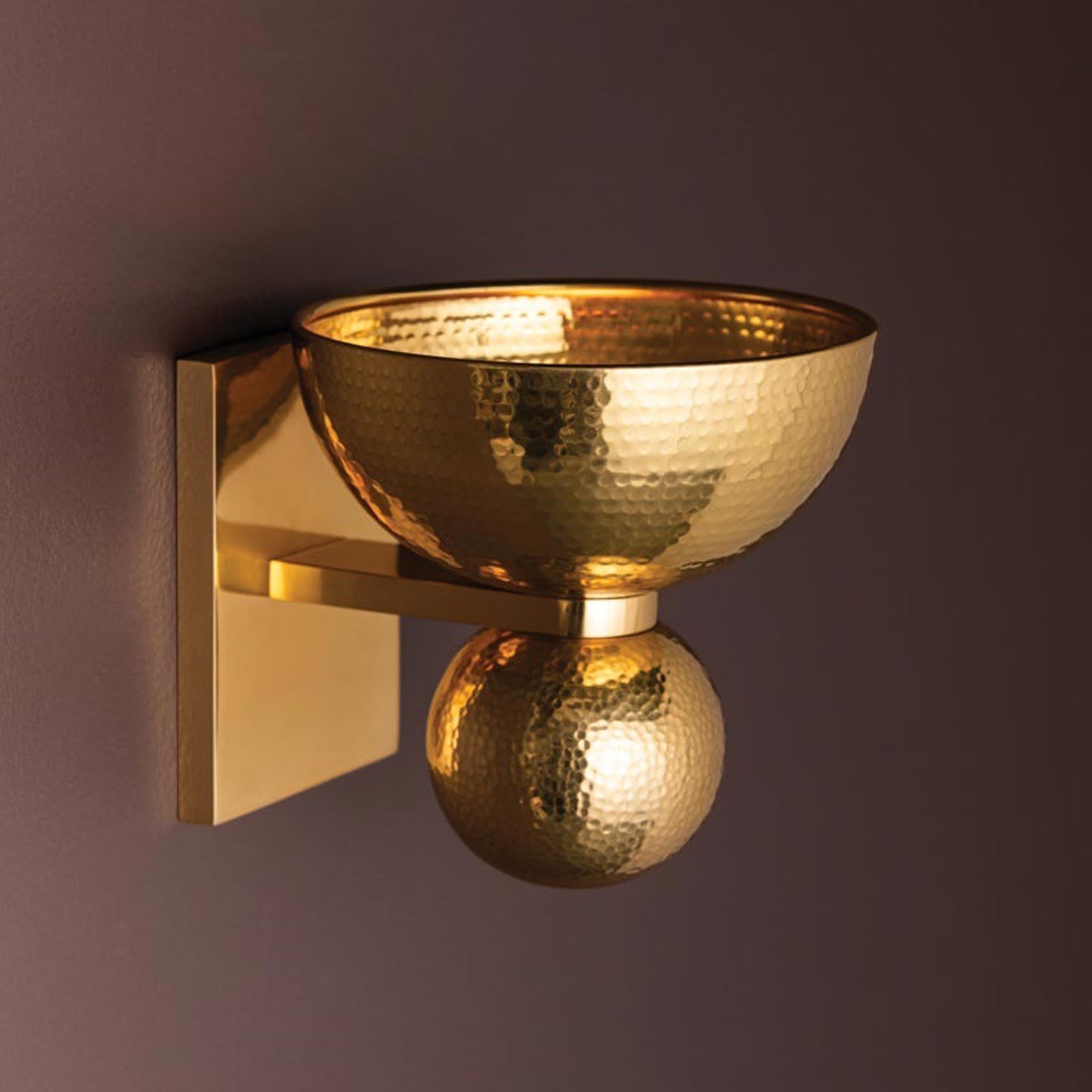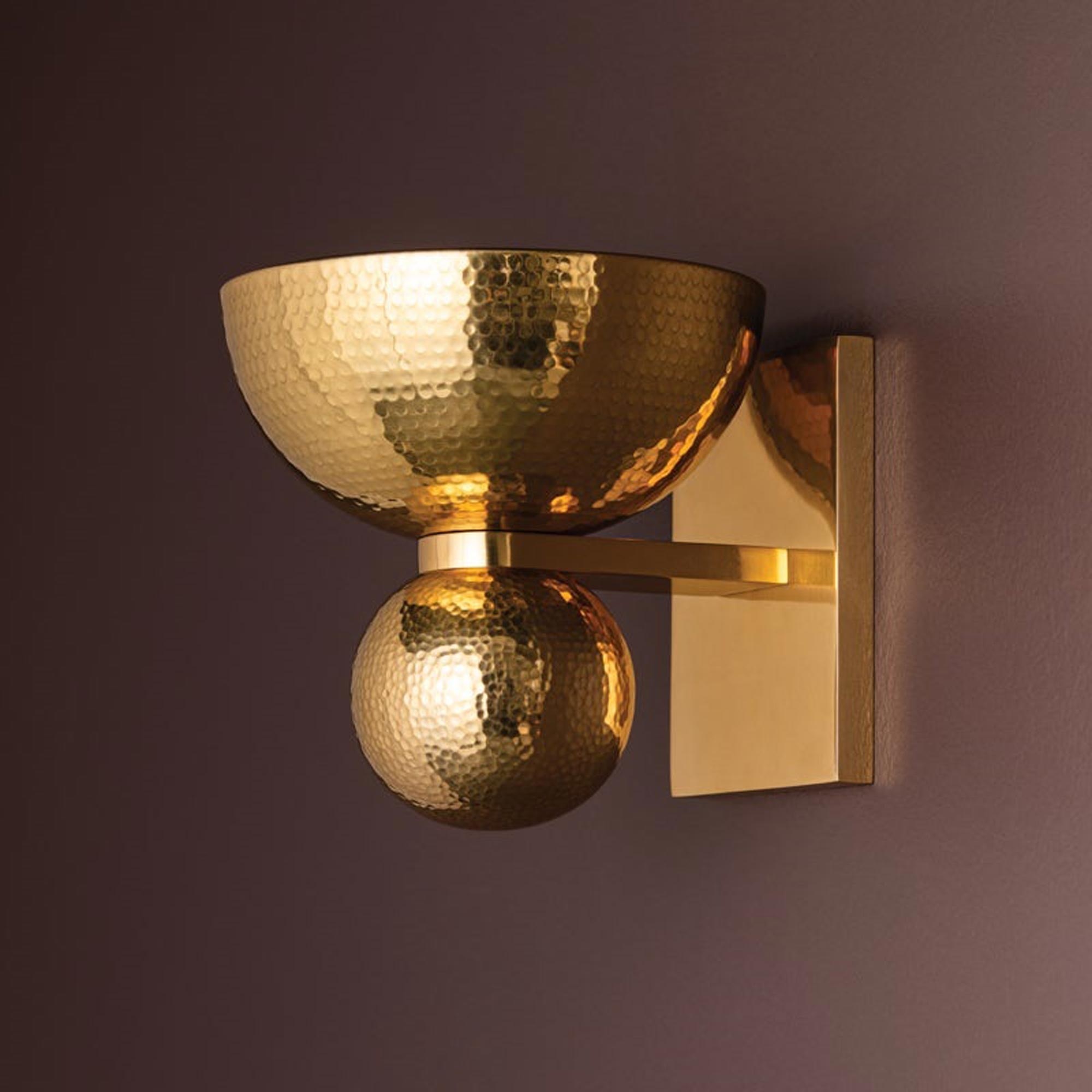 Infused with elegant nostalgia for a bygone era, the Catania Wall Light from Corbett Lighting is a jewel of a lighting fixture that's sure to elevate your home. It features a bowl-shaped shade casting upward illumination that's balanced with a decorative orb below. All in a vintage brass finish over subtle hammered texture that creates incredible character and refinement.