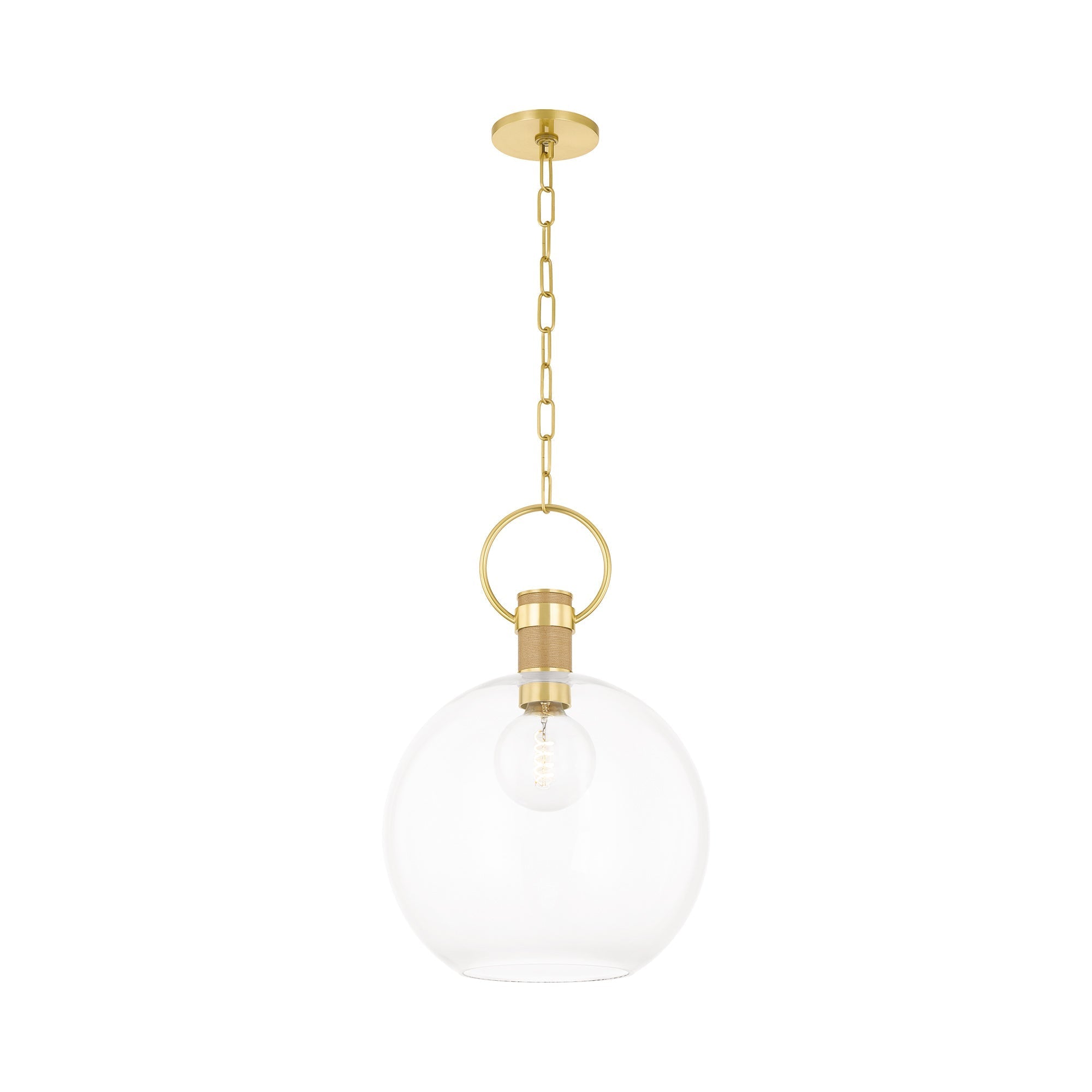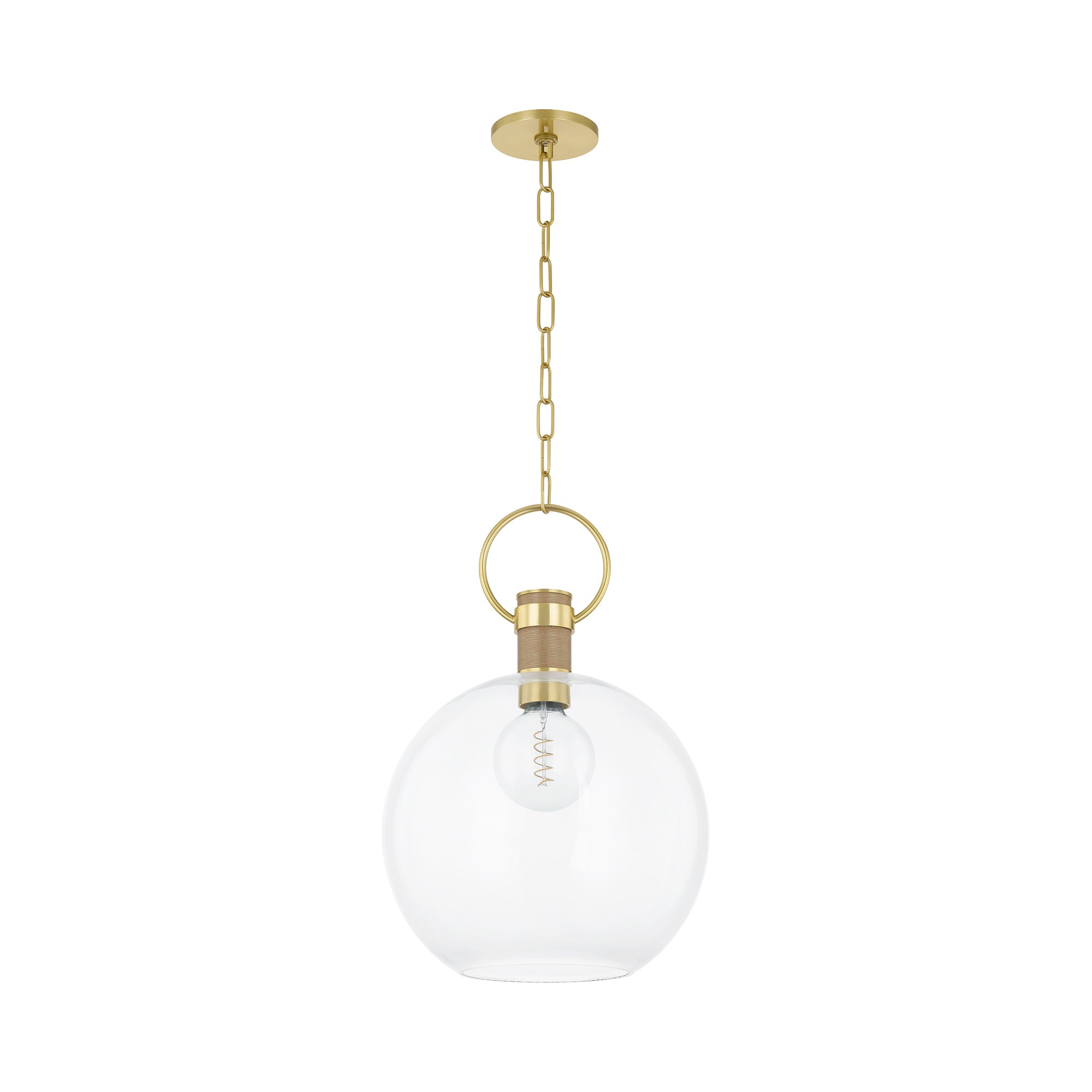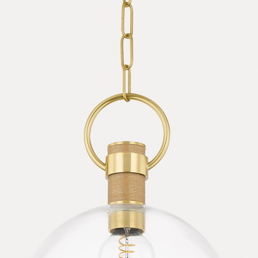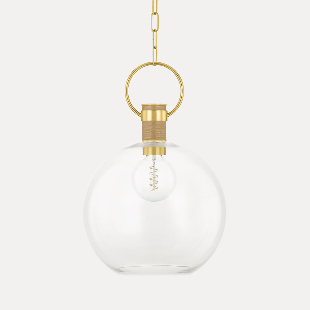 Straight from the proverbial jewel box comes the Catrine Pendant Light from Mitzi, an extraordinary light fixture emulating a romantic necklace. Clean shapes of circles and lines reflect in a clear glass orb and ring décor element, adding an artisan look to a pendant with aged brass metal and a grass cloth-wrapped cylinder ornament. Classic and alluring, this pendant is a superb option for kitchens, foyers, and living rooms.