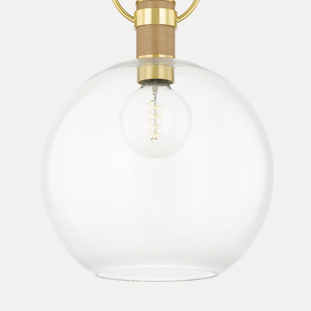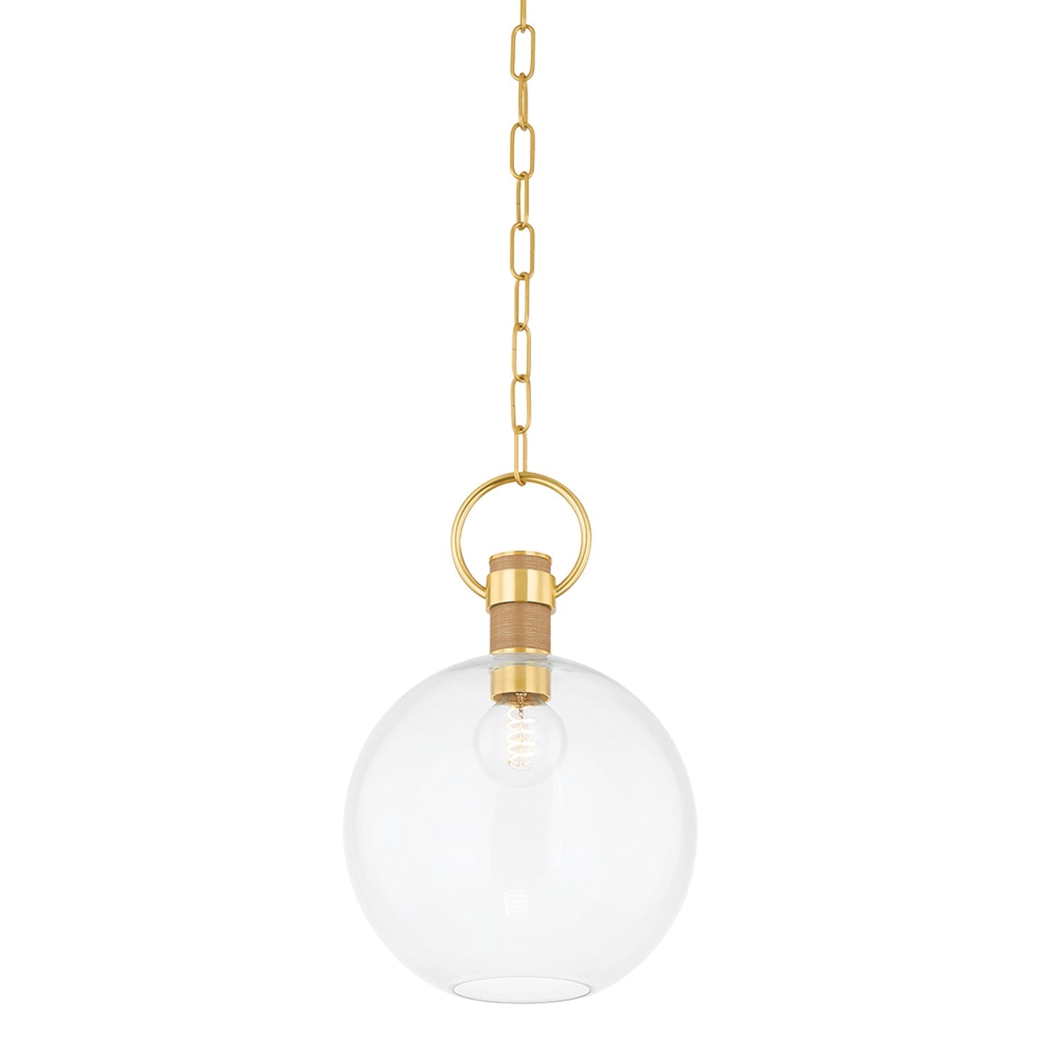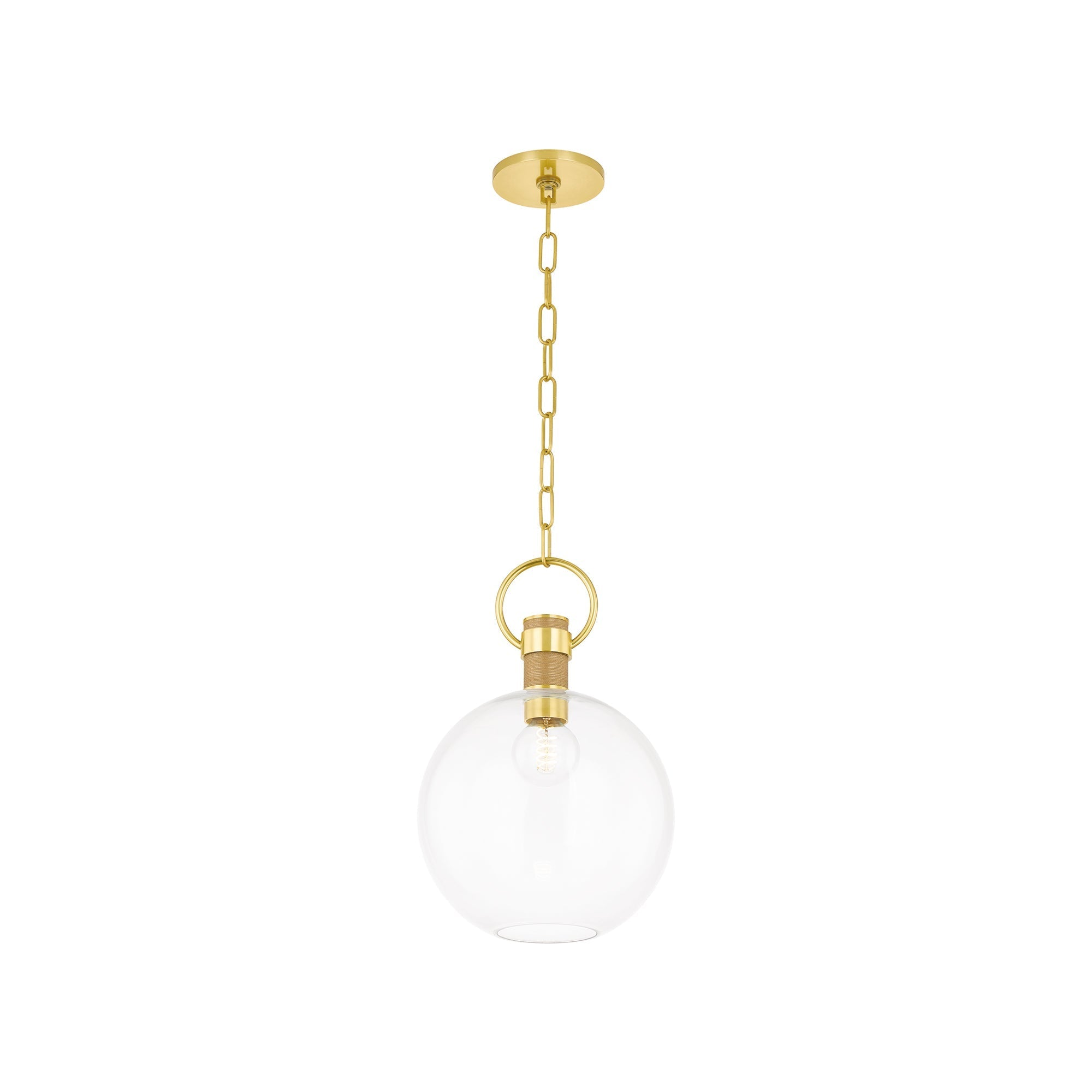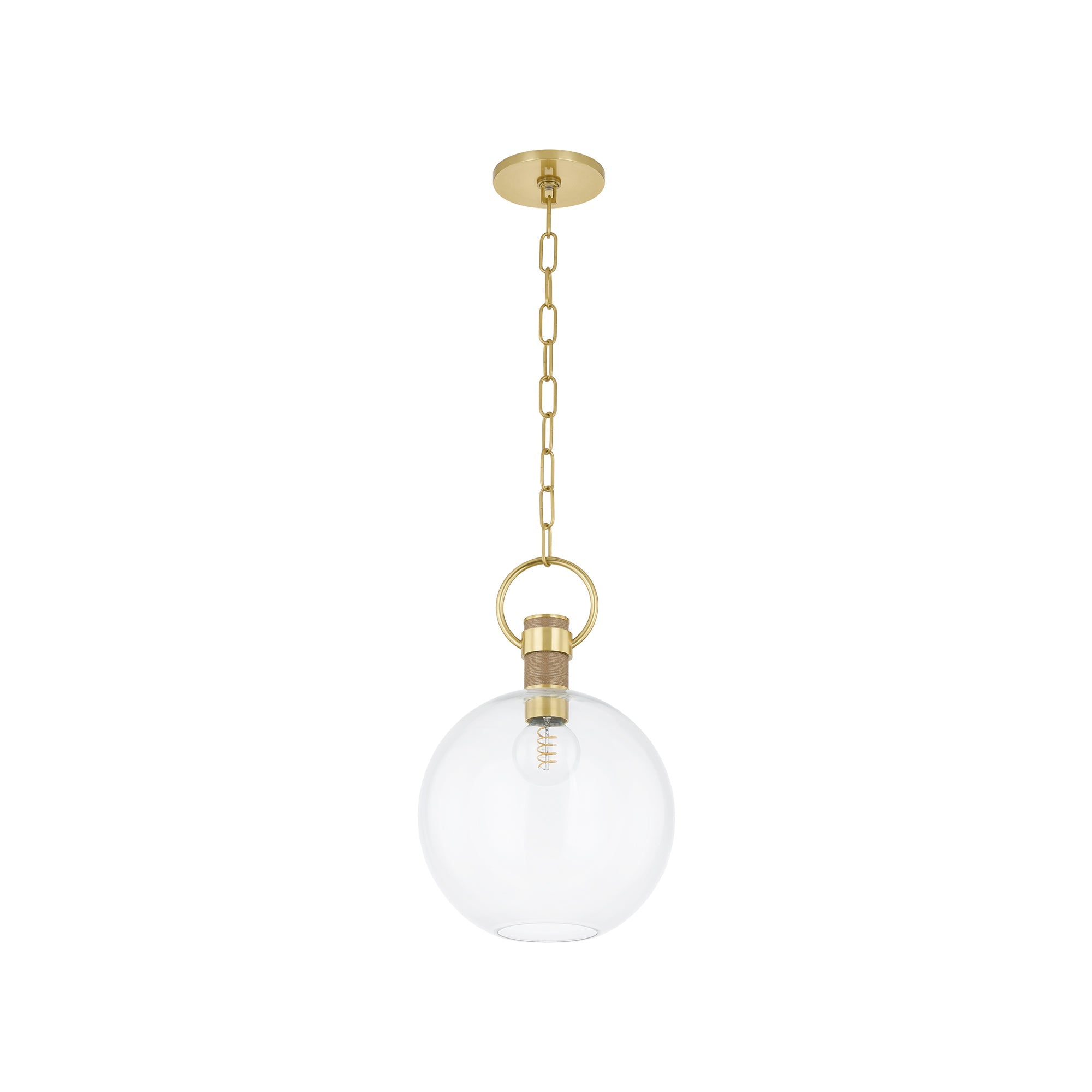 Straight from the proverbial jewel box comes the Catrine Pendant Light from Mitzi, an extraordinary light fixture emulating a romantic necklace. Clean shapes of circles and lines reflect in a clear glass orb and ring décor element, adding an artisan look to a pendant with aged brass metal and a grass cloth-wrapped cylinder ornament. Classic and alluring, this pendant is a superb option for kitchens, foyers, and living rooms.