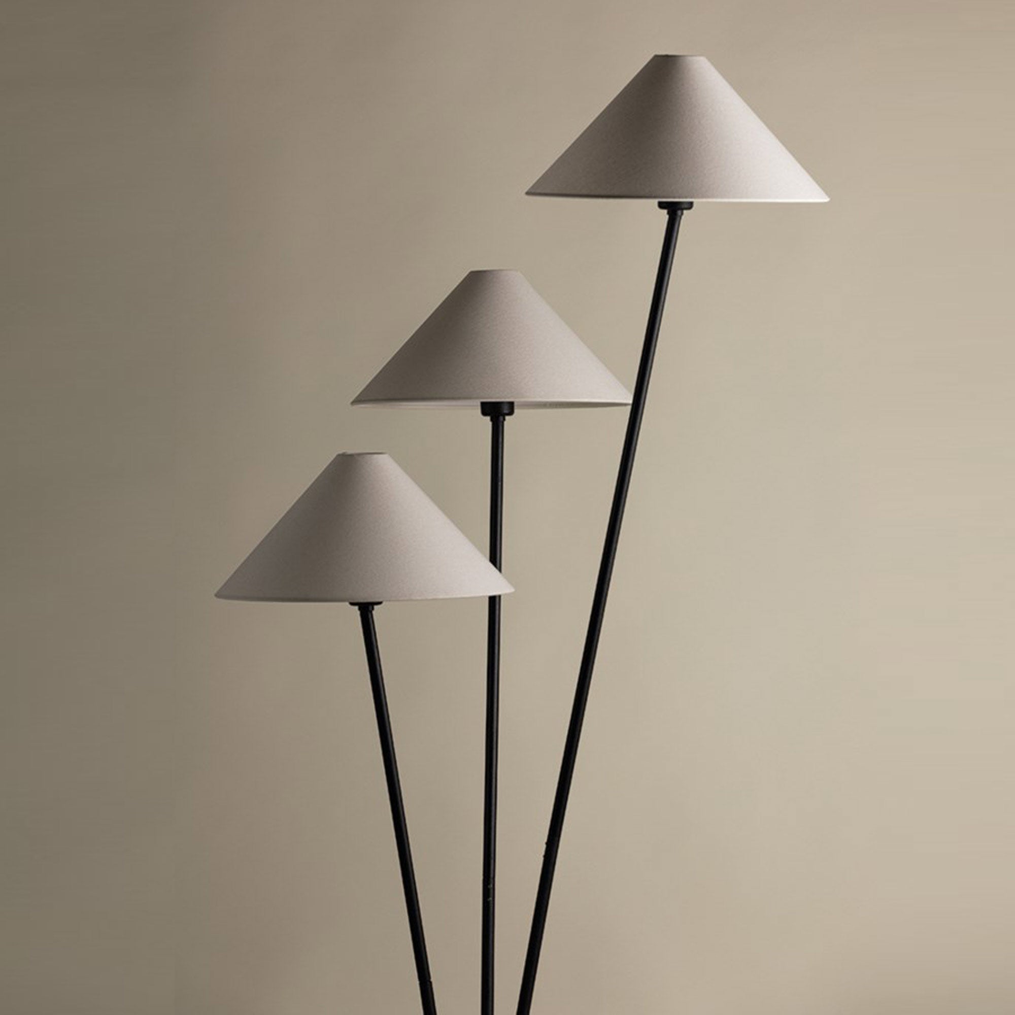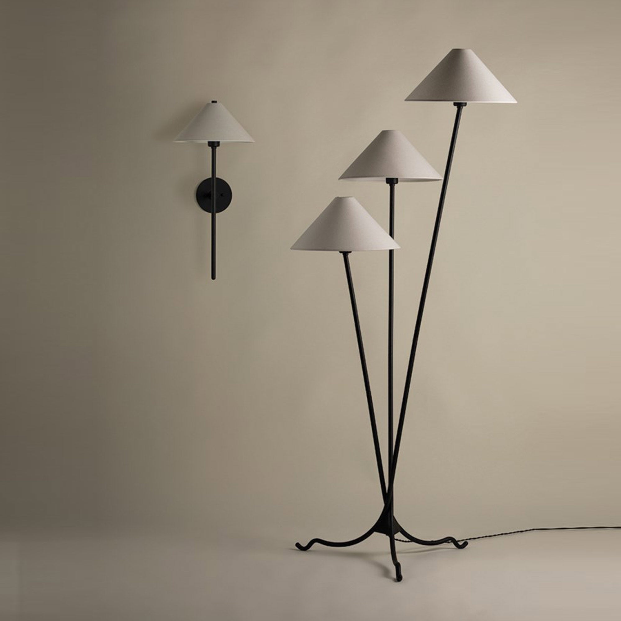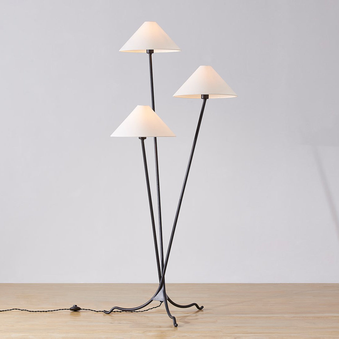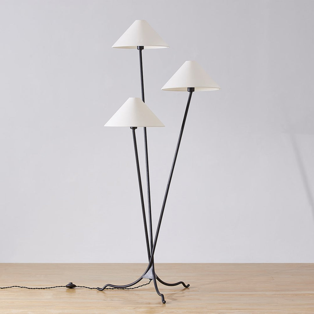 Fluidity in shape determines an extraordinary aesthetic in room illumination as the Cedar Floor Lamp from Troy Lighting delivers on silhouetting and style. Artistry softens an industrial vibe in a three-light lamp featuring forged iron arms and an extra shapely tripod base. Finishing off a custom design, festive off-white tapered shades create contrast and proportional perfection.