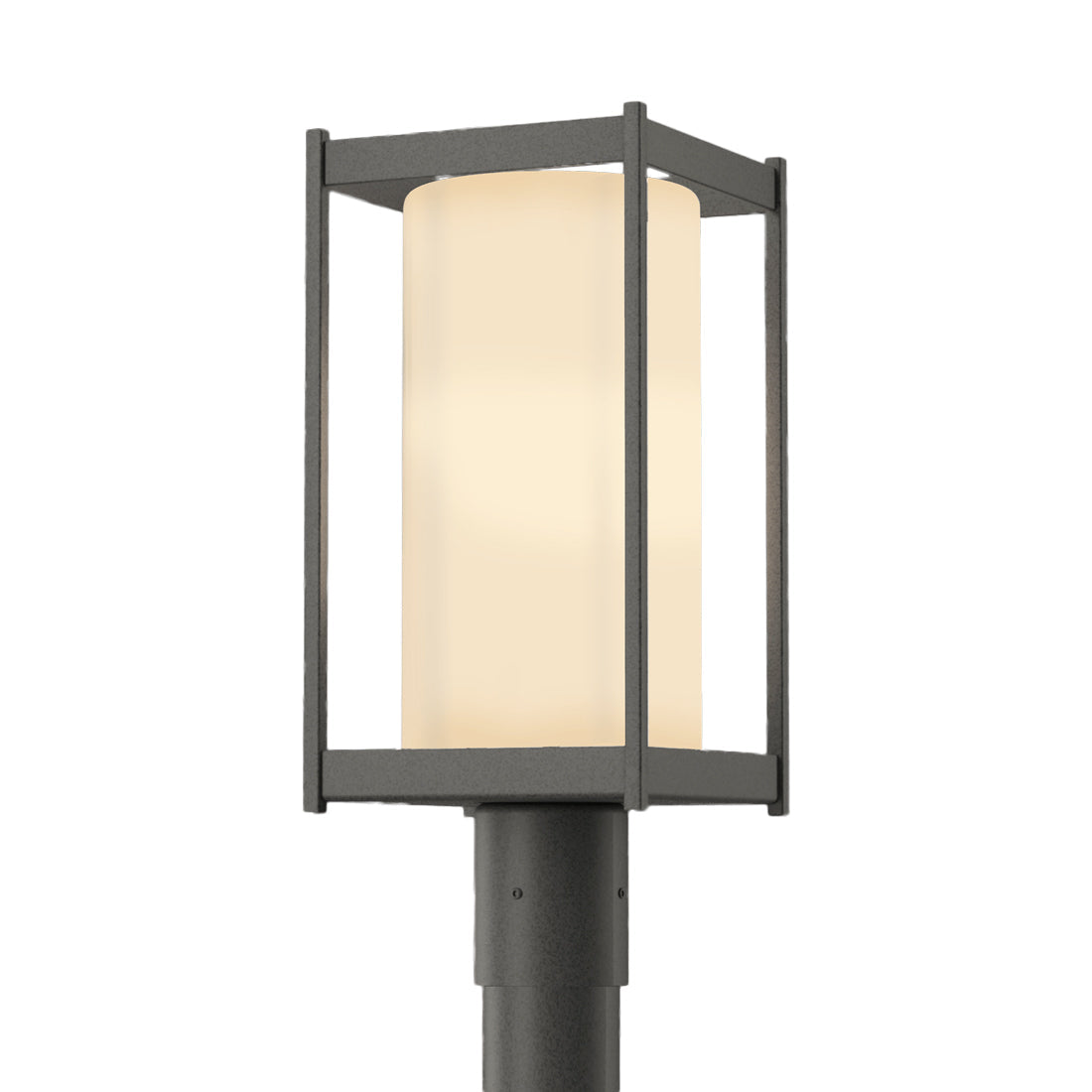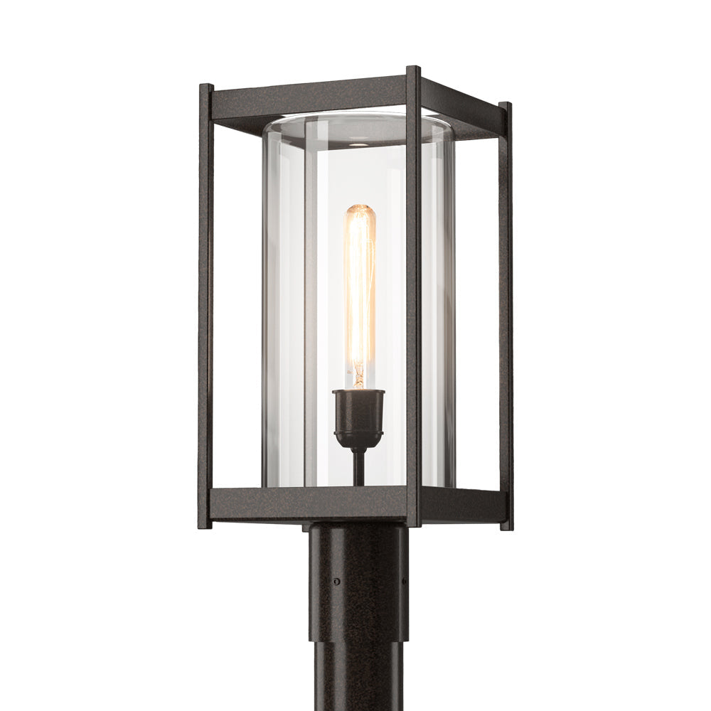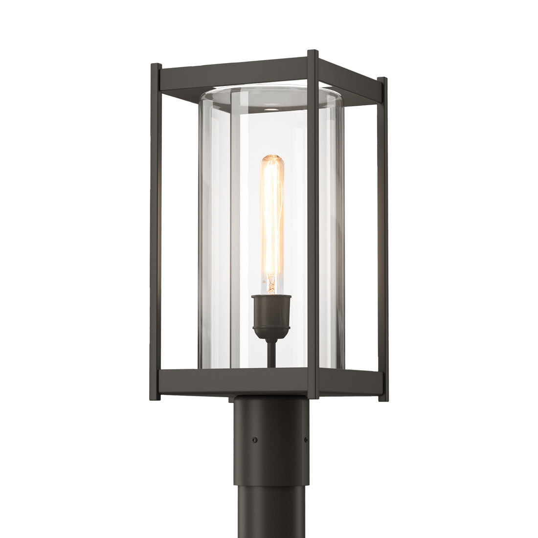 Geometry captures the motif of a classic lantern-style fixture with a suitable aesthetic to light up a yard space or walkway. The Cela Outdoor Post Light from Hubbardton Forge makes the most of metal framing with stylish add-ons as a cylinder inner shade and open frame create an artful impact.