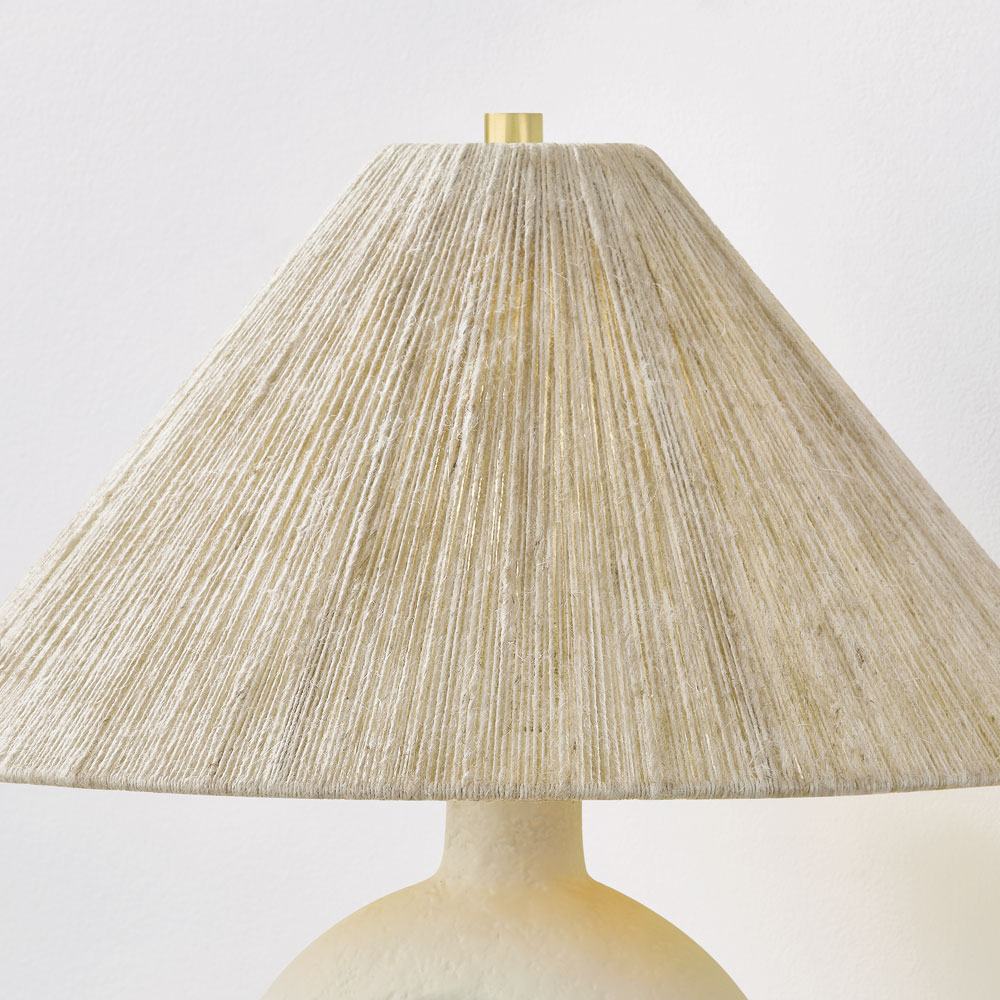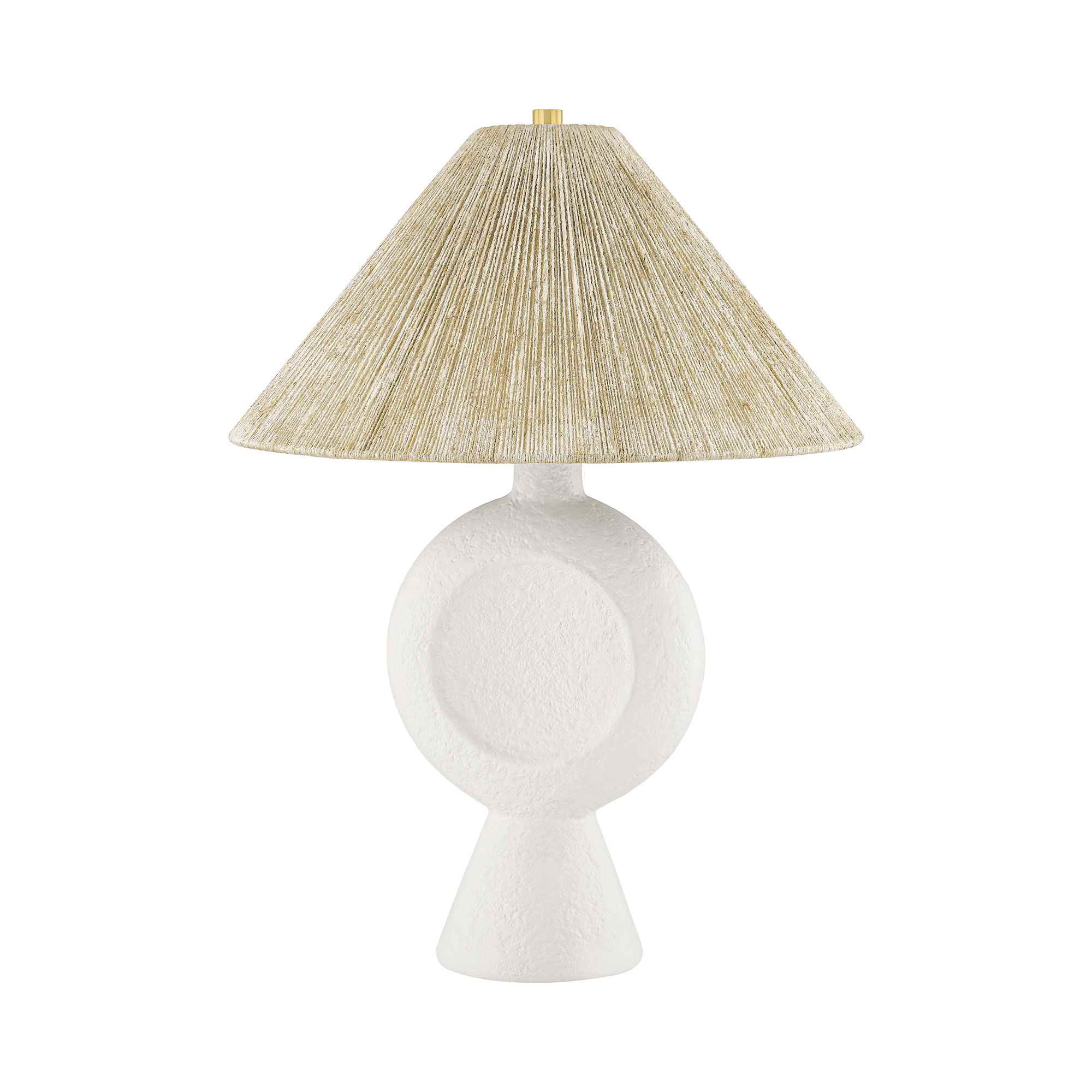 Dueling design schemes merge to create a new look in lighting as the Centella Table Lamp from Mitzi brings a slight coastal vibe to a casual setting. Texture is both actual and implied in a lamp with a shapely aged brass body coated in a white plaster finish, and a tasteful Empire shade made of natural woven materials. Pattern indents add a sculpted effect with dimensionality.