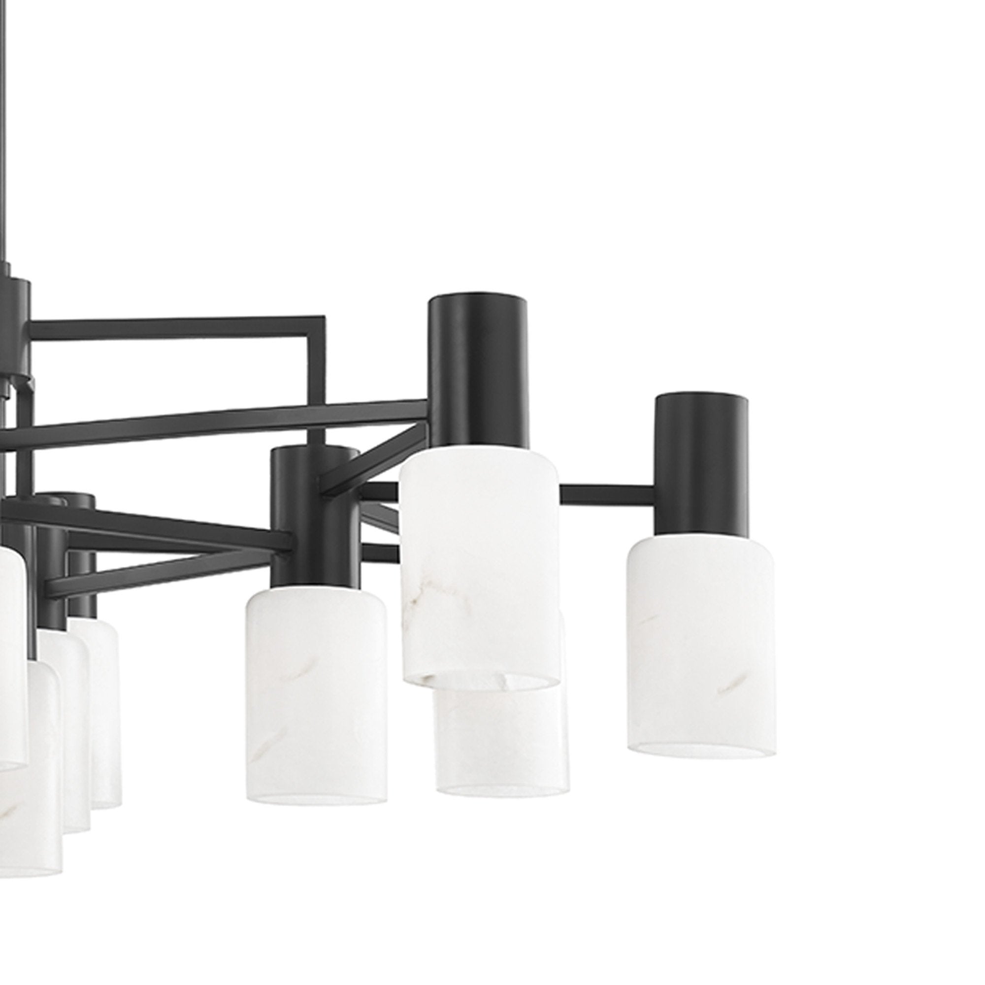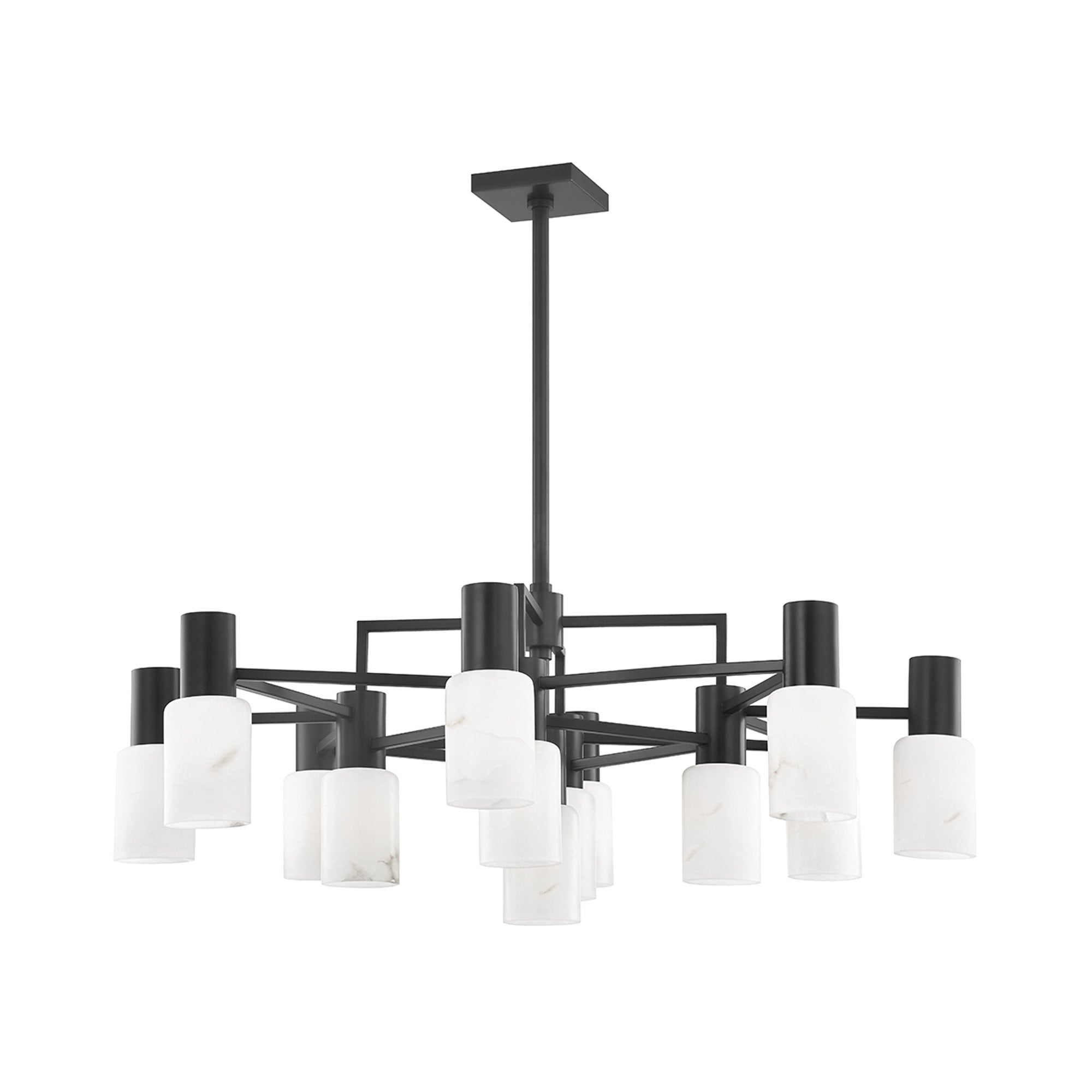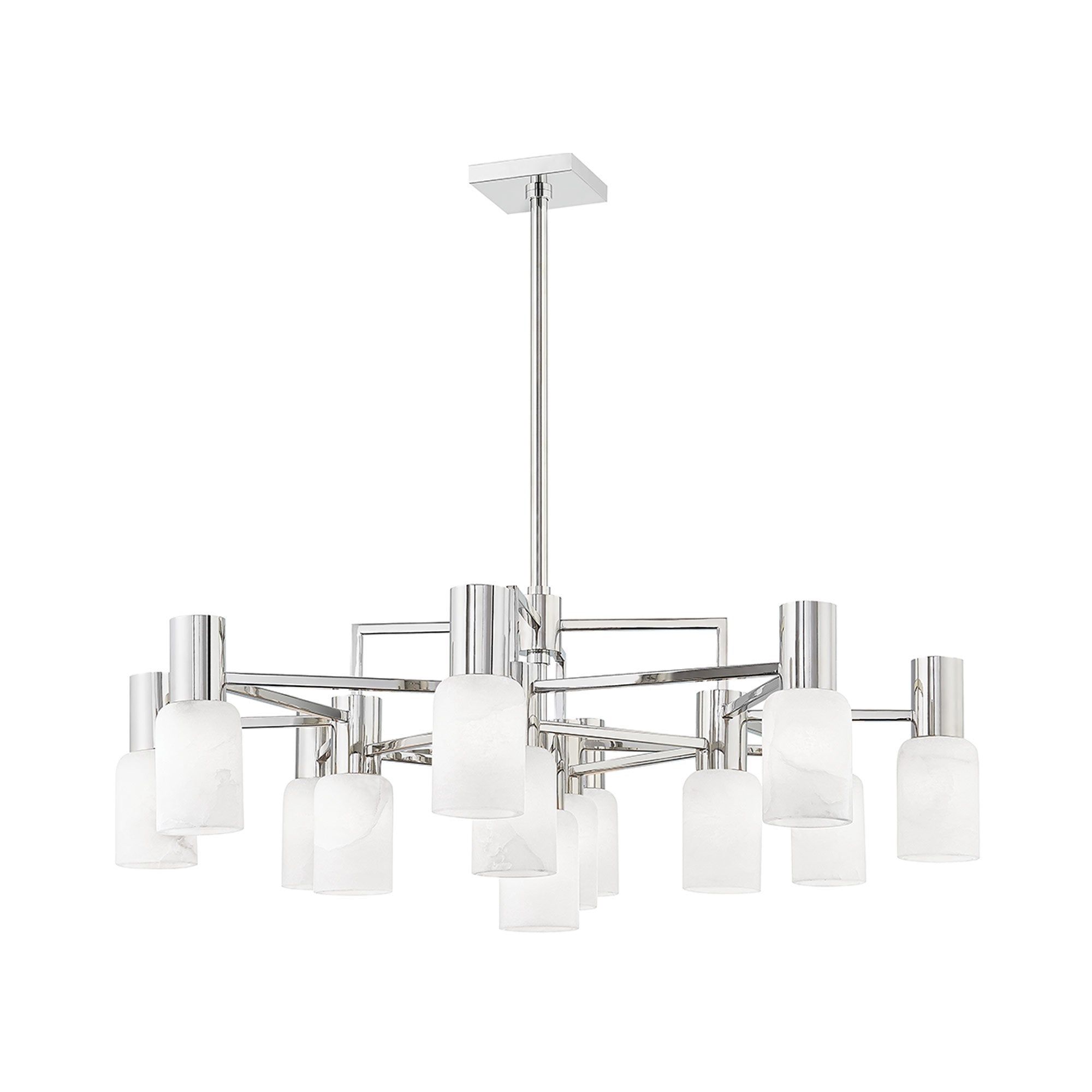 Chic alabaster shades and a geometric silhouette combine to create a sophisticated look for the Centerport Chandelier from Hudson Valley Lighting.
