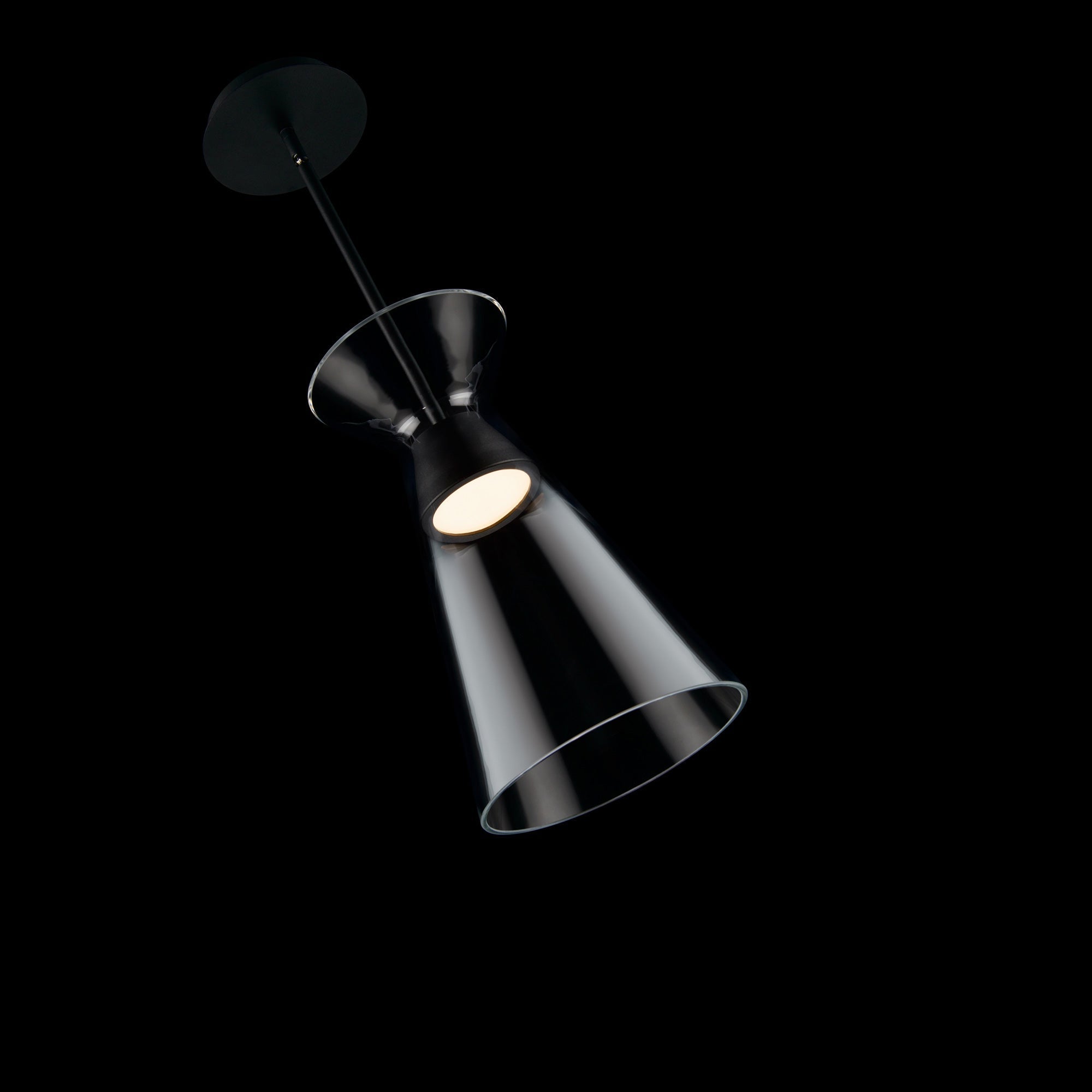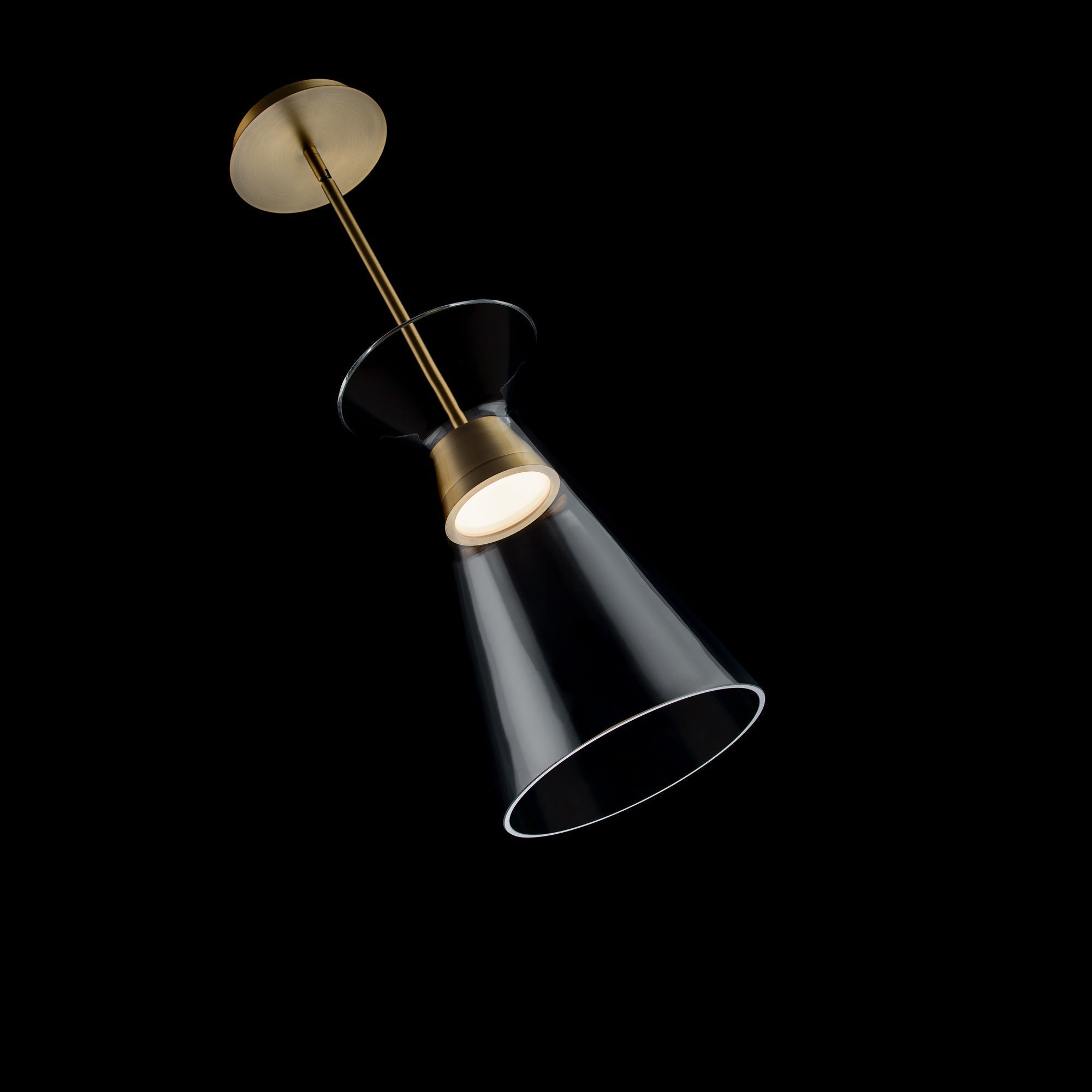 This conical pendant feature a slim minimalist body with a clear tapered thick wall and an aged brass or black downlight. Create a lovely design statement by grouping in a row over a kitchen island, counter, dining table or bar.