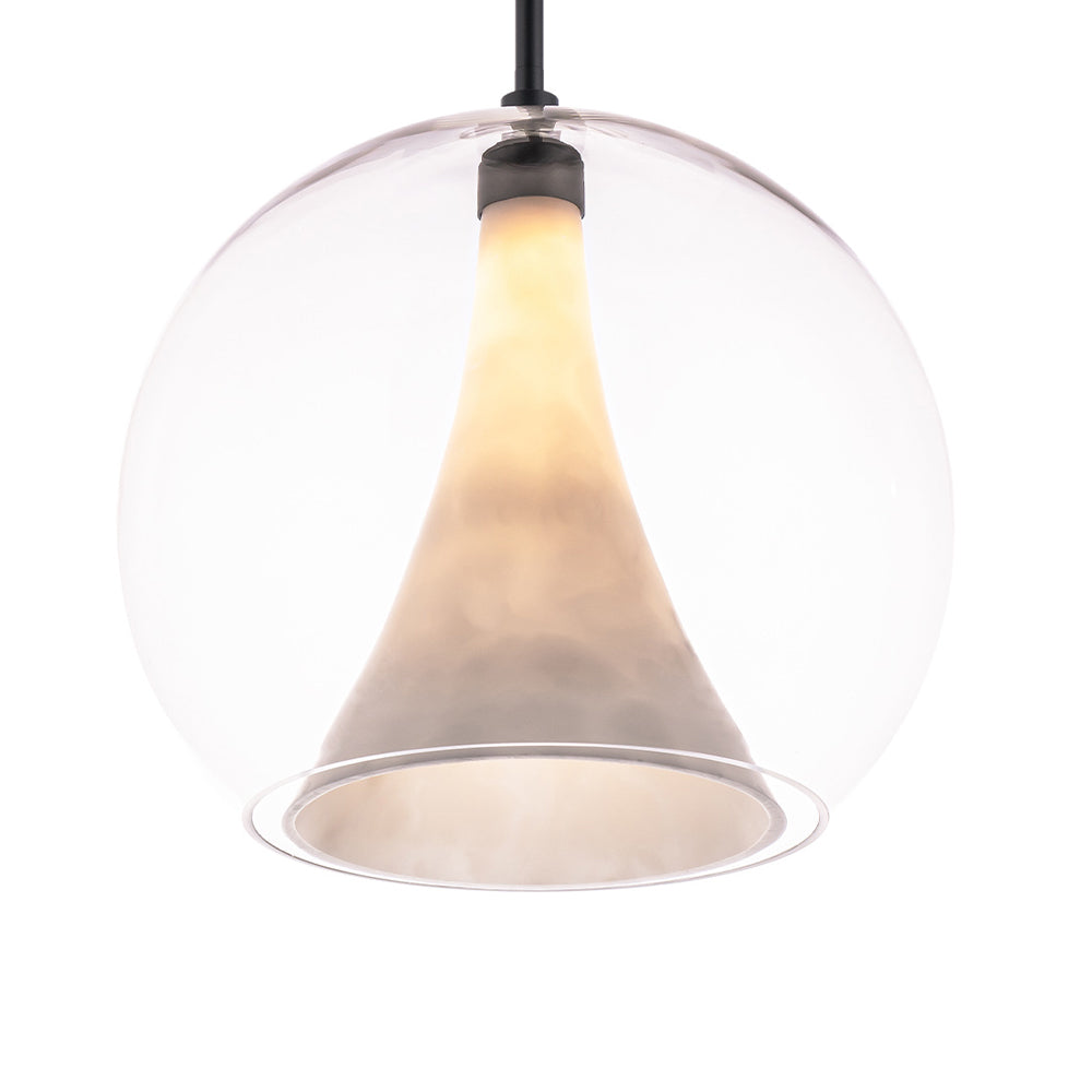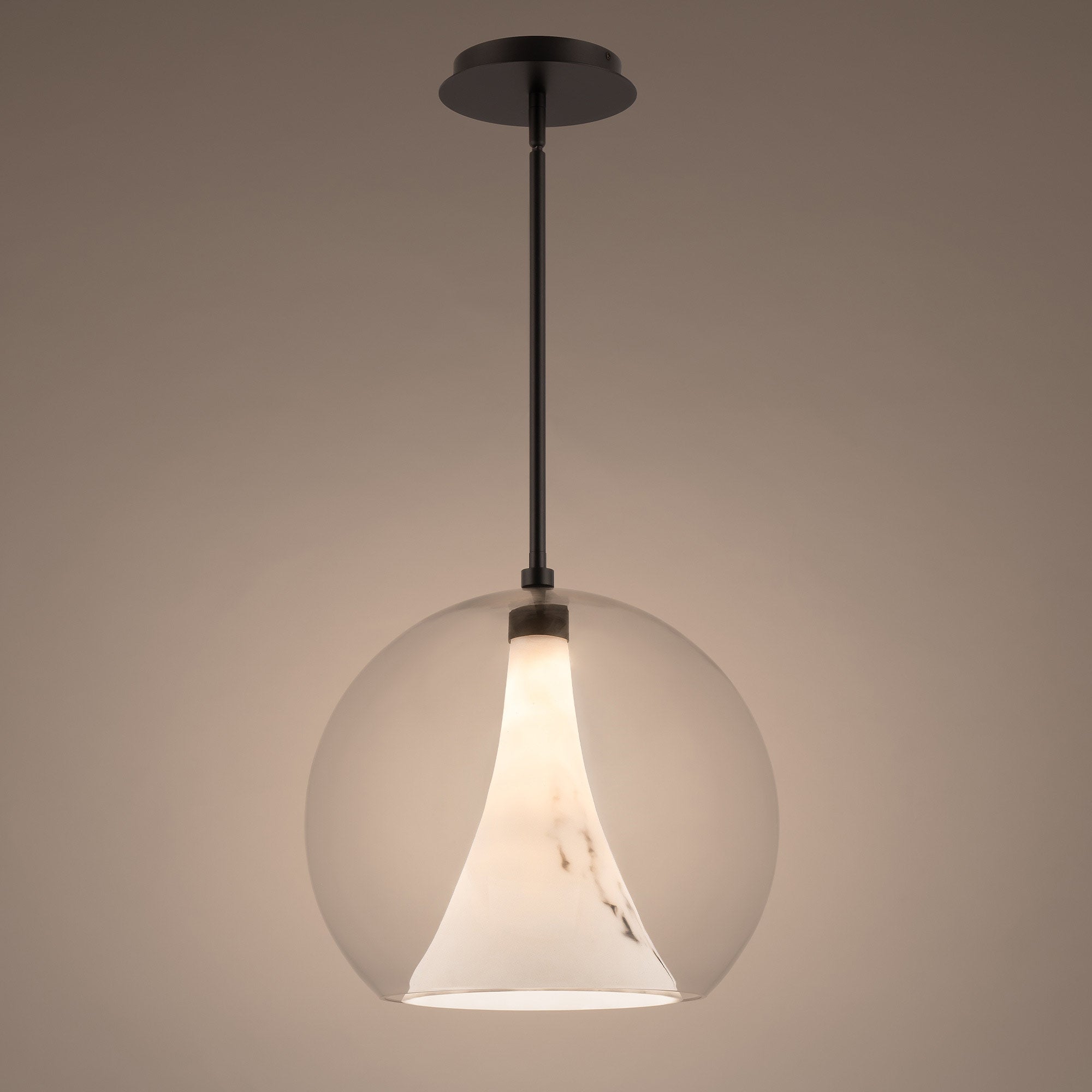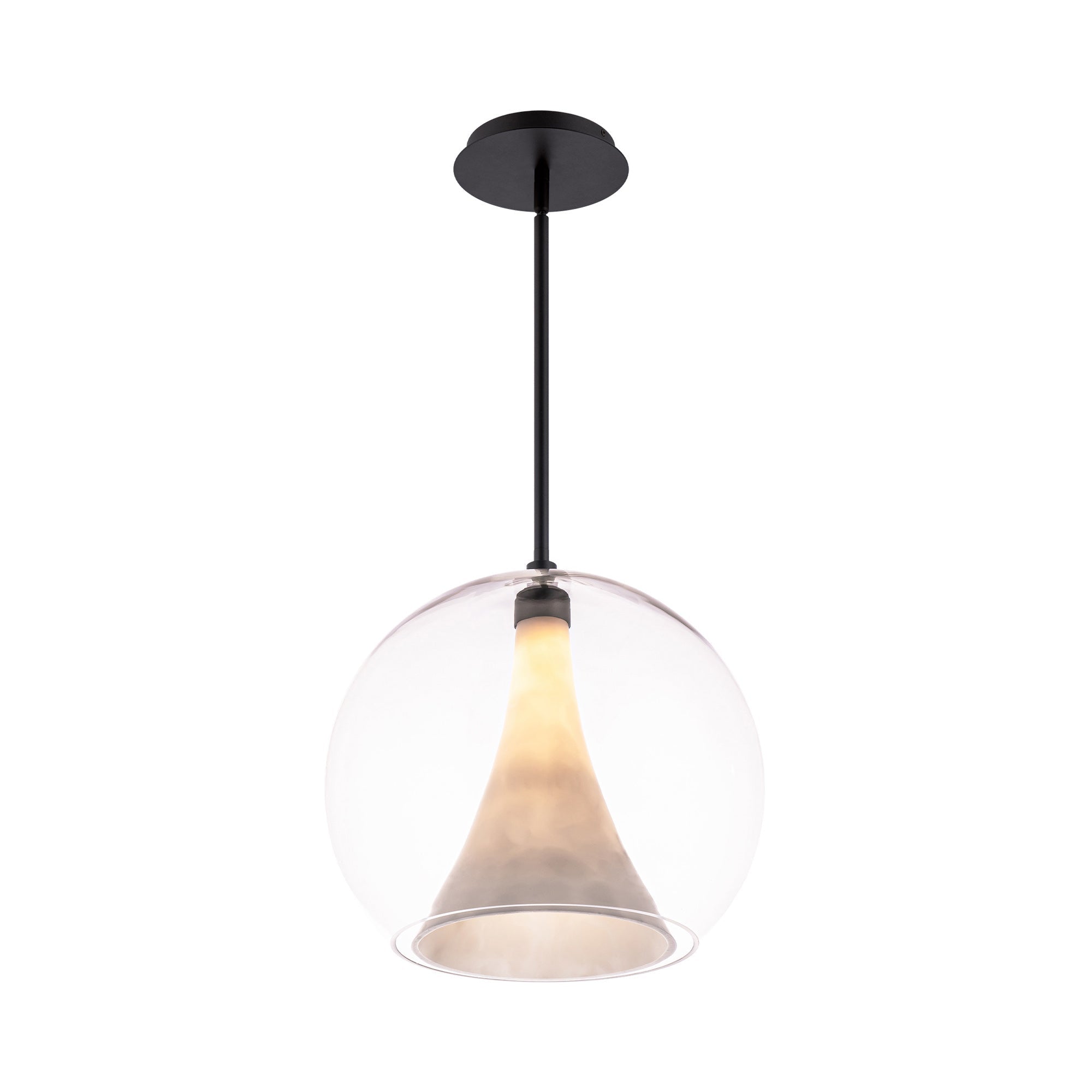 Indulgent artisanal flavor offers intrigue and optical elegance in this light fixture suited to both modern and transitional settings. The Chantilly LED Pendant Light from dweLED fashions a standalone design element that becomes a focal point in a kitchen space, living area, or foyer. An exquisite faux alabaster interior and clear glass exterior offers contrasting style to black finish metal framing, creating an earth-inspired aesthetic with the bonus of energy-efficient ambient lighting.