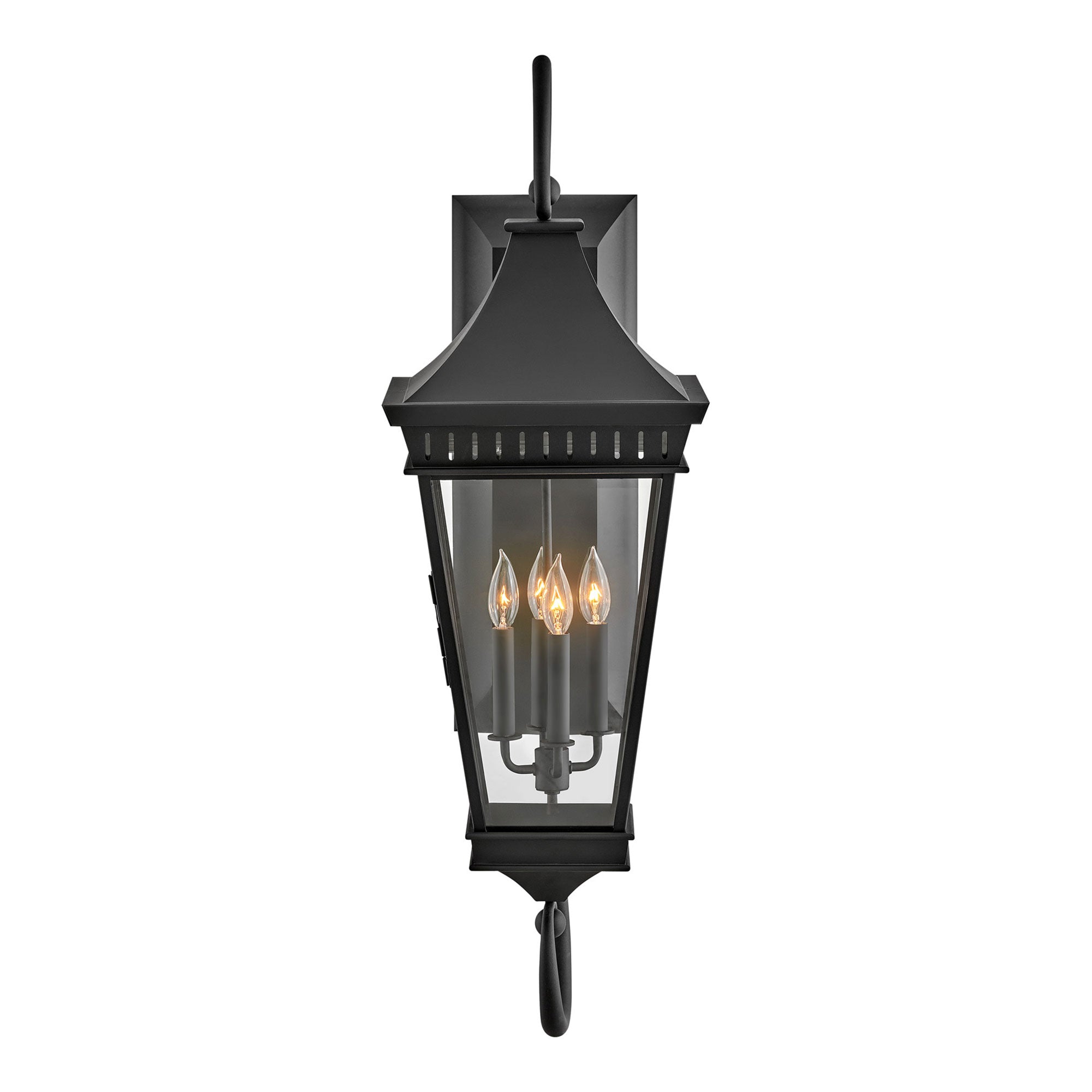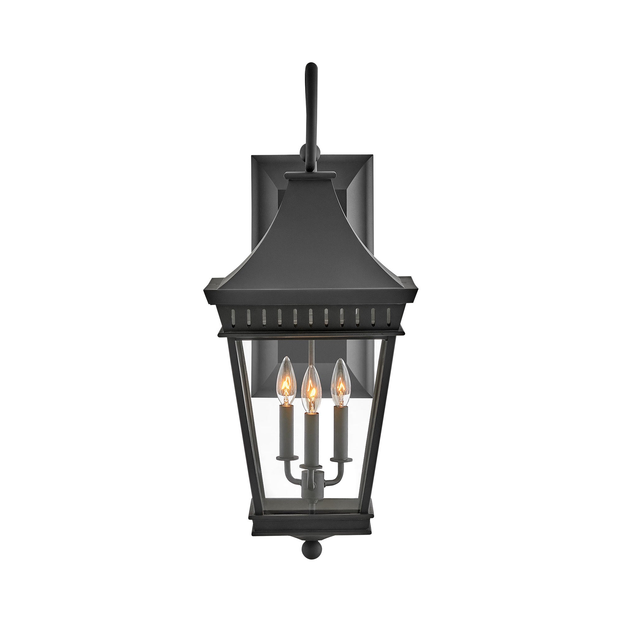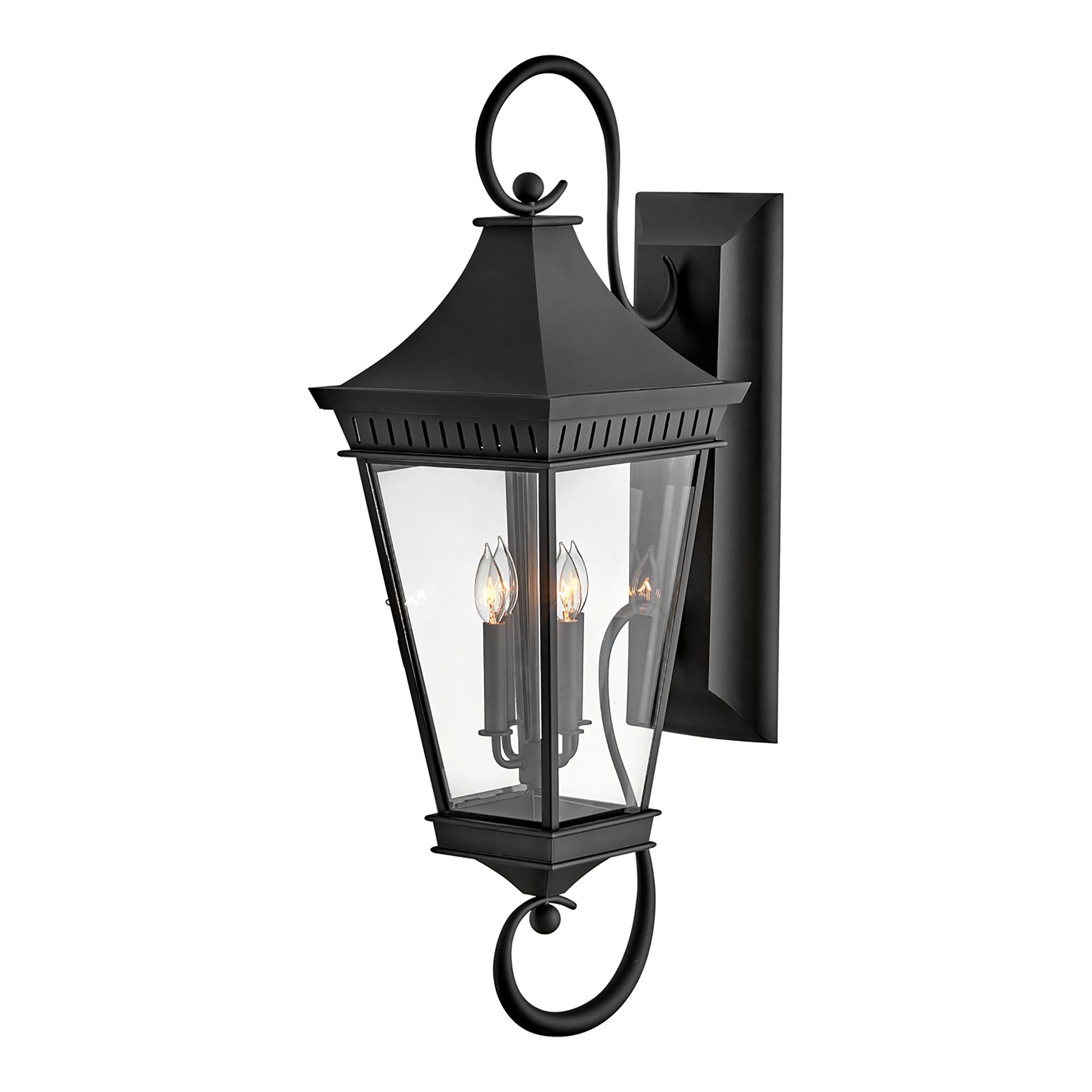 Carriage house charm infuses the Chapel Hill Outdoor Wall Light from Hinkley with compelling artistry. A distinctive addition, it shows off a decorative scroll arm and classic lantern silhouette, augmented with clear glass and a crisp museum black finish to complement a wide range of exterior design aesthetics.