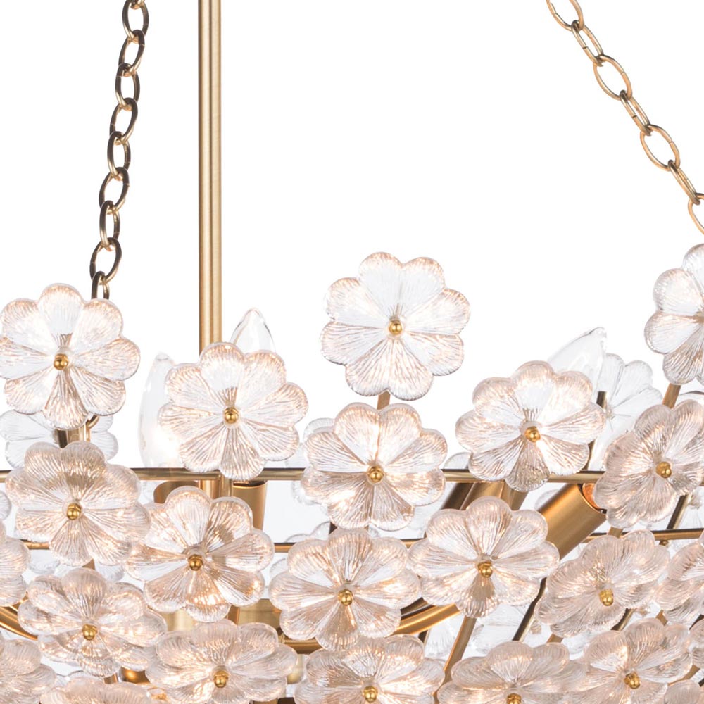 Indulge in a love of botanicals as they weave their way into a charming light fixture. The Charlotte Chandelier from Regina Andrew plays host to delicate cast glass floral petals collecting around a bowl-shaped metal frame, with chains adding substantial suspension. Make this light a go-to choice for showcasing the organic beauty of nature.