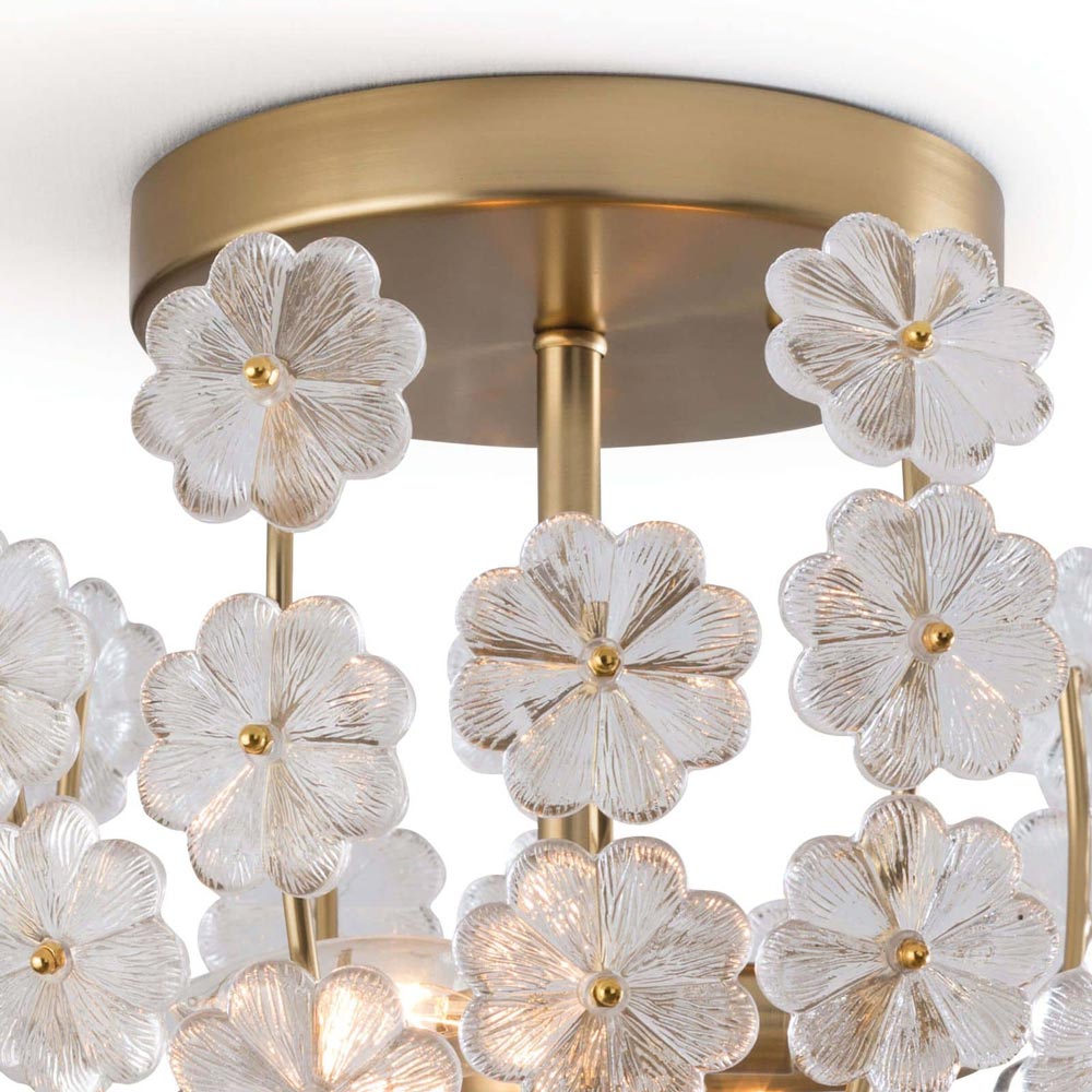 Delicate petals fashioned of cast glass deliver floral splendor to the Charlotte Semi-Flush Mount Ceiling Light from Regina Andrew. Engaging botanical vibes prove artisanal elegance in a fixture framed in rich natural brass metal. Light reflects with intriguing effects, illuminating a glam-inspired kitchen, foyer, or dining space.