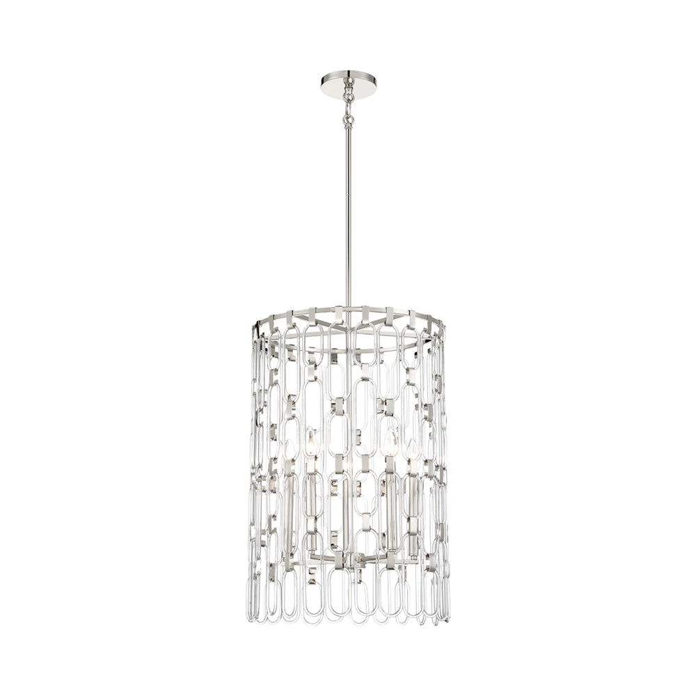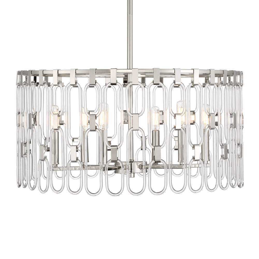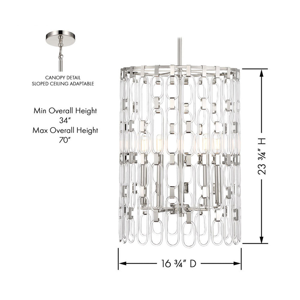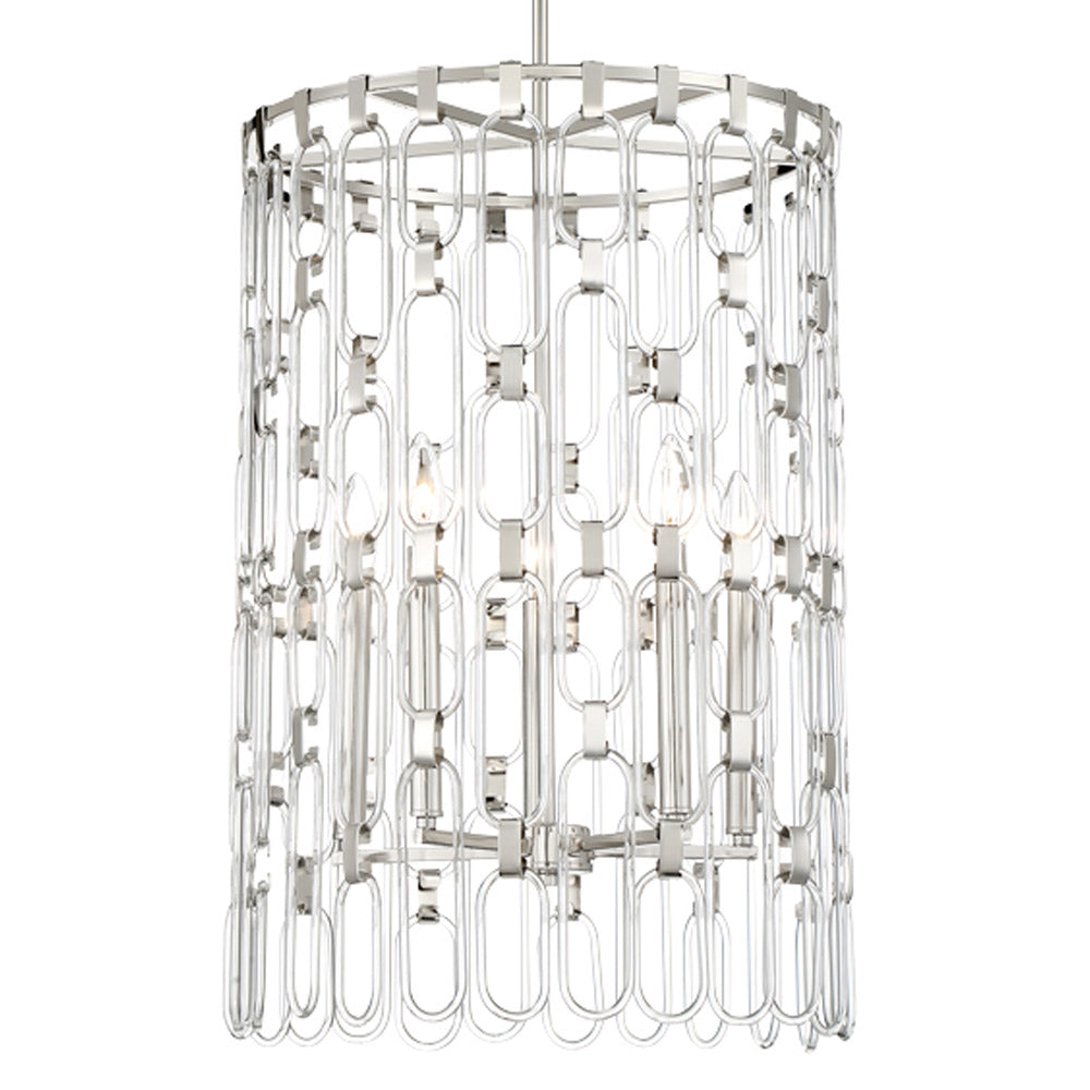 The Charming Pendant Light from George Kovacs plays with a slightly industrial influence and festive open design, perfect for a foyer, dining ensemble, or living area. Chrome finish metal framing and delightful open metal oval links create a stylish look and a great backdrop for reflecting ambient lighting.