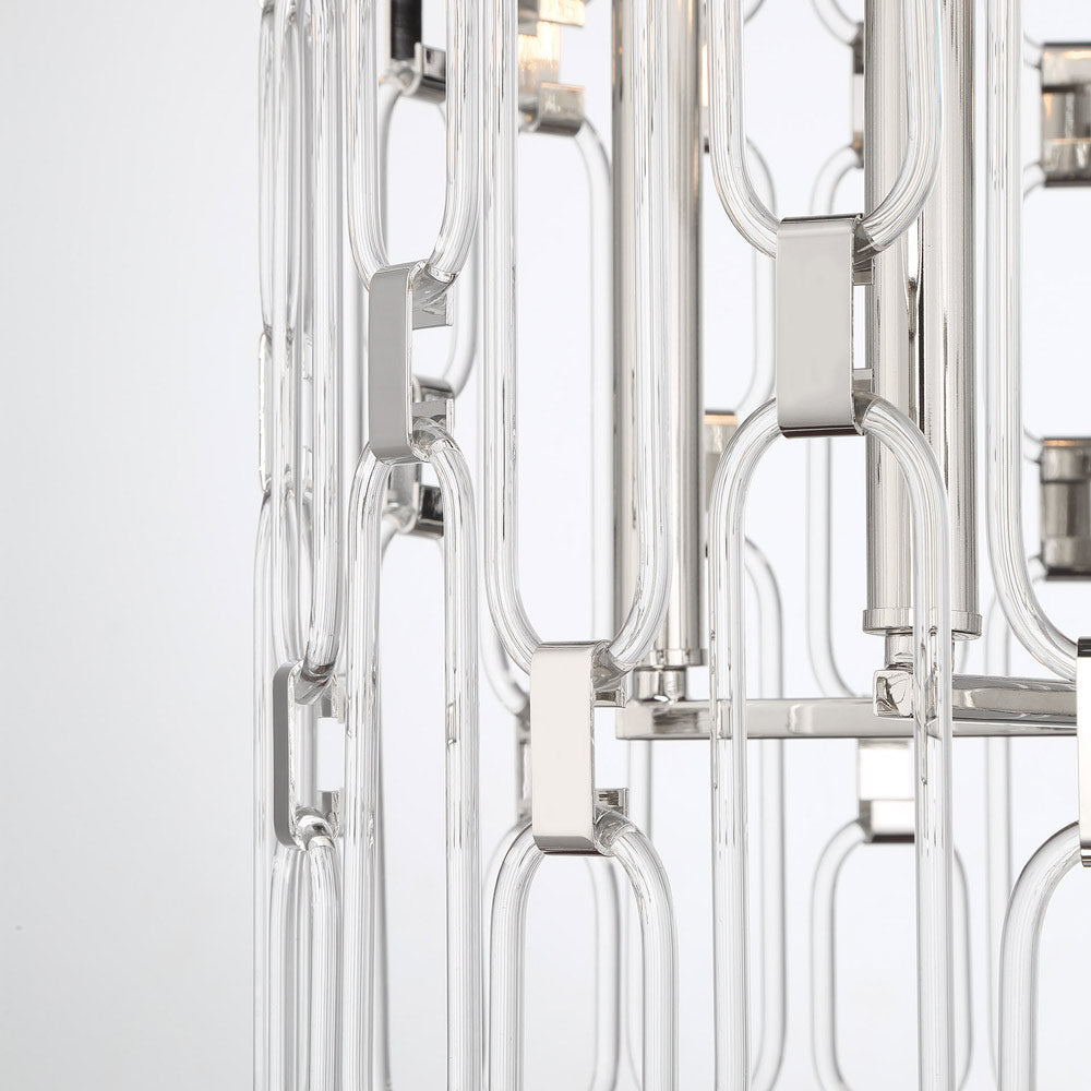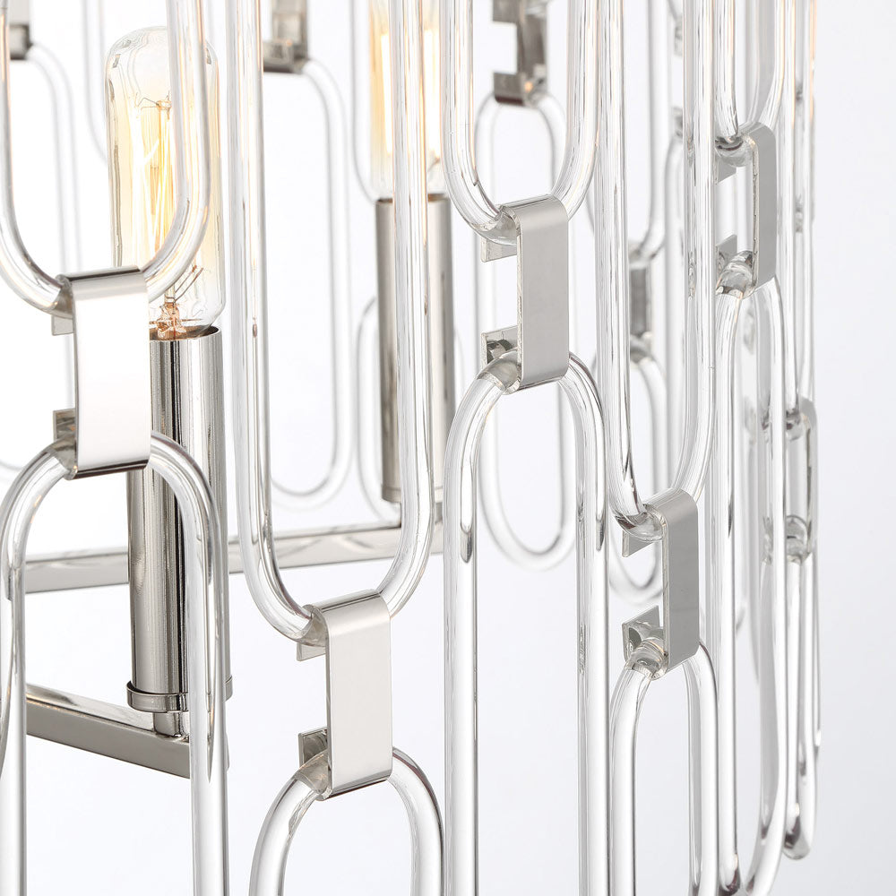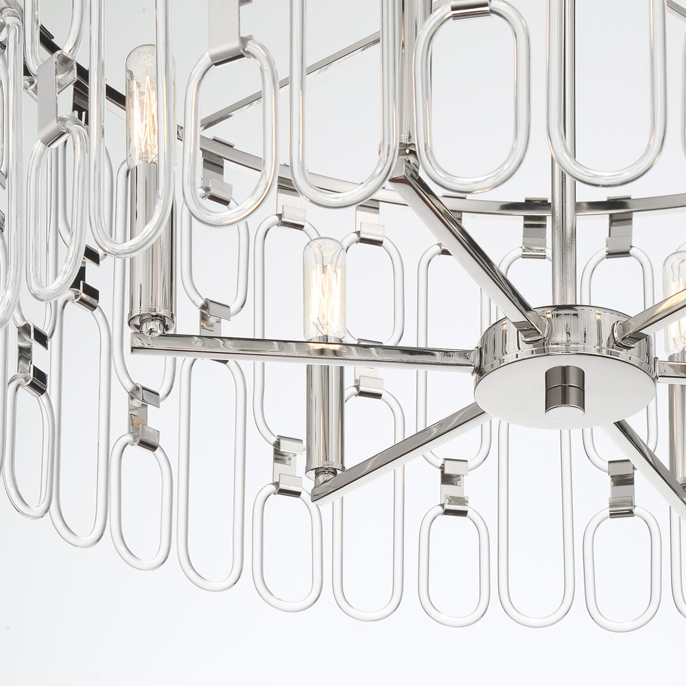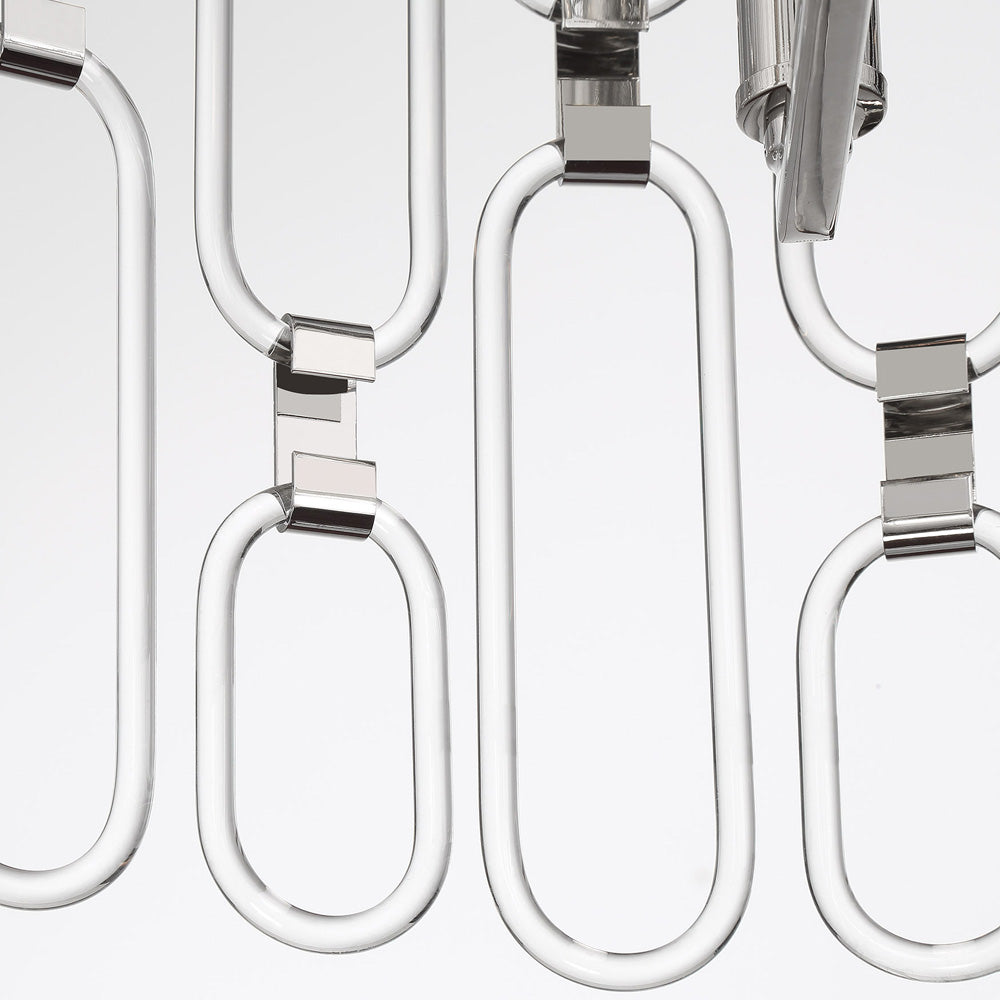 The Charming Pendant Light from George Kovacs plays with a slightly industrial influence and festive open design, perfect for a foyer, dining ensemble, or living area. Chrome finish metal framing and delightful open metal oval links create a stylish look and a great backdrop for reflecting ambient lighting.