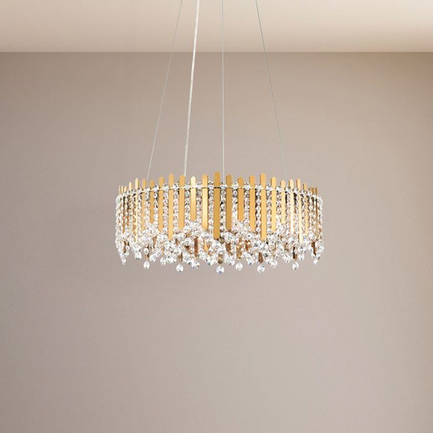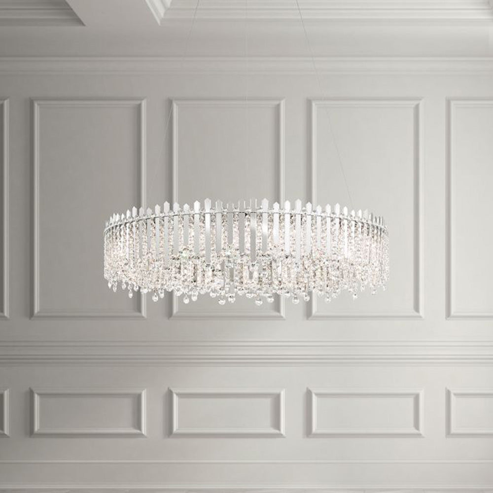 Slim metallic fencing surrounds the Chatter Round Pendant Light from Schonbek in a sophisticated, refined manner, set off by sparkling faceted crystal prisms that lend a glamorous expression to a space. Luxurious elements combine as this breathtaking drum pendant light transforms contemporary interiors into a spectacularly charismatic environment.