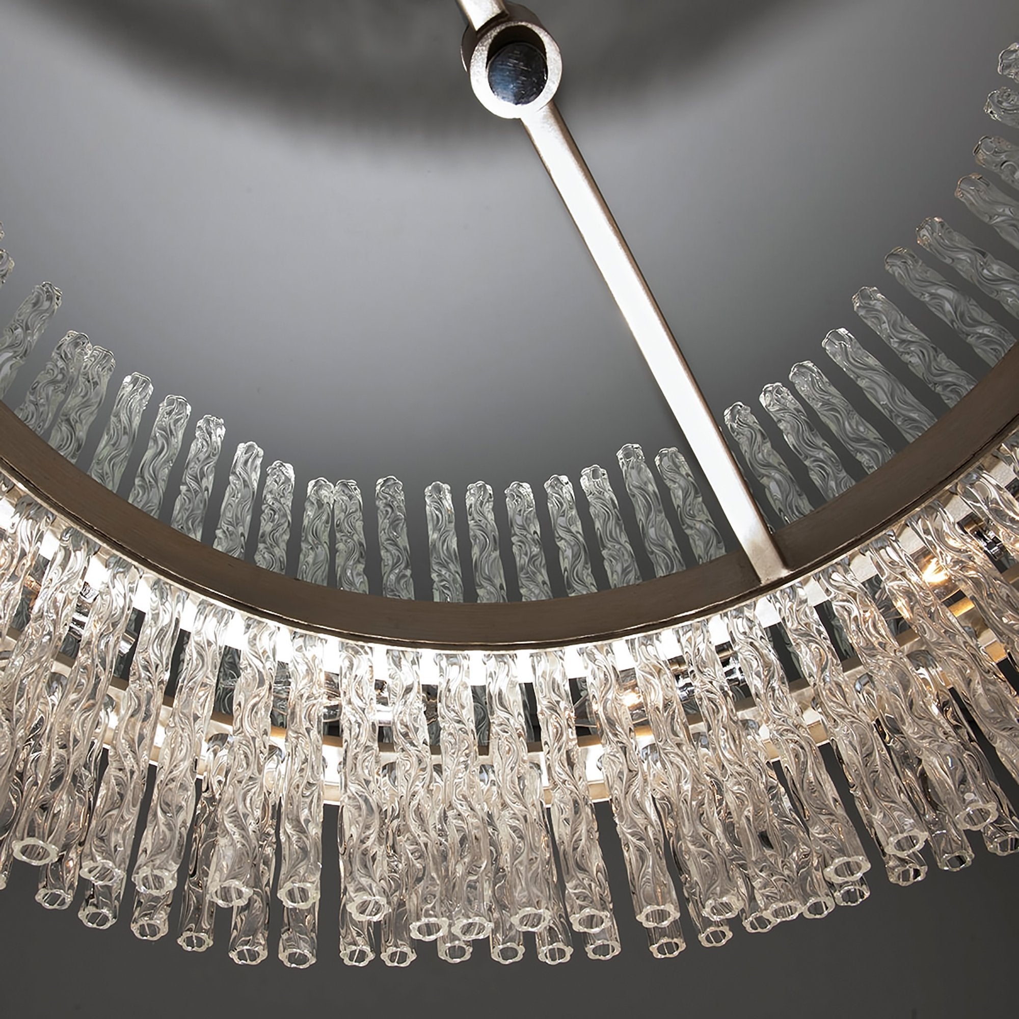 The Chime Pendant Light from Corbett Lighting invokes a glam motif and a structured silhouette gathering tubular glass rods banded with silver leaf polished stainless steel, adding sophistication to an upscale dining or living space.