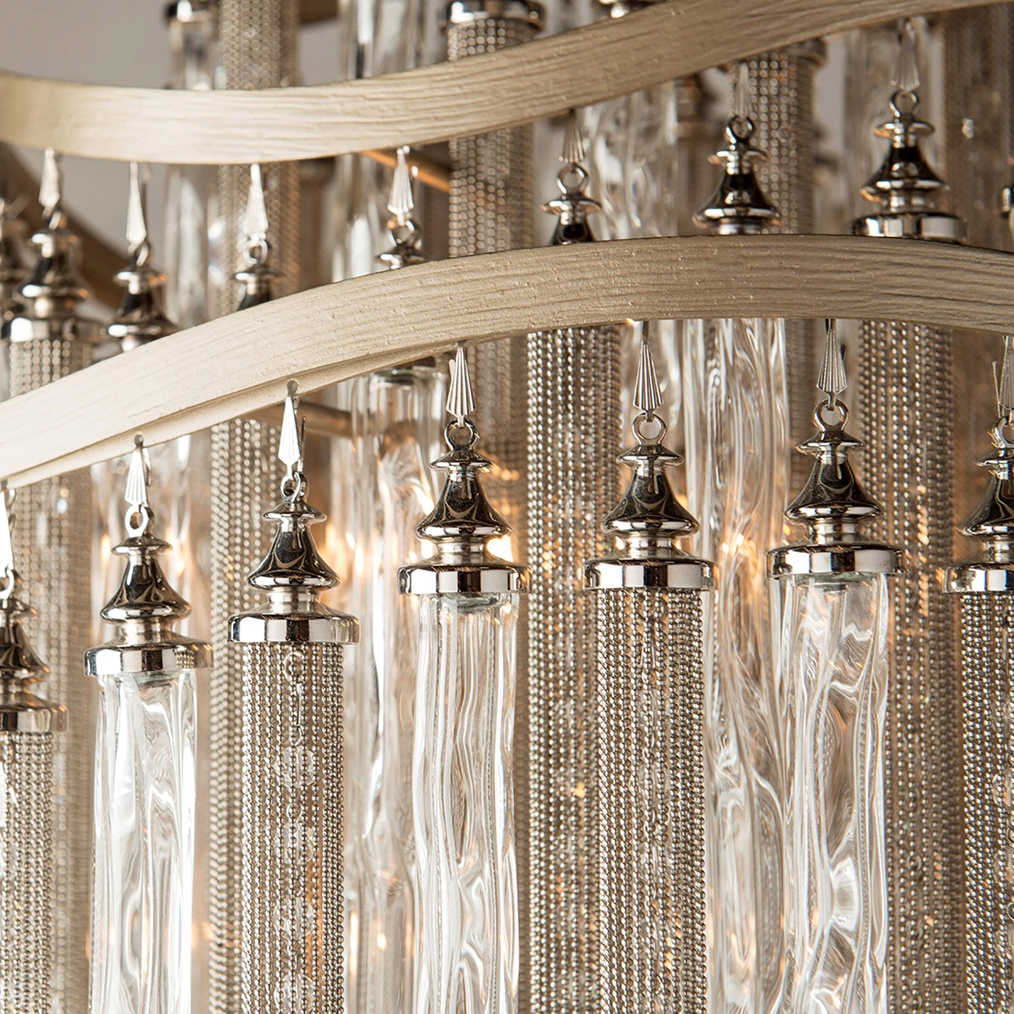 With a blend of vintage glam and traditional elegance, the Chimera Pendant Light from Corbett Lighting dazzles with a fluid silhouette made of silver leaf finish metal in a ribbon band with cascading clear tubular glass and nickel and crystal tassels suspended in a gradient formation.