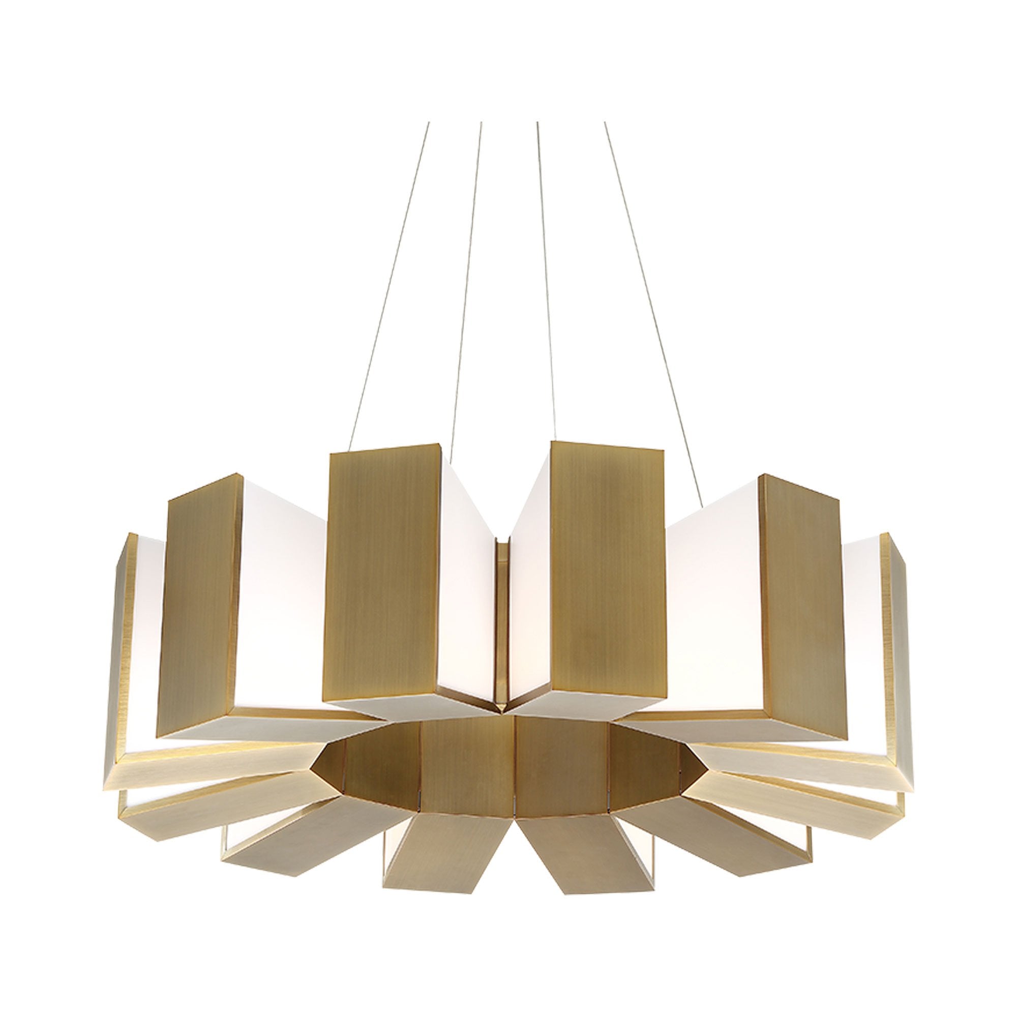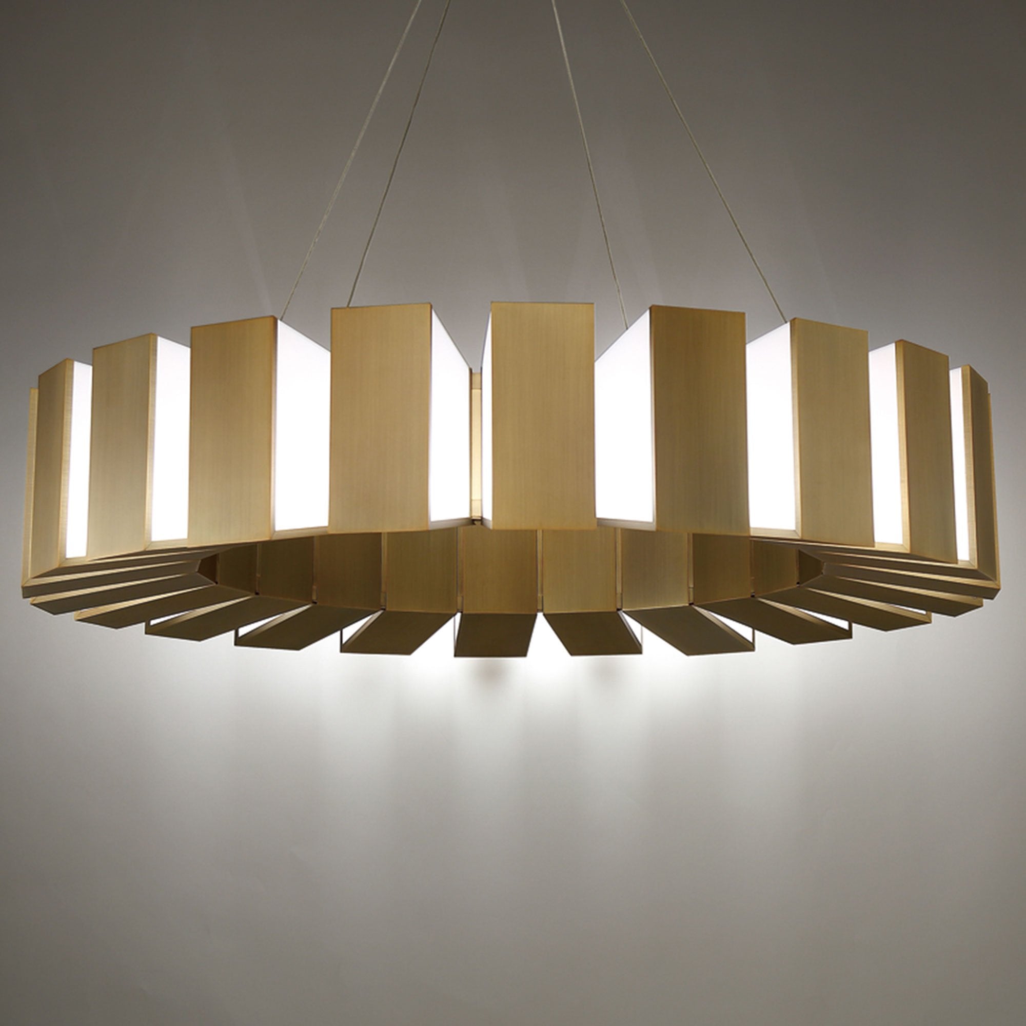 Like gears in a giant clock, this massive sculptural chandelier chimes of daring lighting design. Suspended and powered from ultra-thin aircraft cables, Chronos is ideal for high profile architectural and commercial environments with high ceilings and larger rooms. Finished in aged brass or brushed aluminum to complement the latest modern decor.