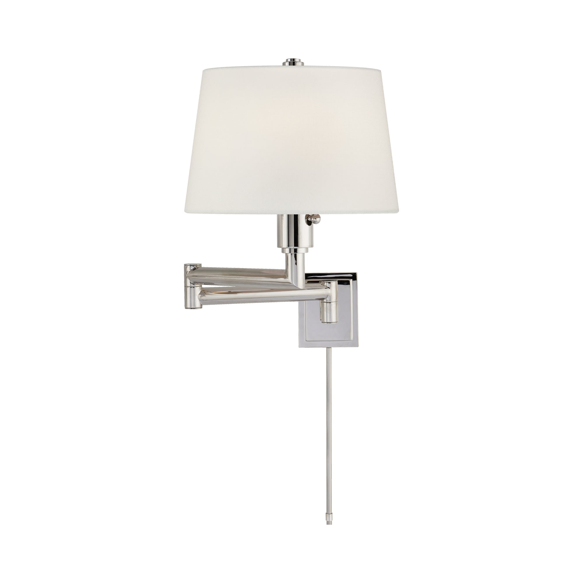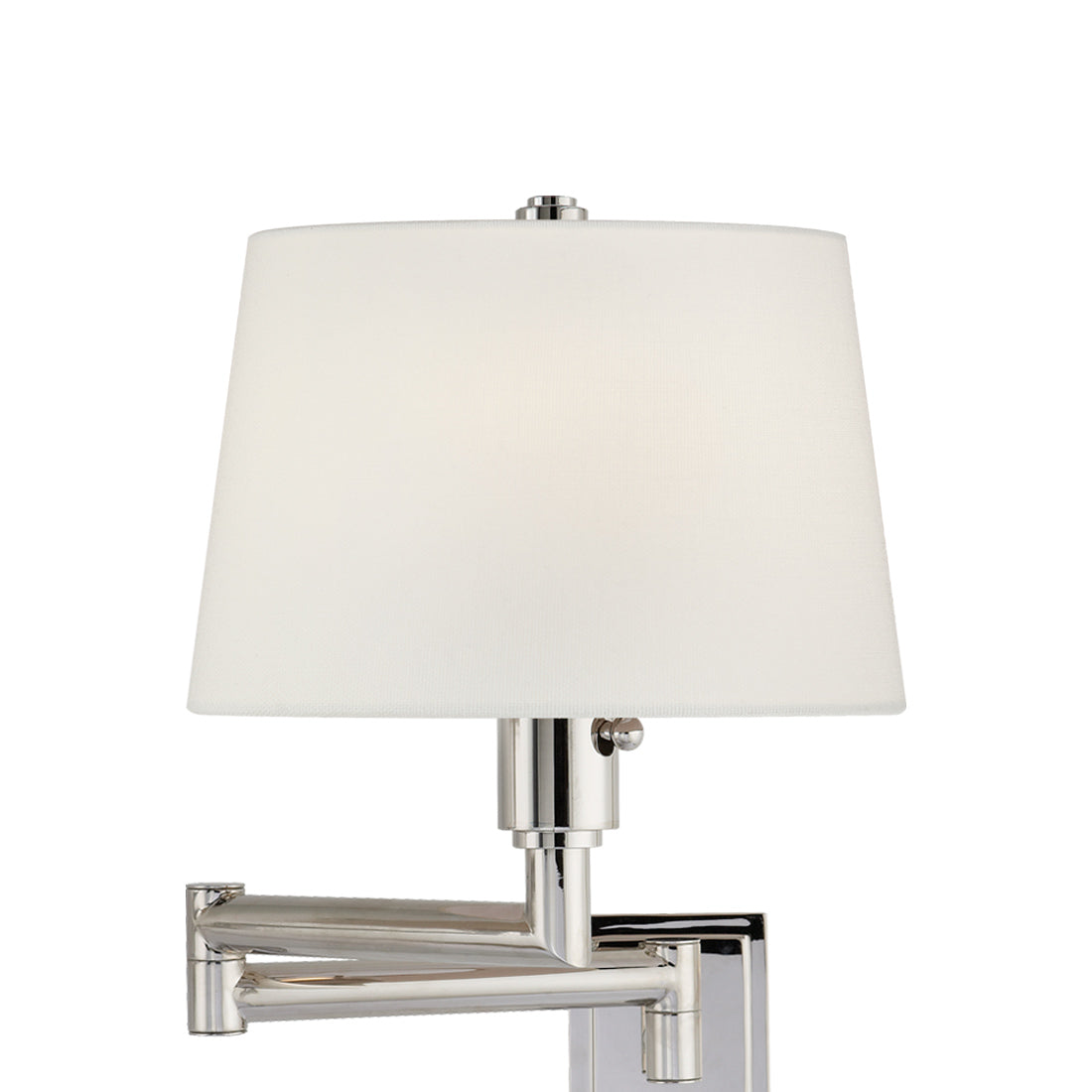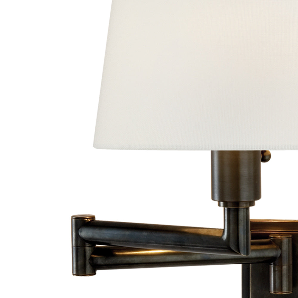 Perfectly targeted illumination magnifies the utility of the Chunky Swing Arm Wall Light from Visual Comfort Signature, and its classic traditional design is relaxing and versatile. Gorgeous metal construction forms a machined look with thick arms folding into moveable joints, held closely against a wall or extended to aid in reading. A classic linen shade fits iconic soft transitional design schemes.