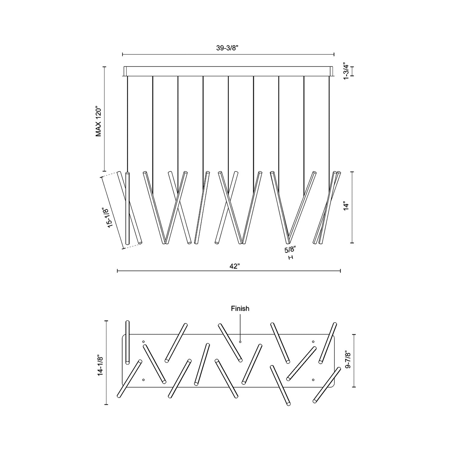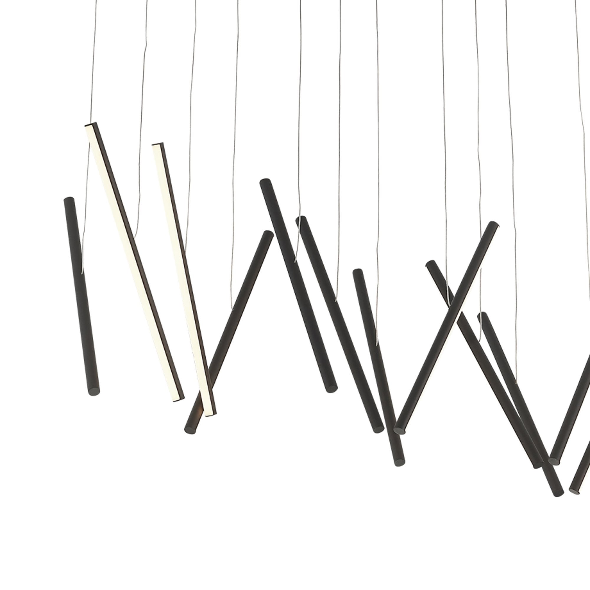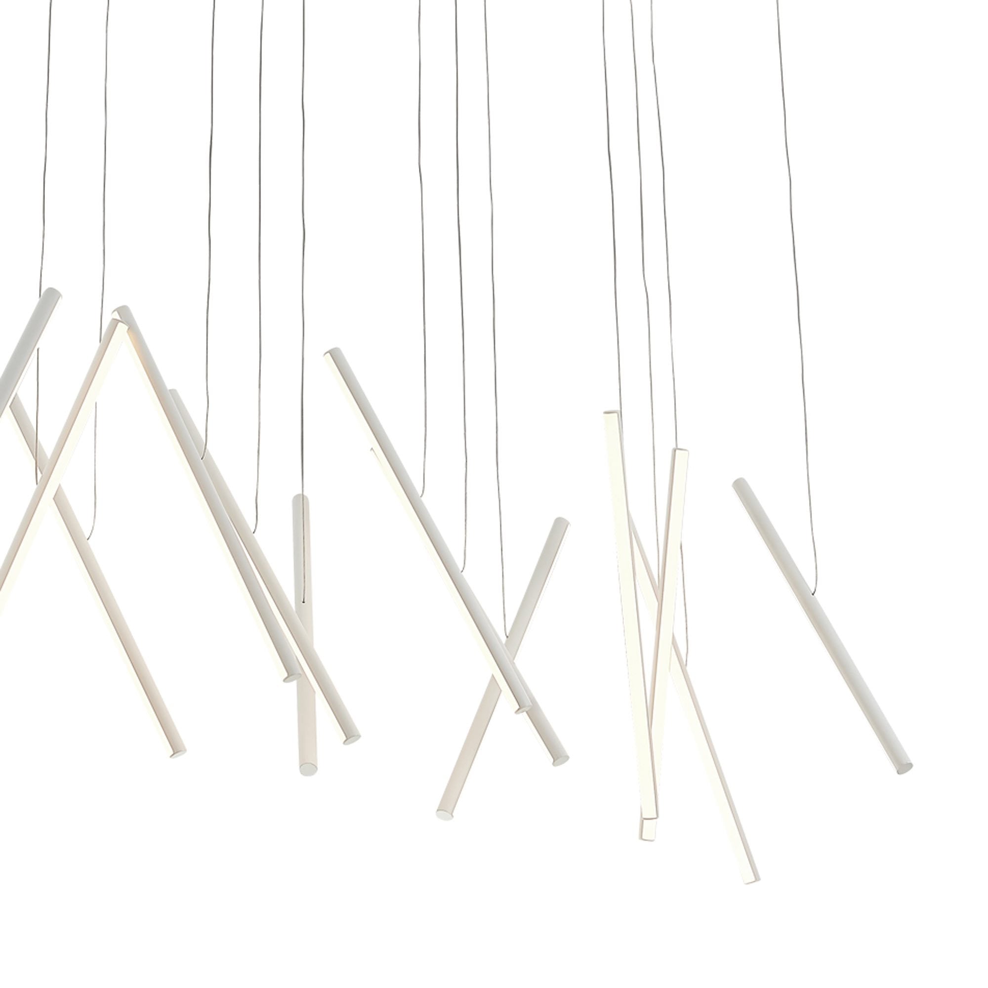The primary component of the CHUTE series is a slim round rod illuminated along the entirety of its length. The opal silicon diffuser radiates soft LED light outward from the axis of the lamps and completes the cylindrical shape. Used in angled repetition the fixture becomes increasingly energetic creating a field of radiant floating lines. Individual height adjustment of the various linear elements allows for user customization and an abundance of potential compositions. Available in several sizes and multiple finishes.