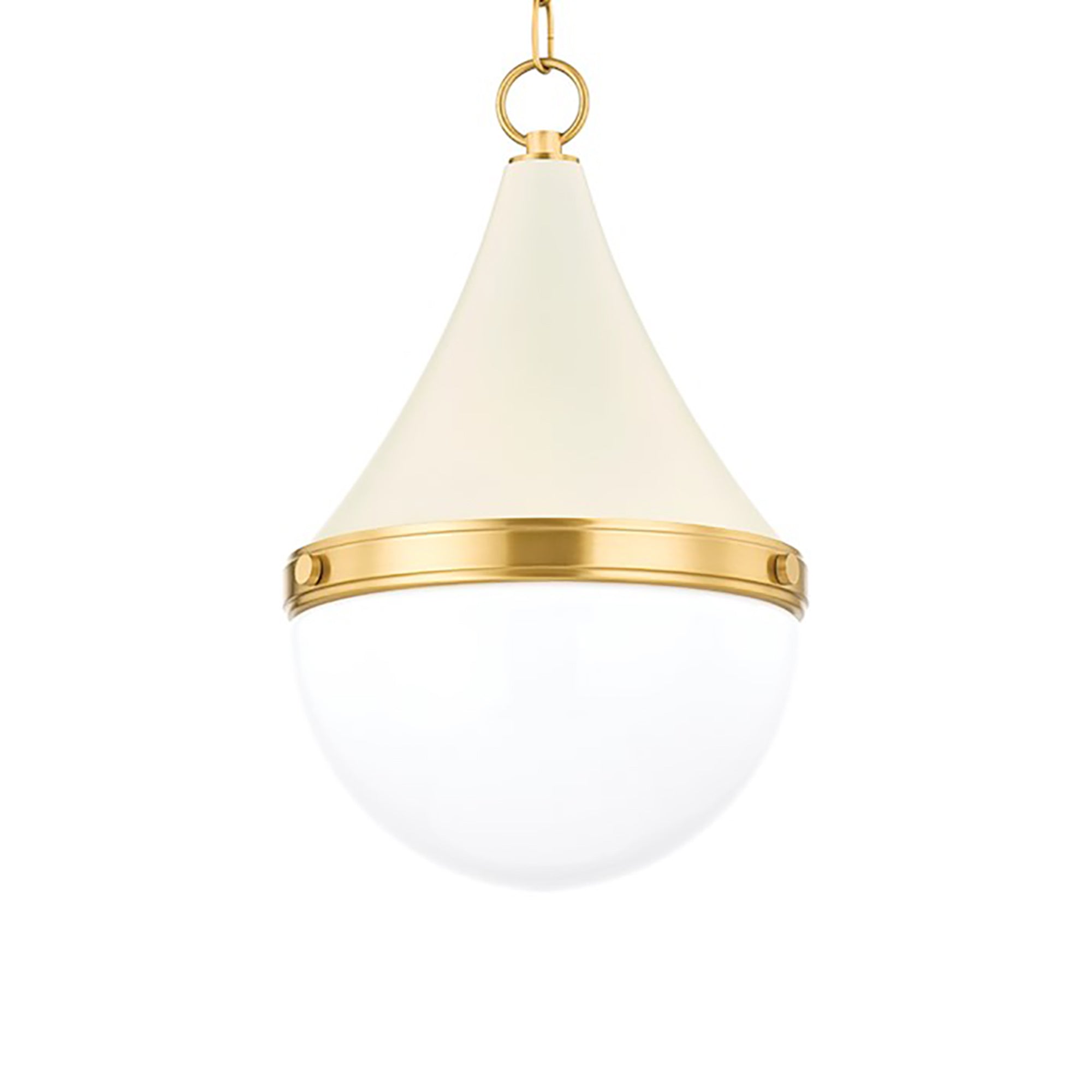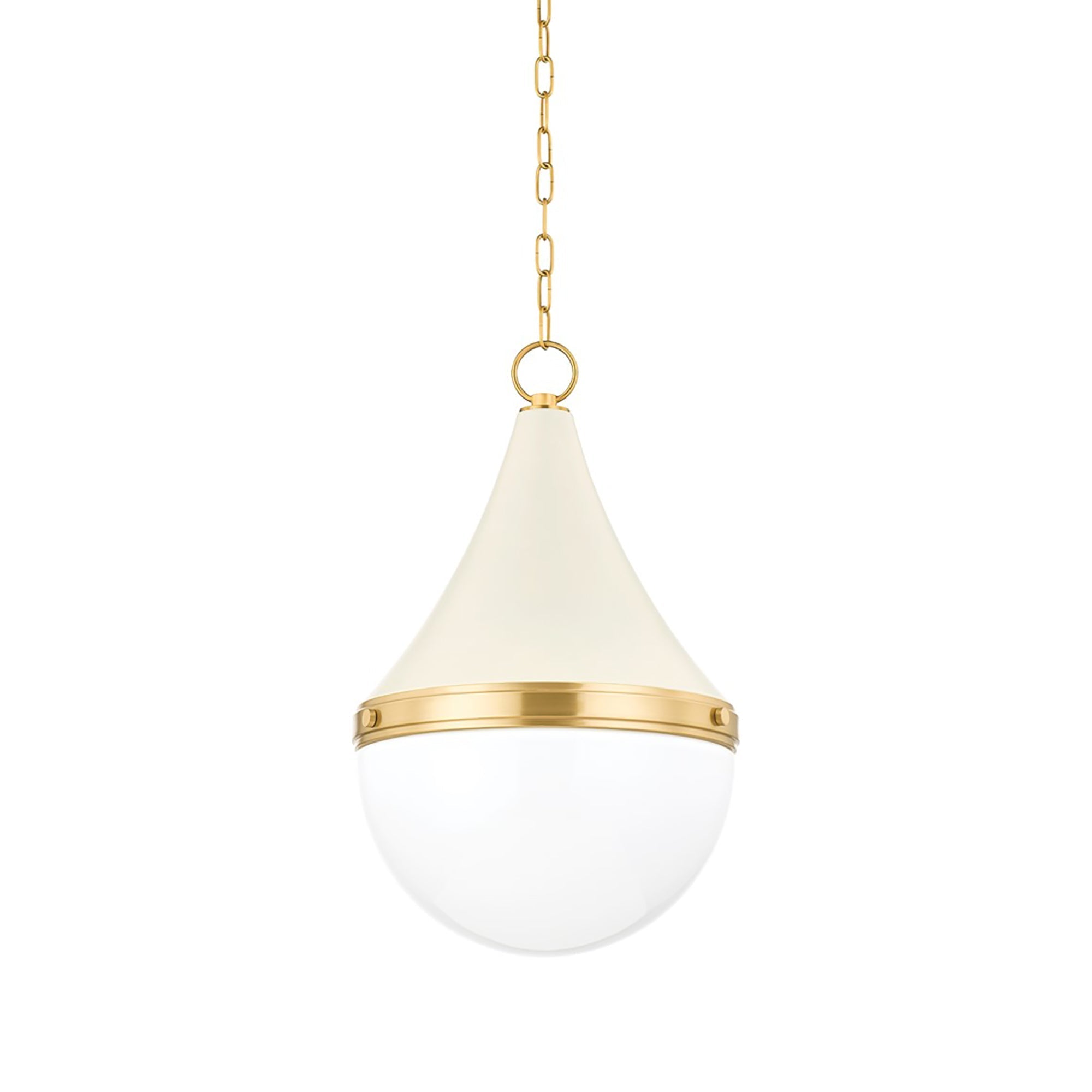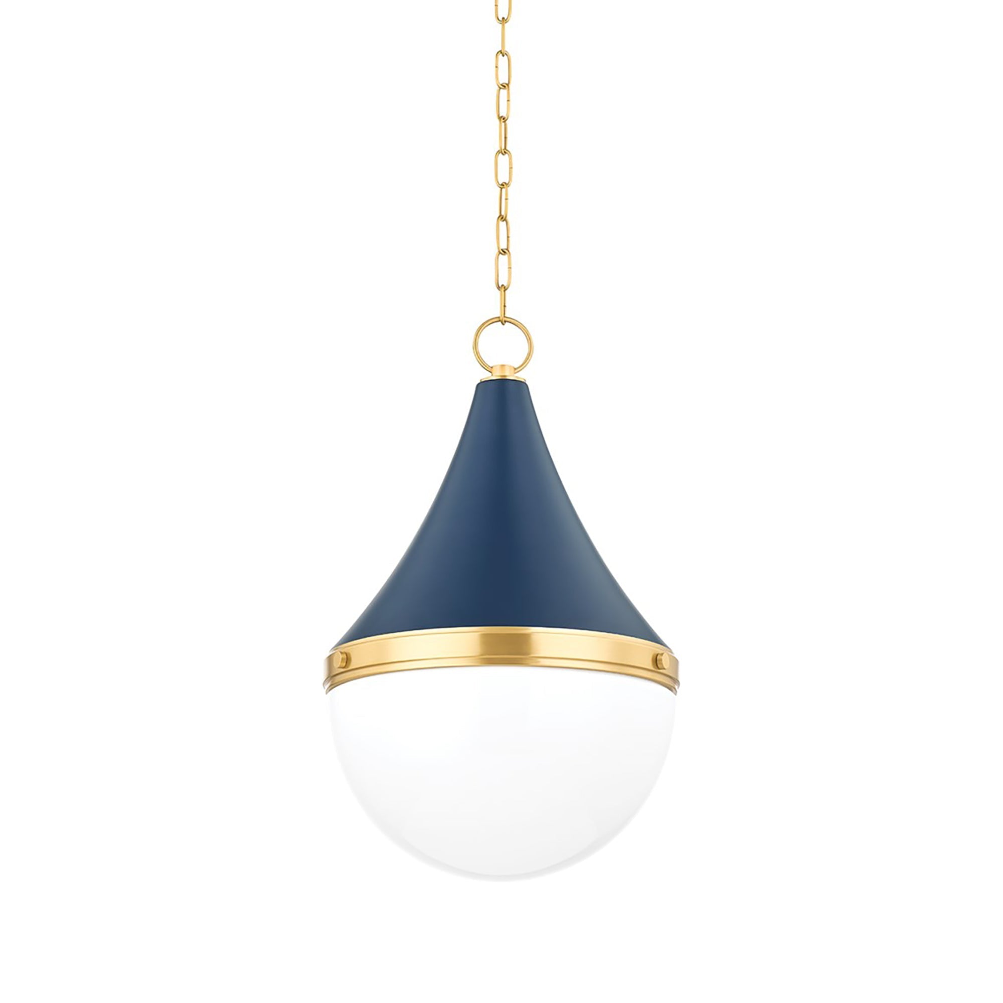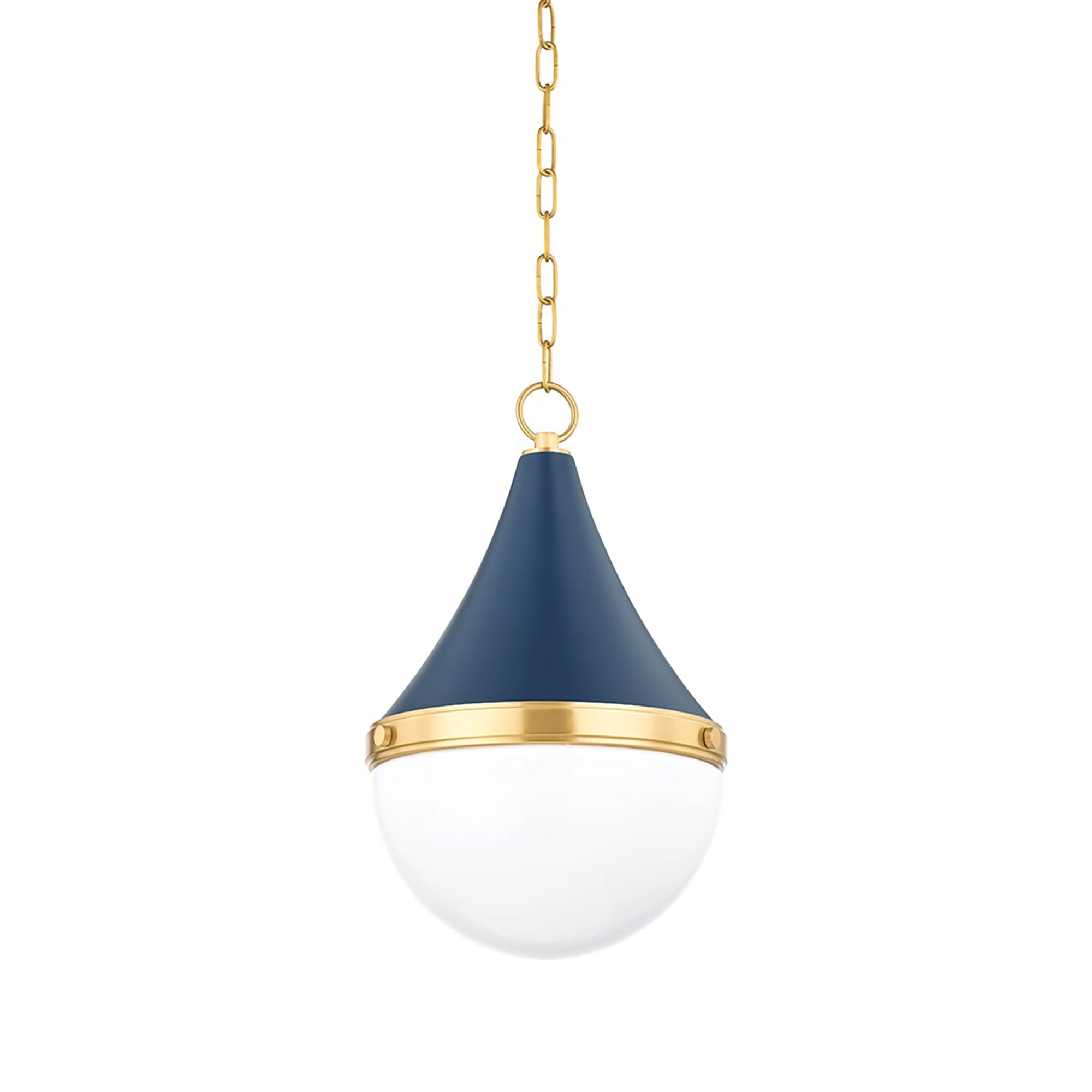 The artisan vintage flavor of the Ciara Pendant Light from Mitzi is modernized to reflect updated spaces, retaining the classic look of retro style. A fluid, conical glass shade with a beveled and banded metal strip secured its festive exposed globe diffuser, fashioning a teardrop silhouette, as industrial-inspired elements include rivets and open chain link suspension.