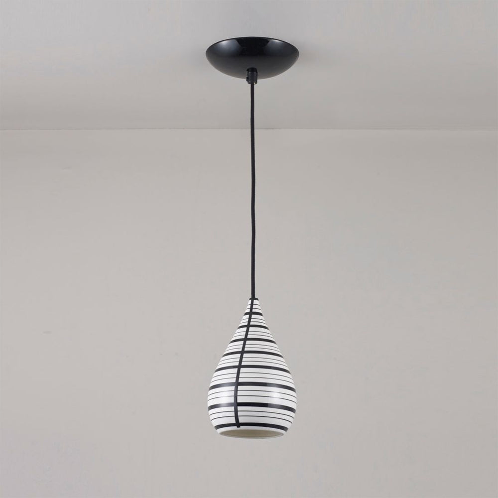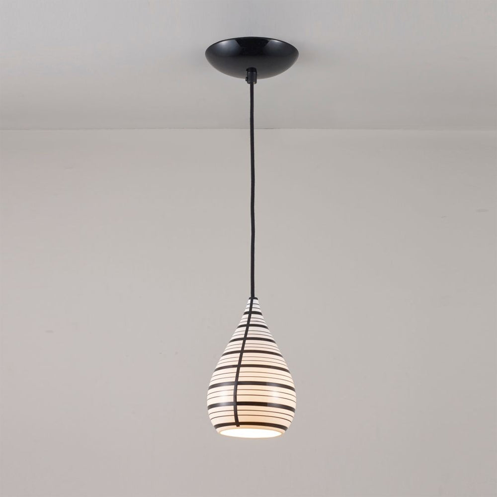 The Circle Line Drop Mini Pendant Light from Original BTC becomes a focal point in a casual space, delivering a look of festivity and an alluring silhouette. A teardrop-shaped bone china shade offers sleek patterning of variable width striping, as vertical stripes melt into a suspension cord. Create an ultimate look of decorative, playful artistry.