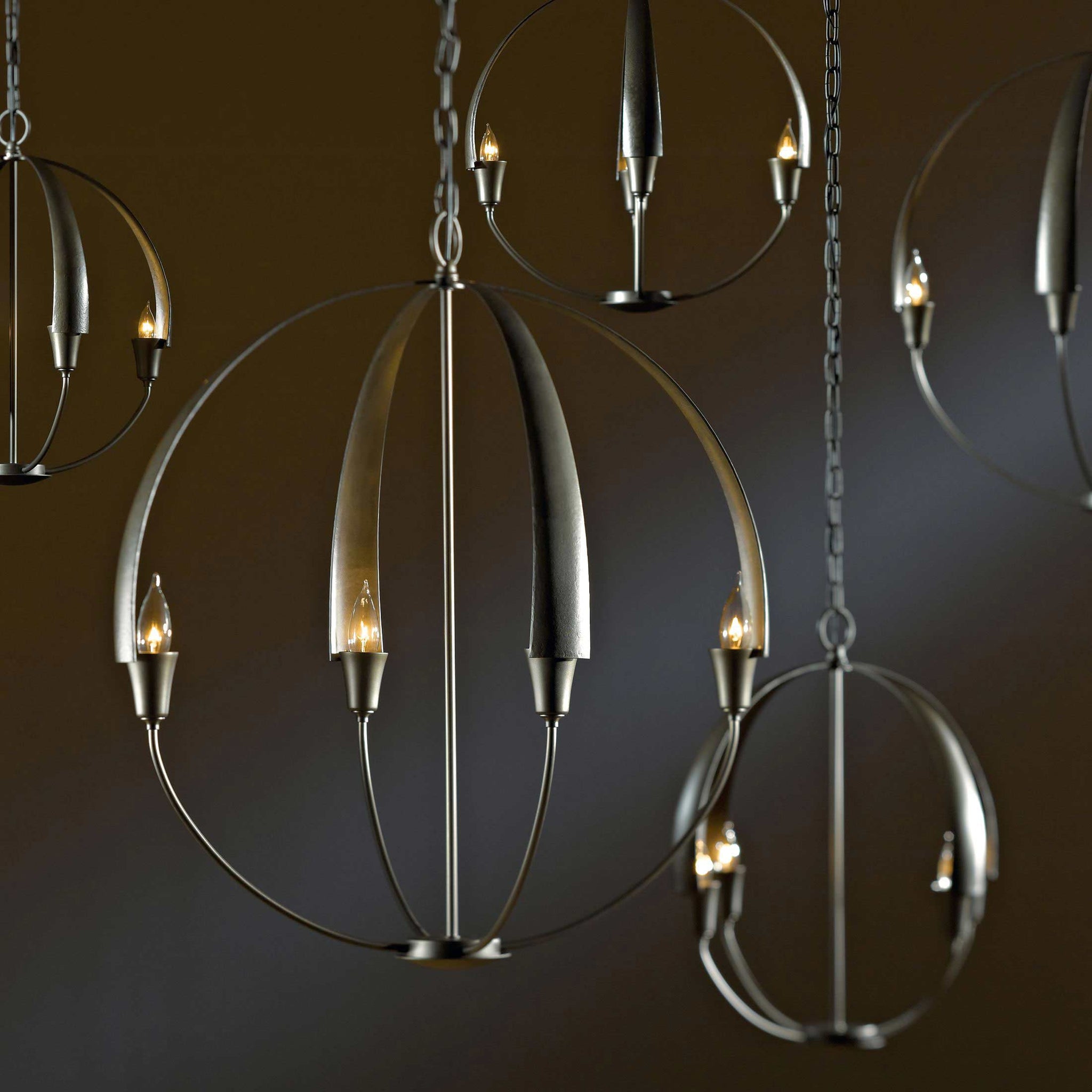 Flared steel shelters the light and evokes flickering flames on the Cirque Chandelier from Hubbardton Forge.