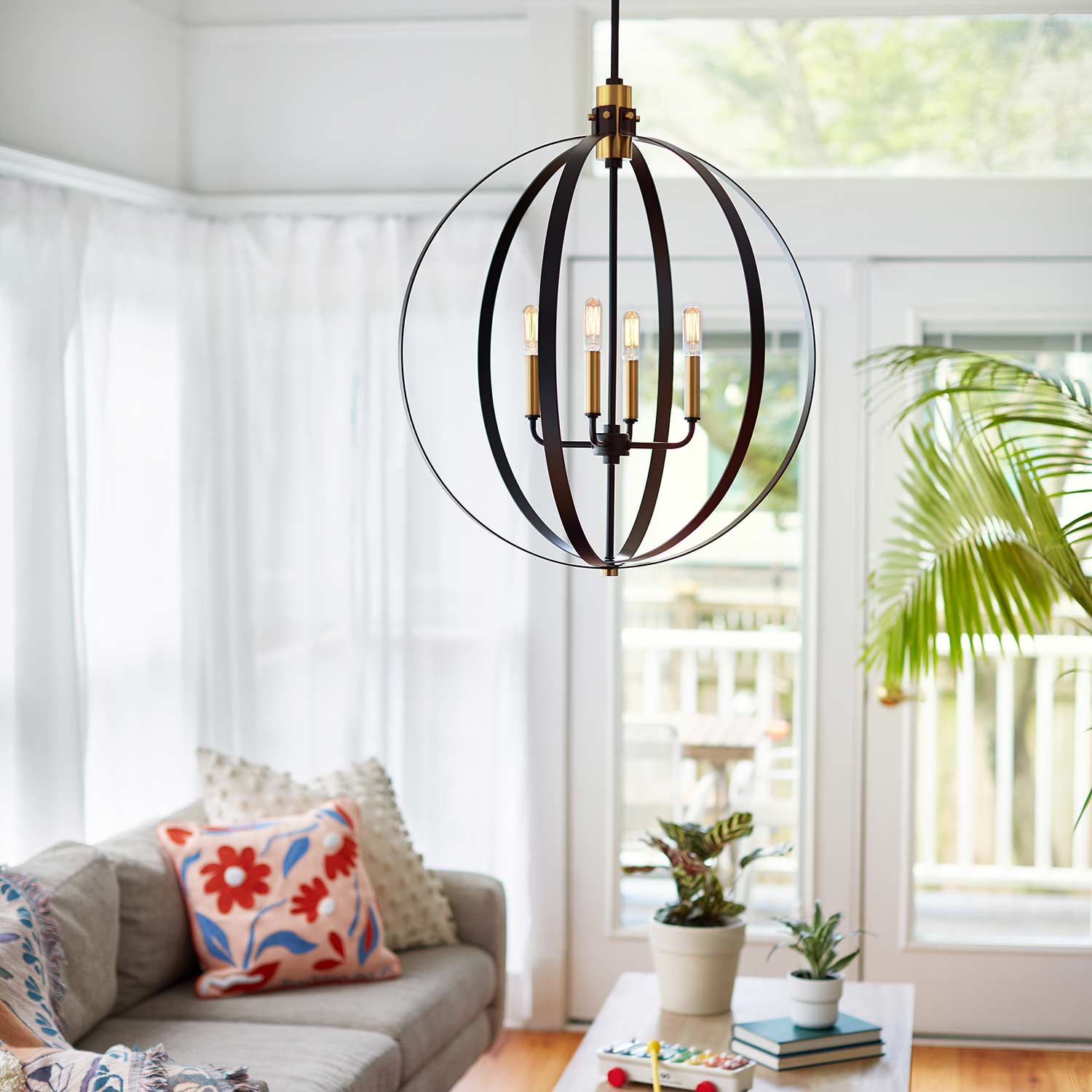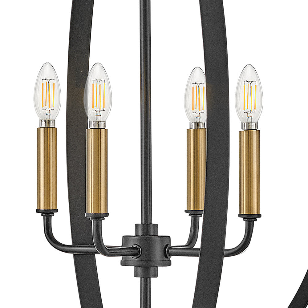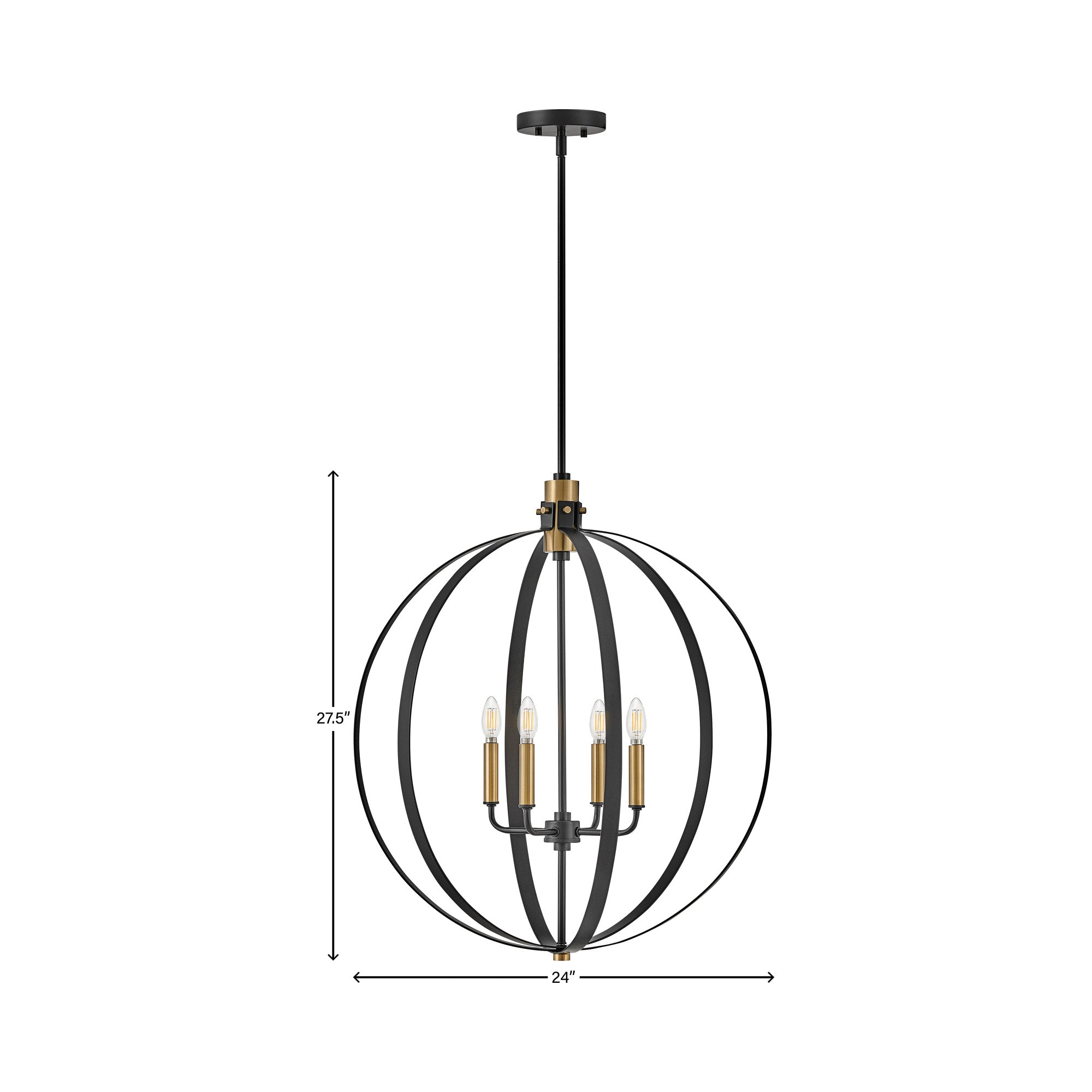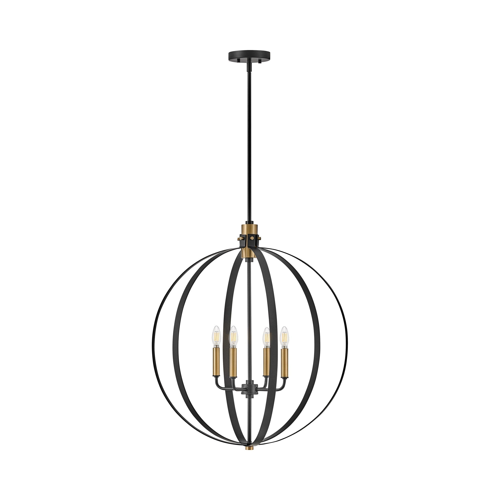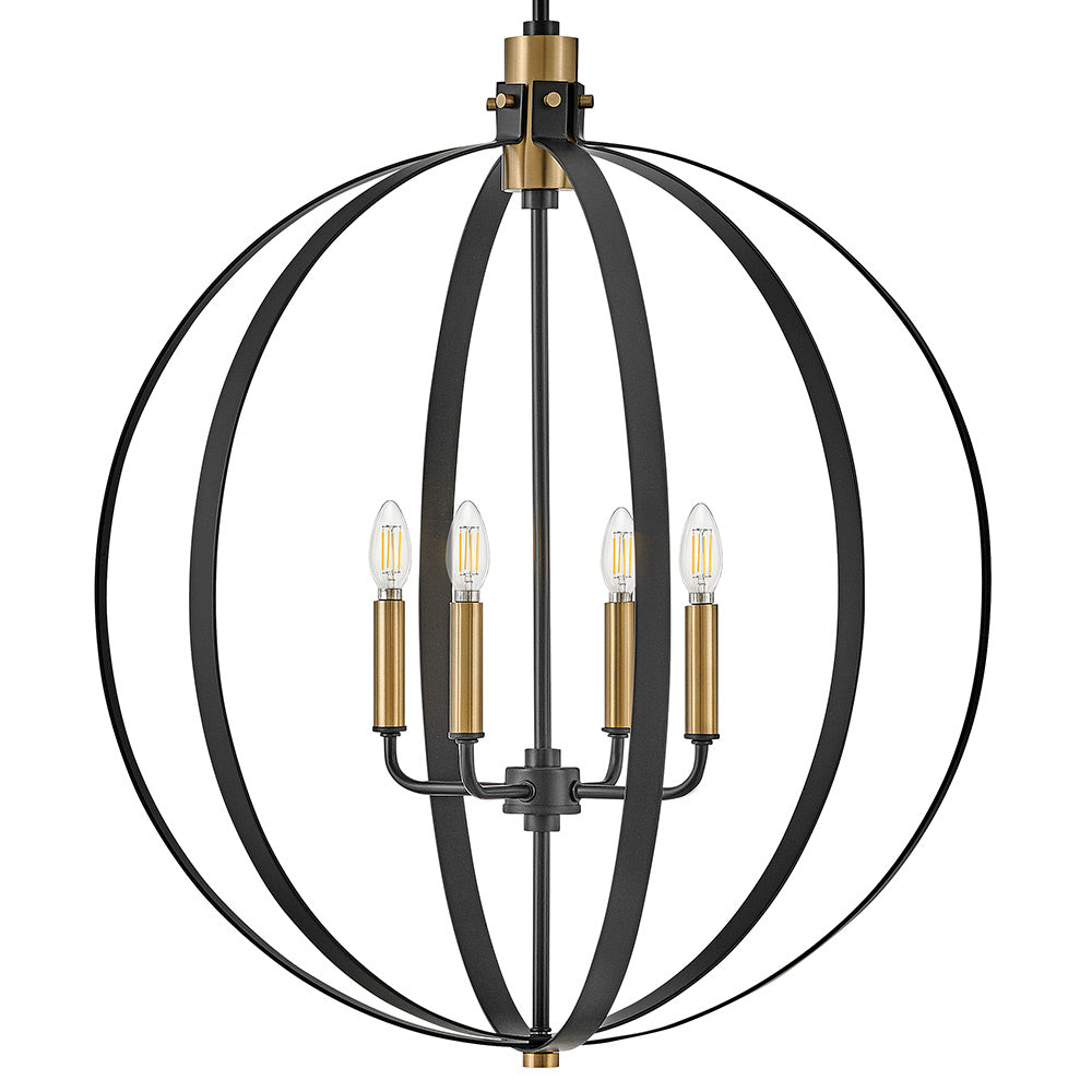 Curved metal bands create a compelling orb cage for the sophisticated Cirque Chandelier from LARK. Dynamic in a dining room or over a foyer, the chandelier features four lights within and pairs lacquered brass accents for warmth with a classic black finish to complement any décor.