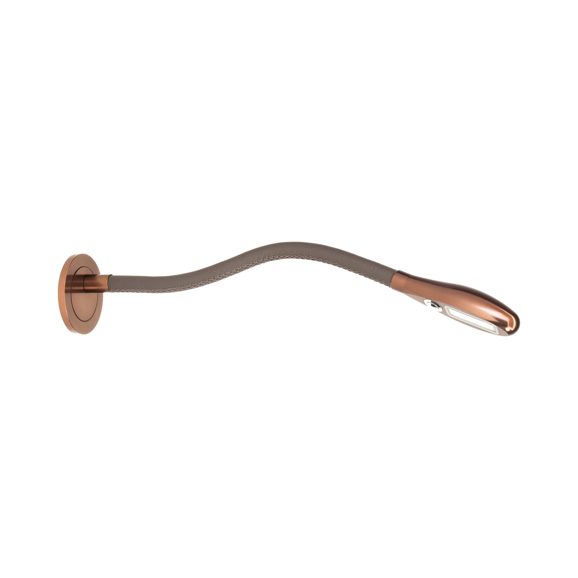 Showcasing a modernized version of industrial vintage utility, the Cirrus Escutcheon LED Wall Light from Original BTC captivates with the elegance of streamlined design. This energy-efficient light source takes its cue from a gritty factory motif, simplified to essential elements fashioned of metal with a serpent-like head and ring wall mount. Leather covers its flexible arm to improve grasp required for achieving a tailored direction of illumination over a bed or in a tight space.