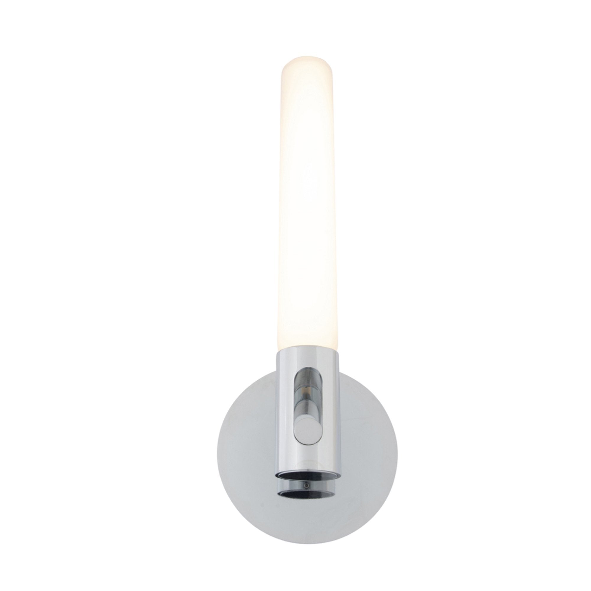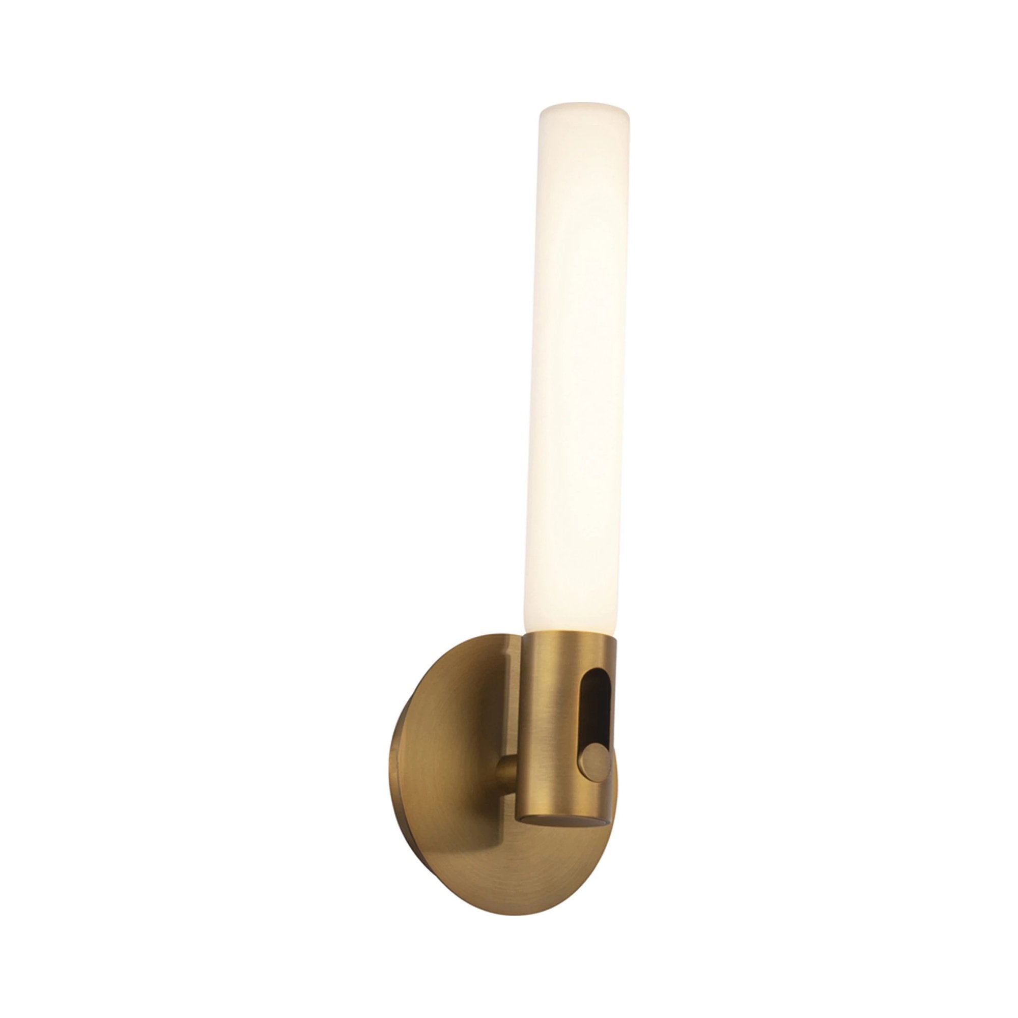 The tall cylindrical opal glass diffuser highlighting the Clare LED Bath Wall Light from dweLED creates a stunning, refined aesthetic for a modern bathroom, adding a round wall mount and frame made of lightweight aluminum.