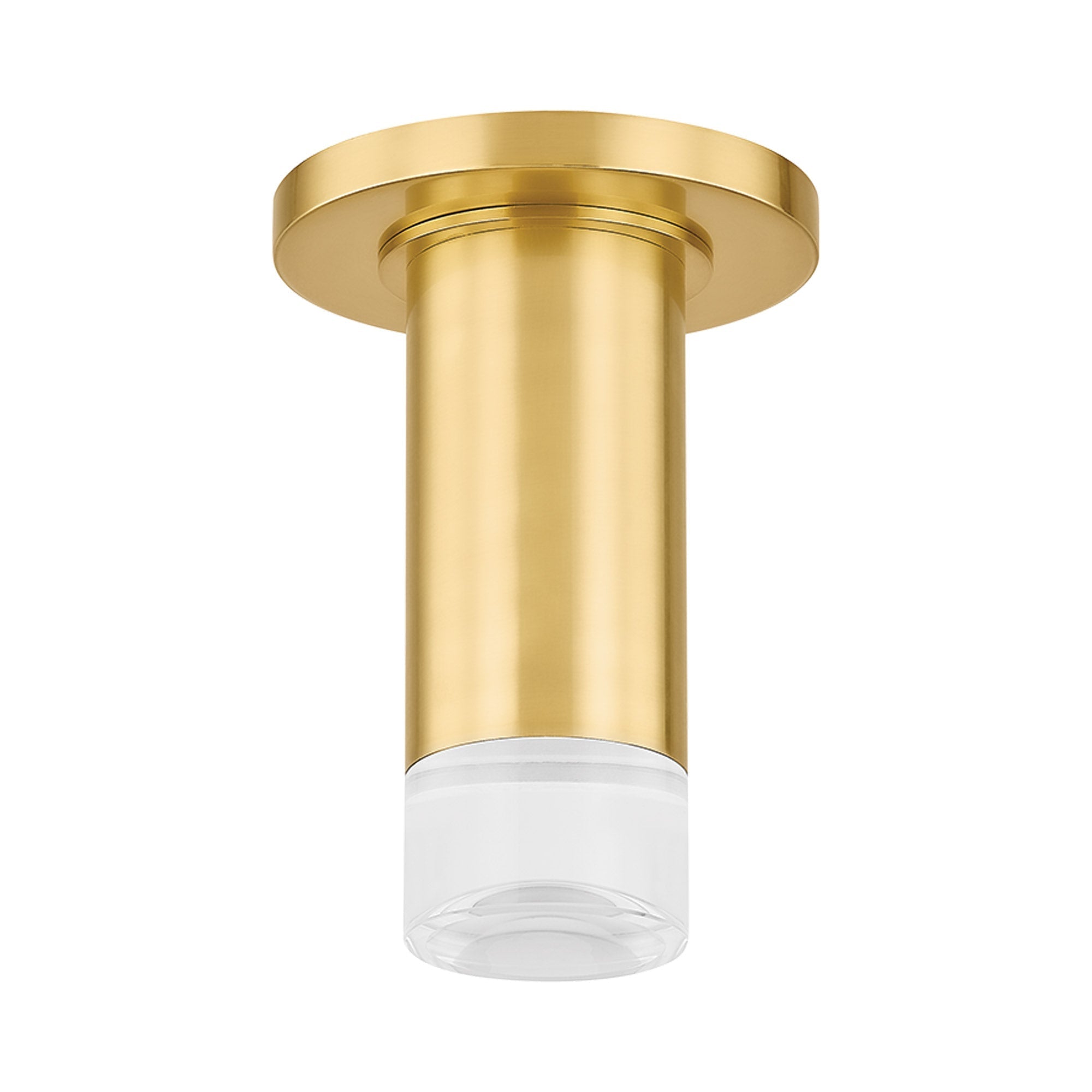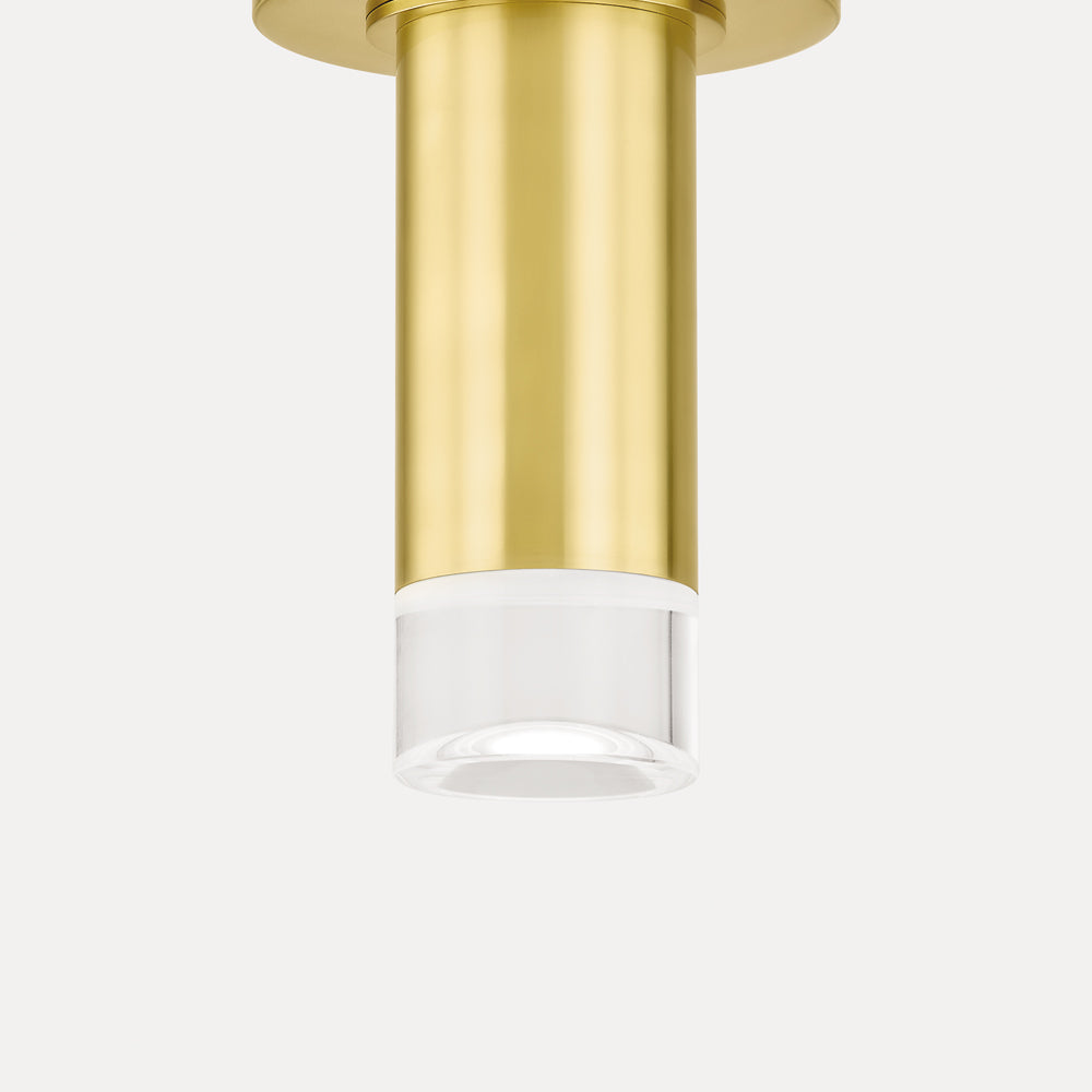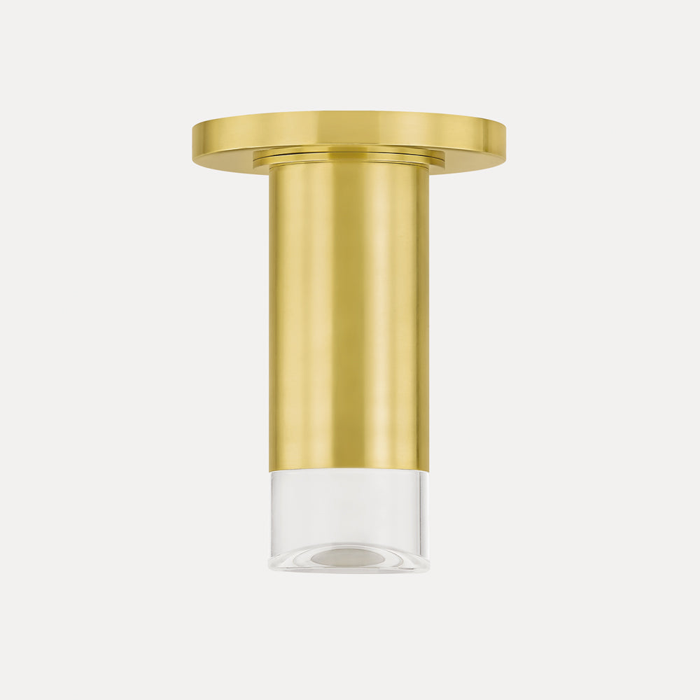 Simplicity belies an organically elegant design motif in a light fixture you'll want to consider. Metal framing with an elongated tube begins a design statemen creating the Claudie Flush Mount Ceiling Light from Mitzi, with a warm aged brass finish exuding warmth. A clear K9 crystal lens supplies plenty of ambient lighting in a kitchen, dining room, or entryway.