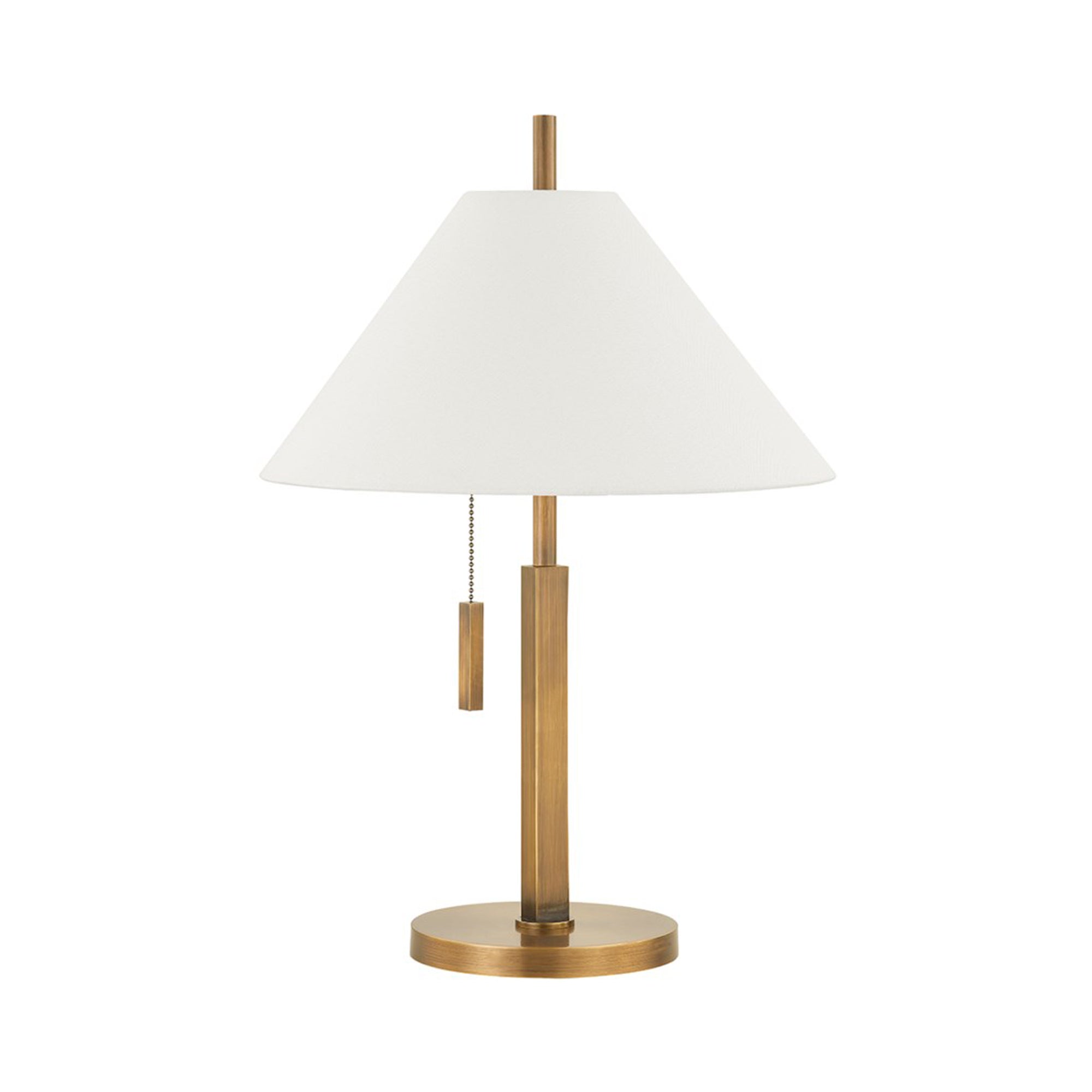 In a hybrid motif of traditional and contemporary, the Clic Table Lamp from Troy Lighting offers truly transitional elegance. Add accent or ambient lighting to a living space with a lamp fashioned of lush patina brass finish metal forming a tapered geometric frame. A visible pull chain adds a delightful touch, and a sleek tapered shade offers color contrast and proportionality.