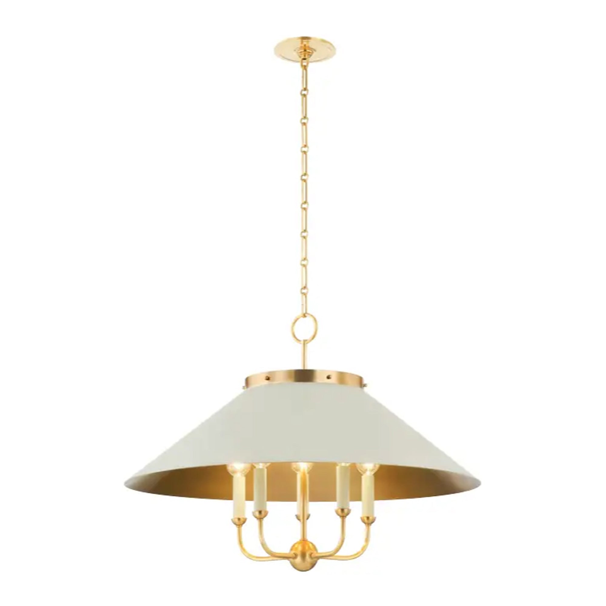 Optically captivating silhouette design elements begin with an industrial-inspired design motif and increase a glam factor with a metal candelabra lamp structure. The Clivedon Chandelier from Hudson Valley Lighting creates a hybrid farmhouse and palatial style mix to simplify interior lighting, counting on a tempting cone shade with metal accents throughout.