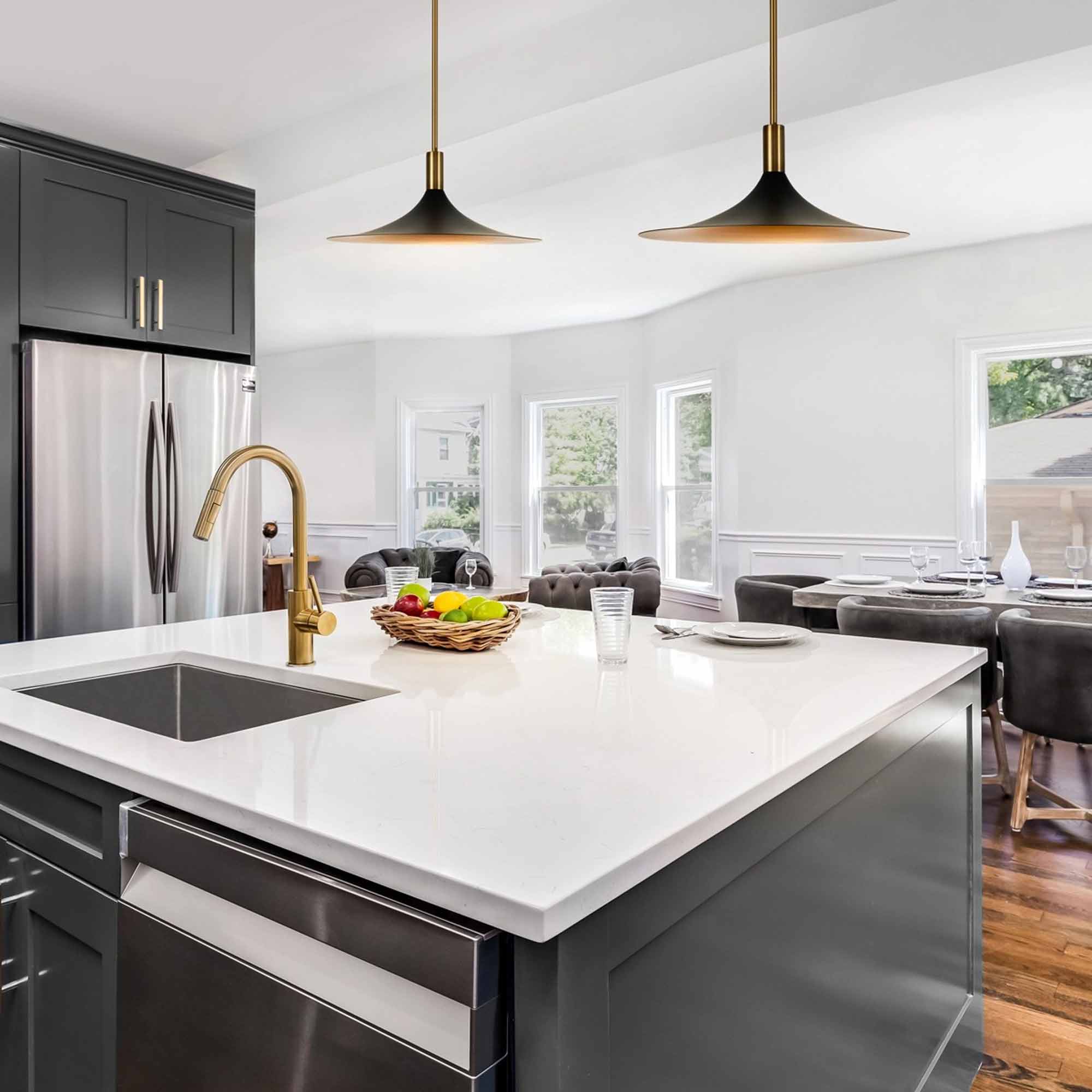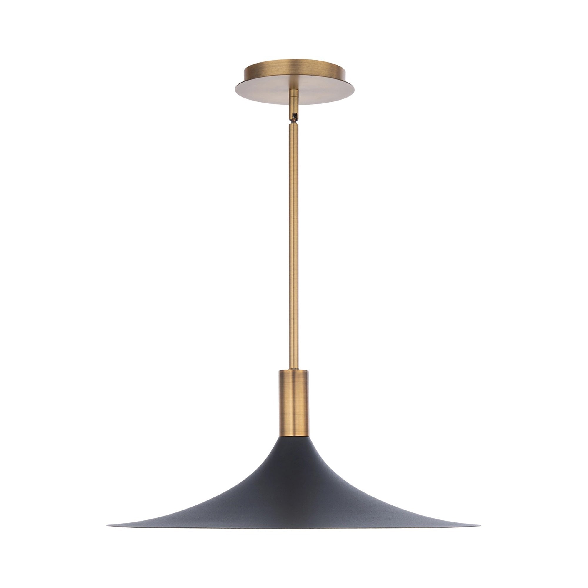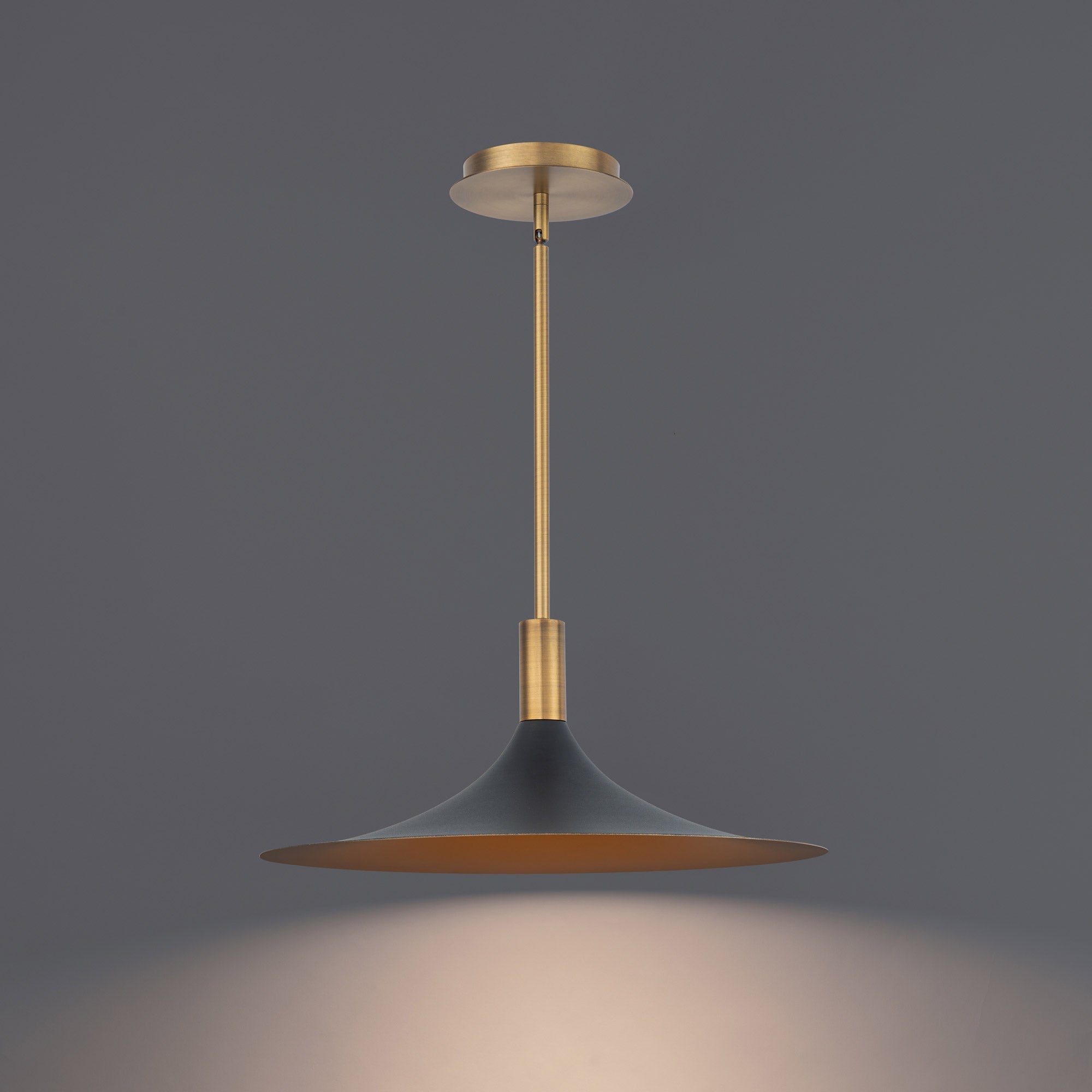 A regal black spun metal shade with a gold painted interior and etched opal glass make for a fine aged brass pendant.