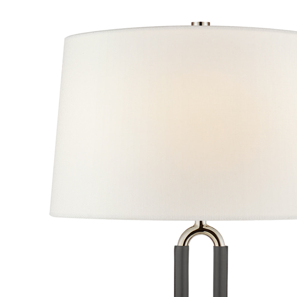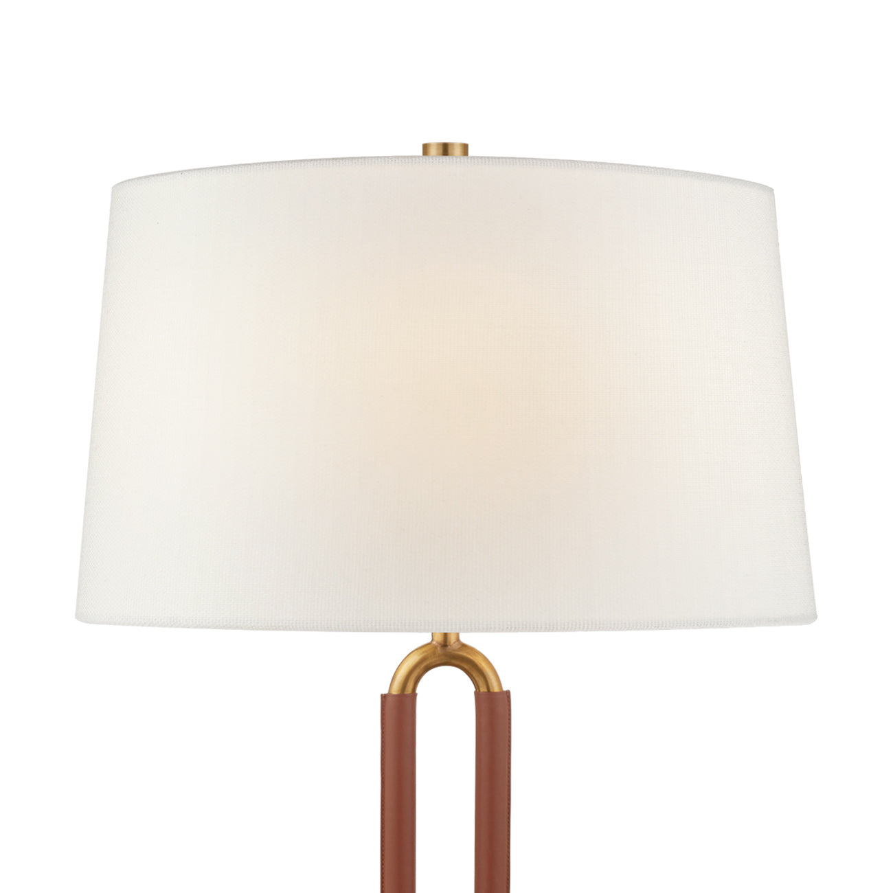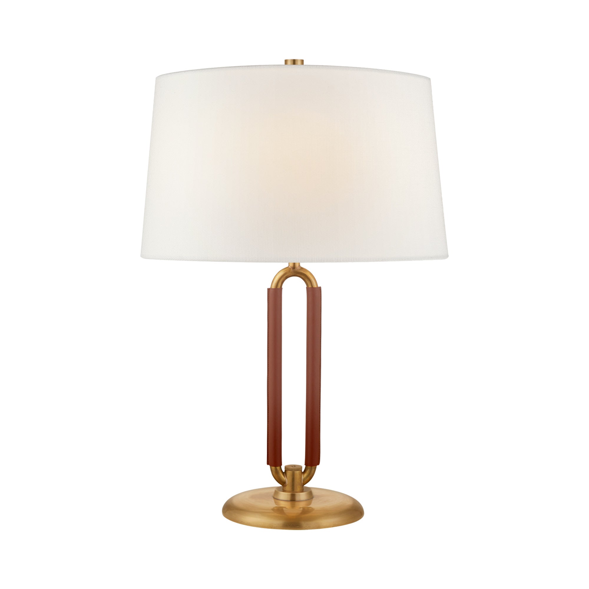 The Cody Table Lamp from Visual Comfort Signature showcases sophisticated silhouetting with its slender, open oval body, each side wrapped in equestrian-inspired leather. Consider this light source both casual and refined as it dresses up a living room, den, or bedroom and glows with light filtered through an iconic linen shade.