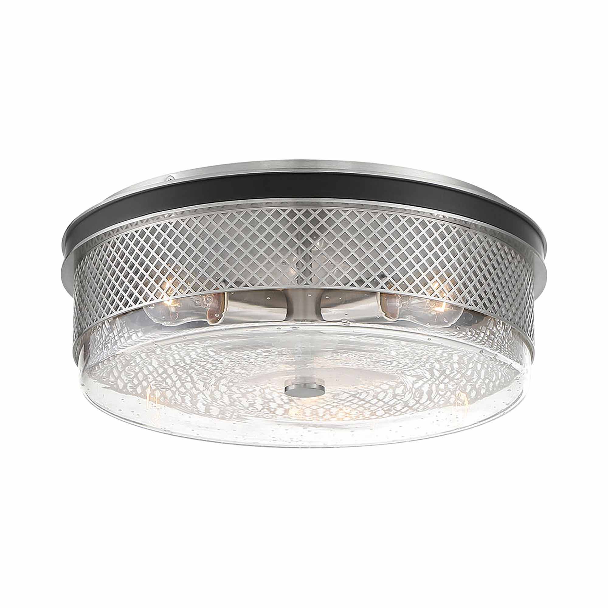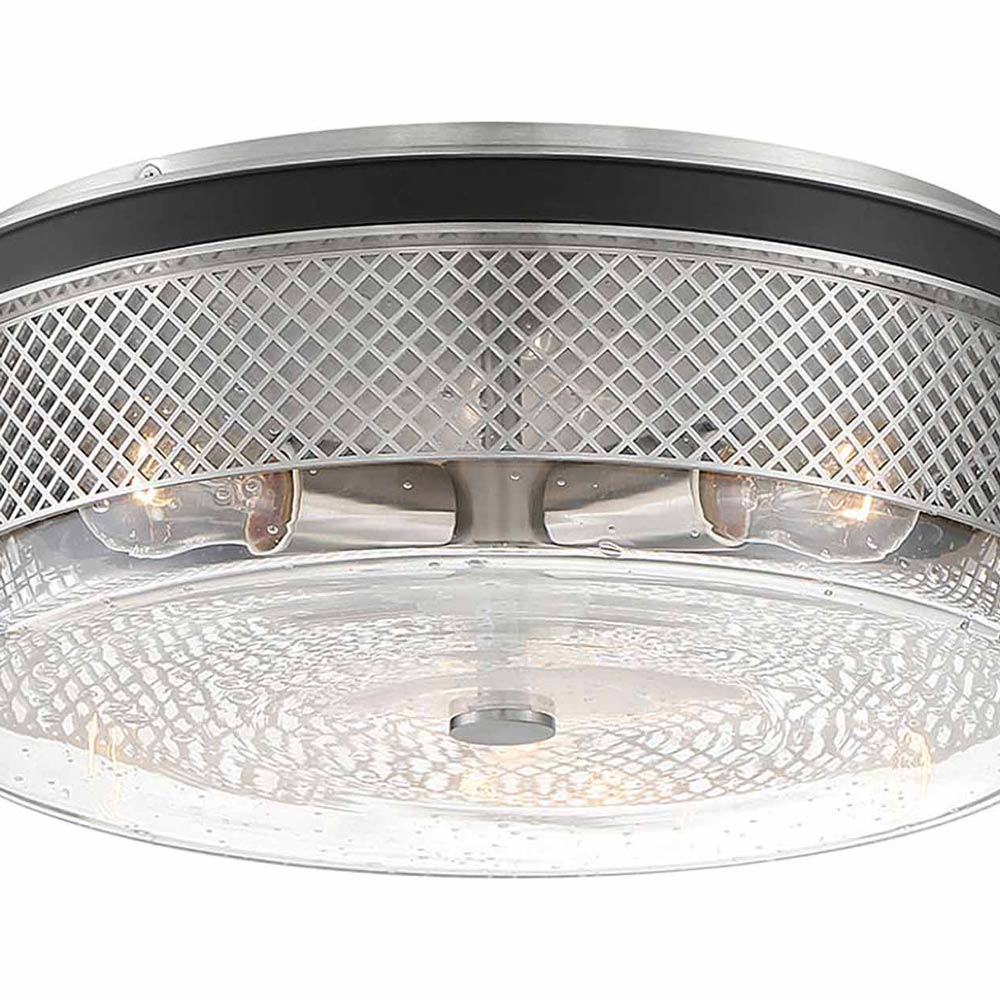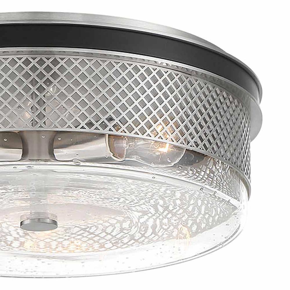 Bits and pieces of industrial influence craft a gritty motif perfect for transitional settings as the Cole's Crossing Flush Mount Ceiling Light from Minka Lavery creates an interesting vibe. Brushed nickel finish metal and clear seeded glass construction throws in a cage-like rim, partly obstructing bulbs that send ambient lighting downward and toward each side. The result is a clean look with impact, ideal for accenting a kitchen, foyer, or mud room.