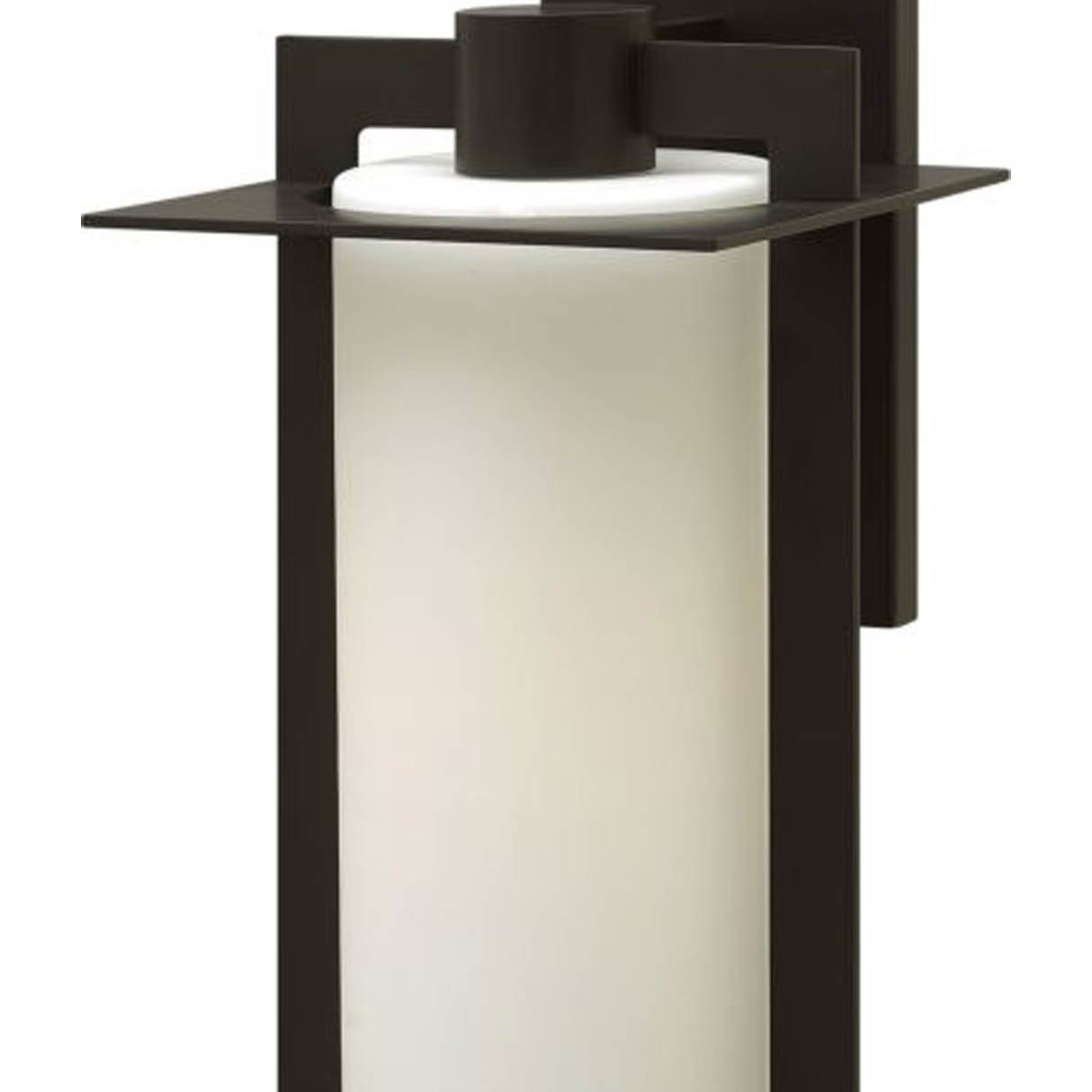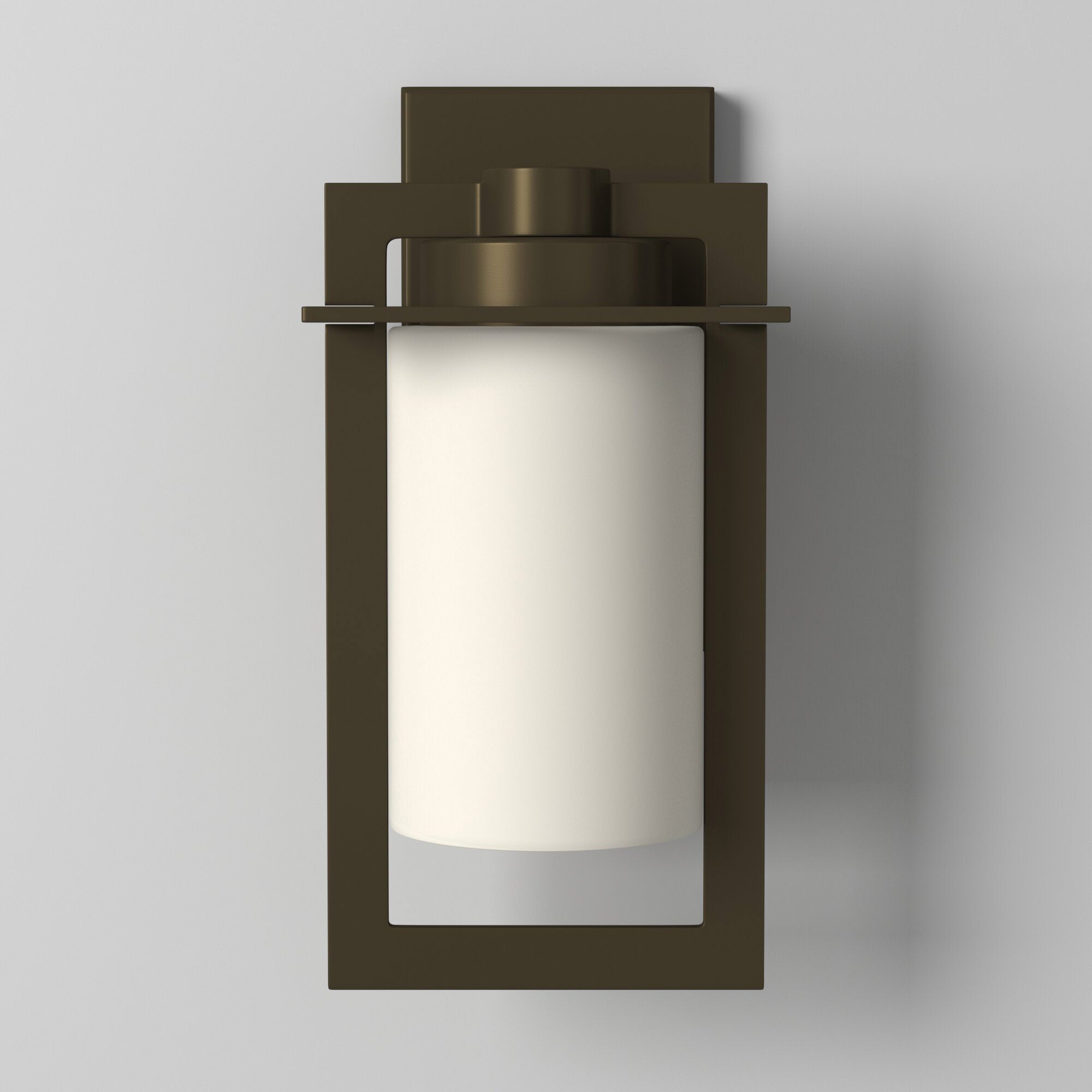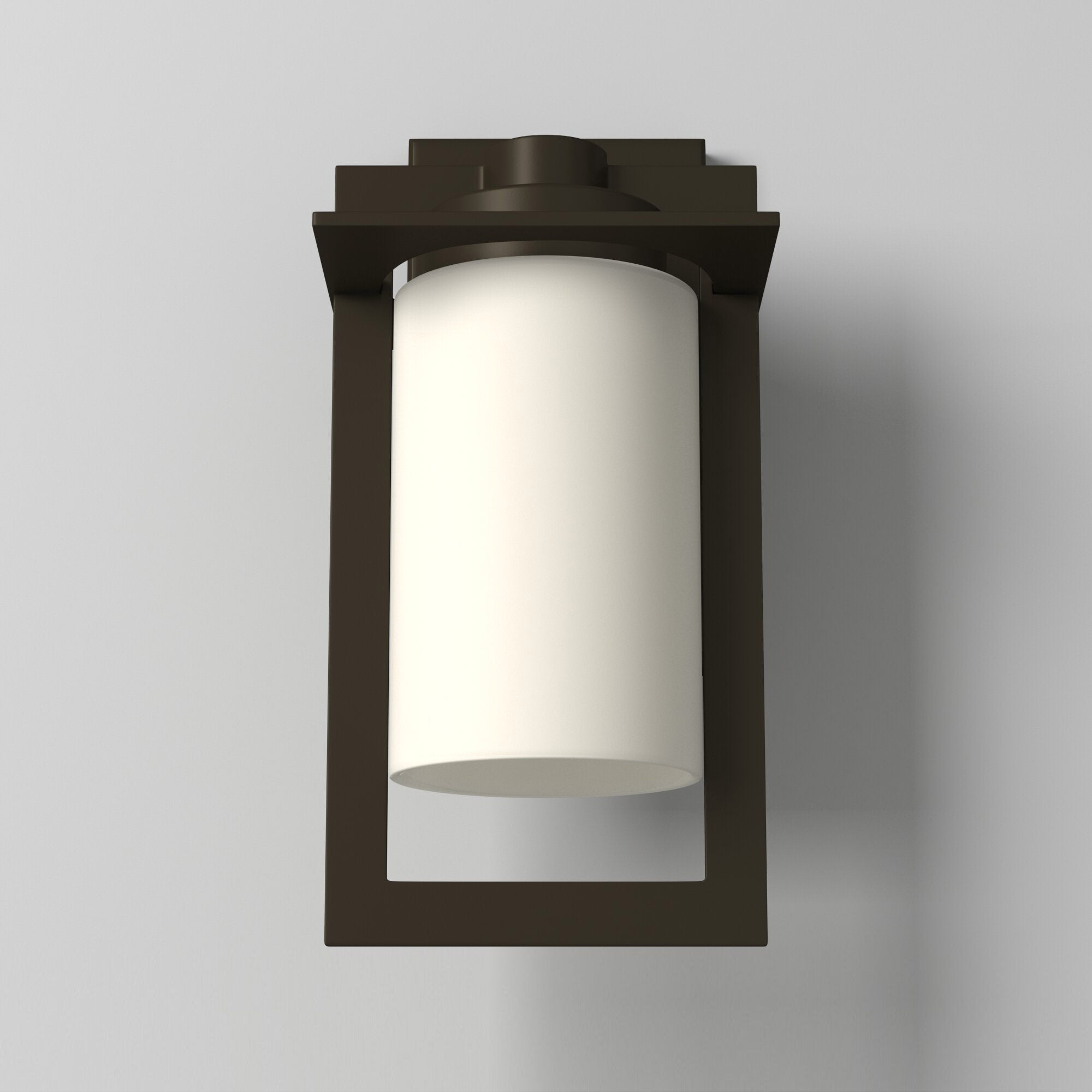 The sleek lines of Colfax Outdoor Wall Light feature intersecting planes of solid aluminum and a chic cylinder of etched opal glass to create a sophisticated geometric form. The die cast aluminum construction in a Bronze finish brings an Arts & Crafts flair to the transitional design.