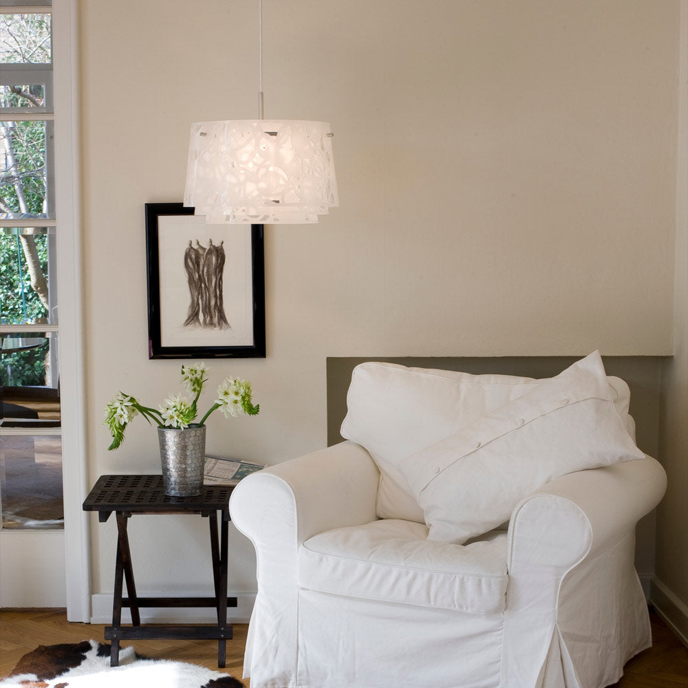 The interplay of light and shadow create unique energy and artistry for the Collage Pendant Light from Louis Poulsen. A trio of laser cut acrylic drums feature different patterns and are layered to disguise the lamping and create diffused, downward illumination. Matte white adds to a modern sensibility and is sure to offer a lovely complement to surrounding decor.