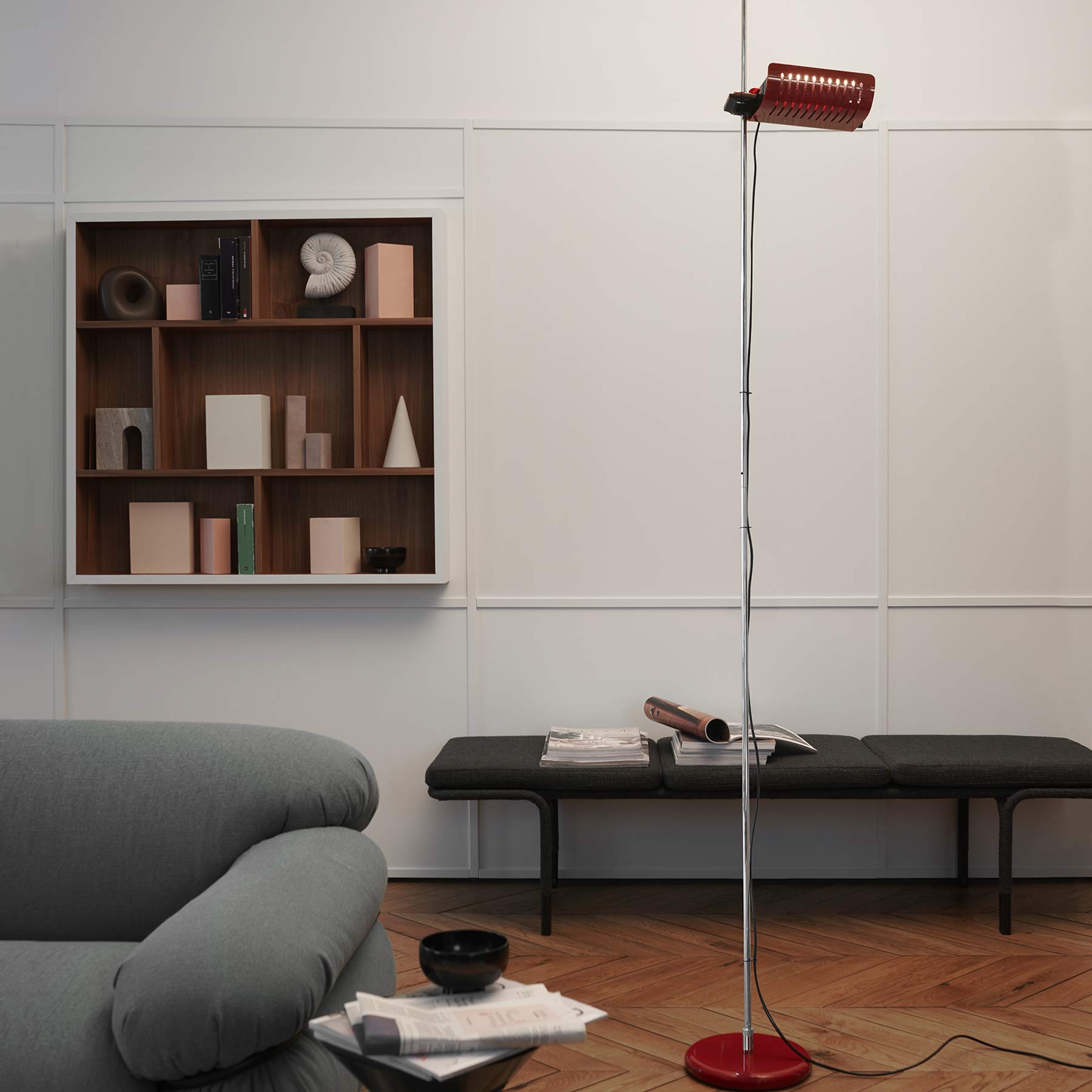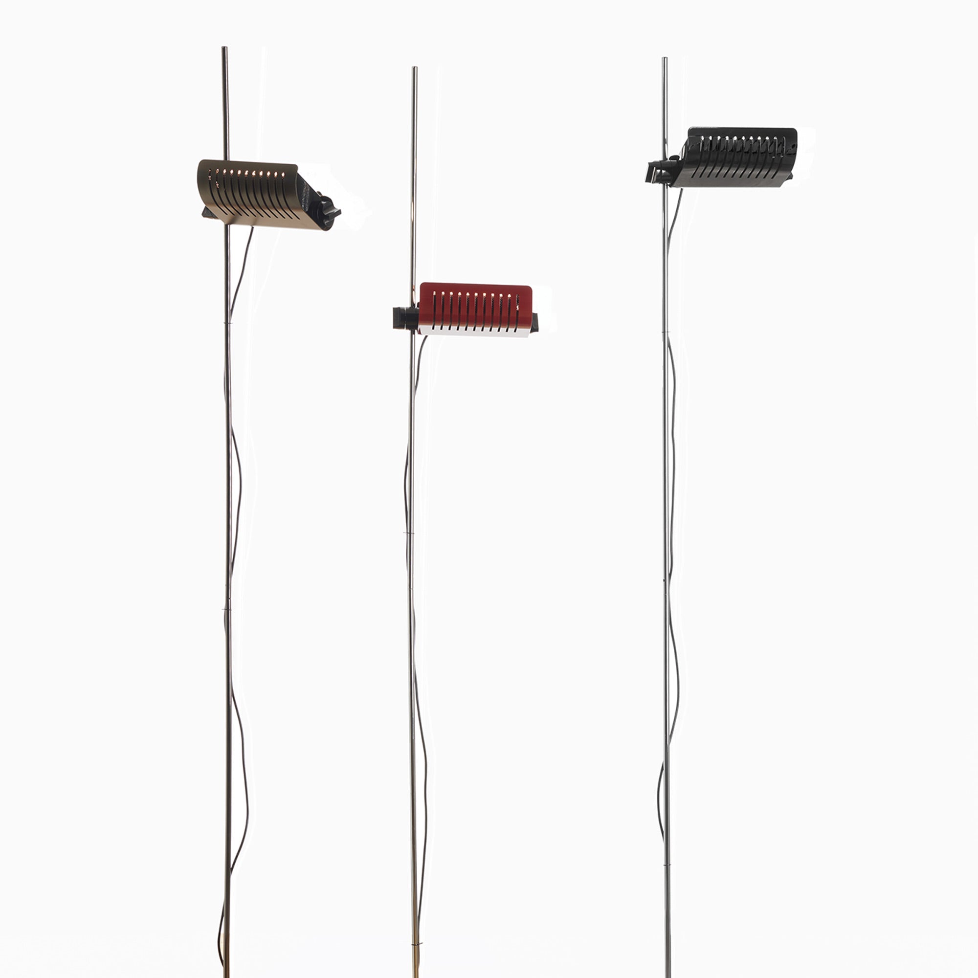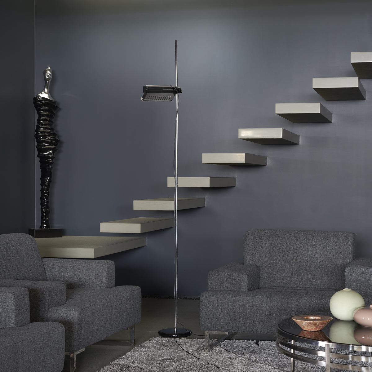 The design of the Colombo lamp – base, chrome stem and adjustable reflector – responds to the demands for clean shapes and technological functionality that go hand in hand with the concept and design of this great designer. The Colombo is a floor lamp with a dimmer giving direct and indirect light, a lacquered steel base, chromium-plated stem and a height adjustable reflector in lacquered aluminum.