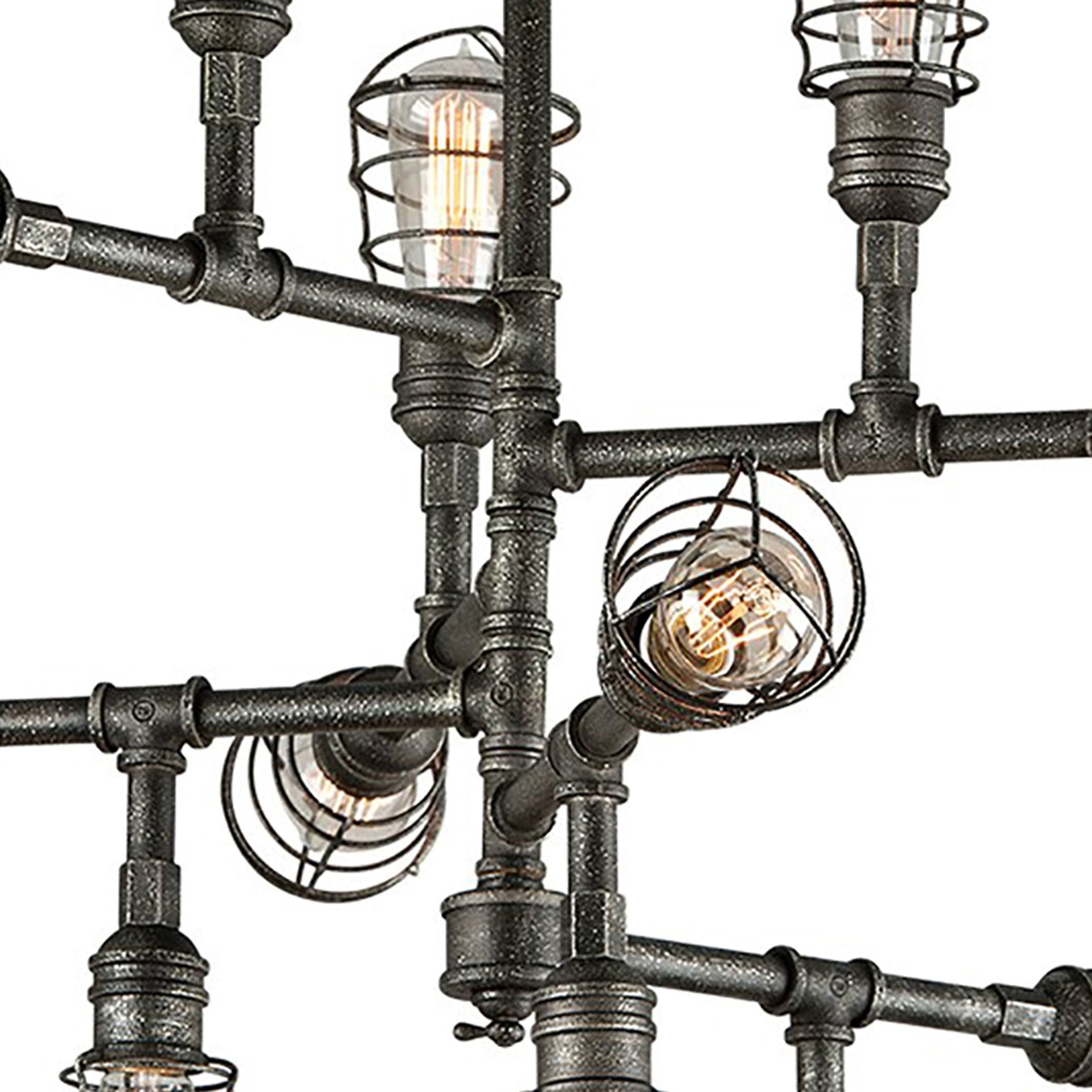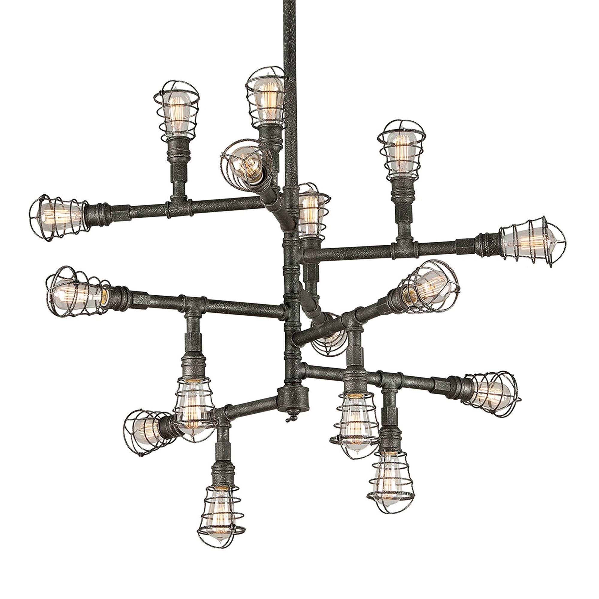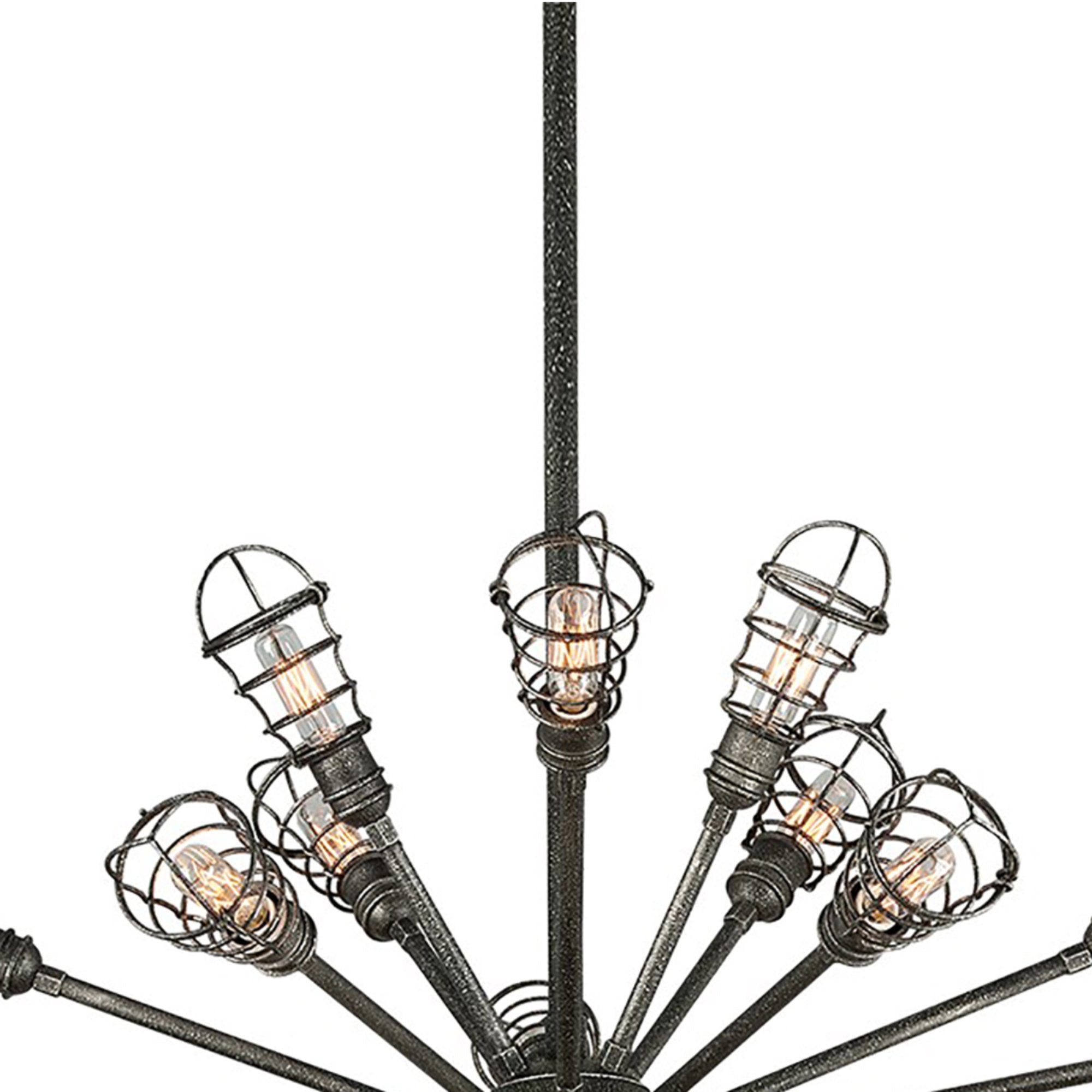 Crossing Sputnik and industrial, the Conduit Chandelier from Troy Lighting is an engaging design complete with caged shades and the aged appearance of an old silver finish.