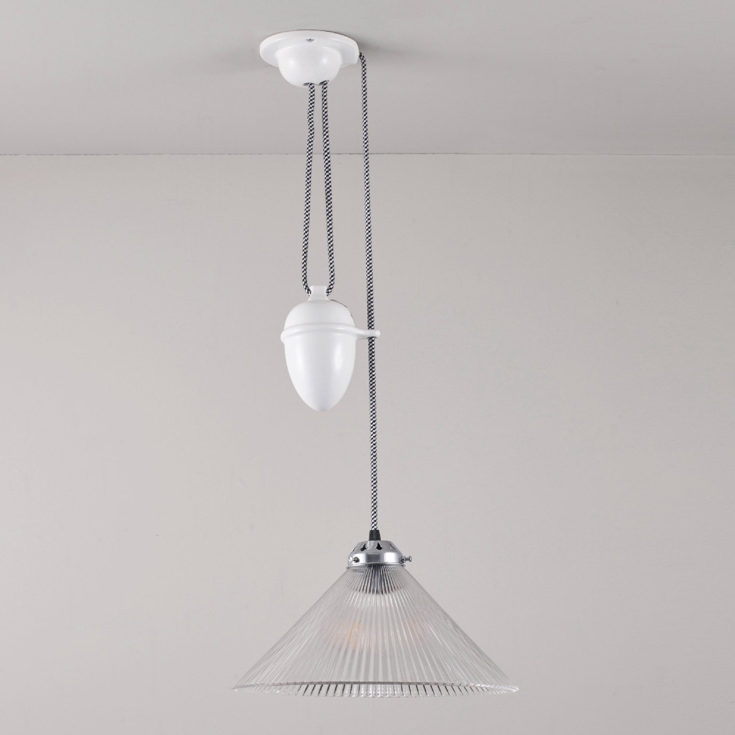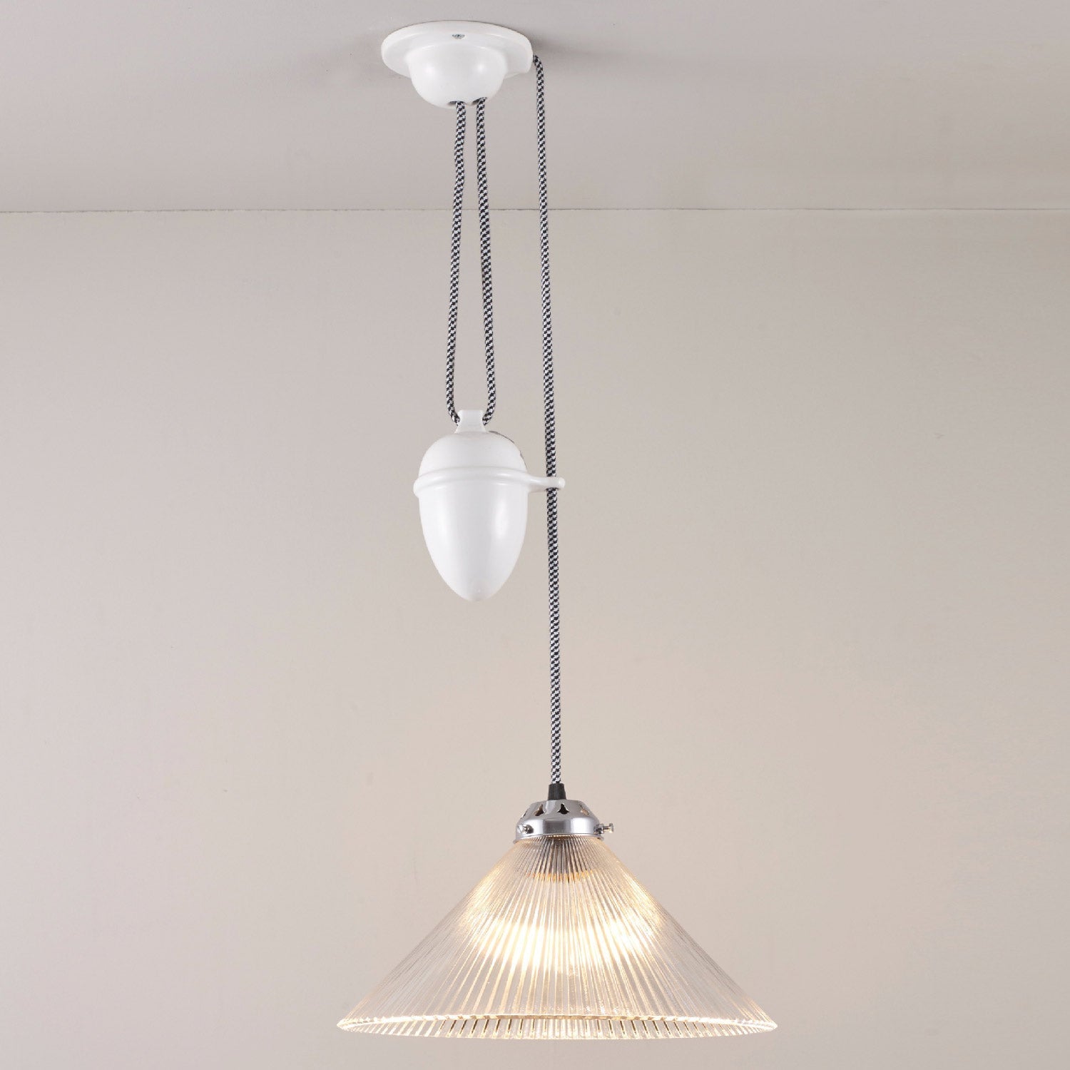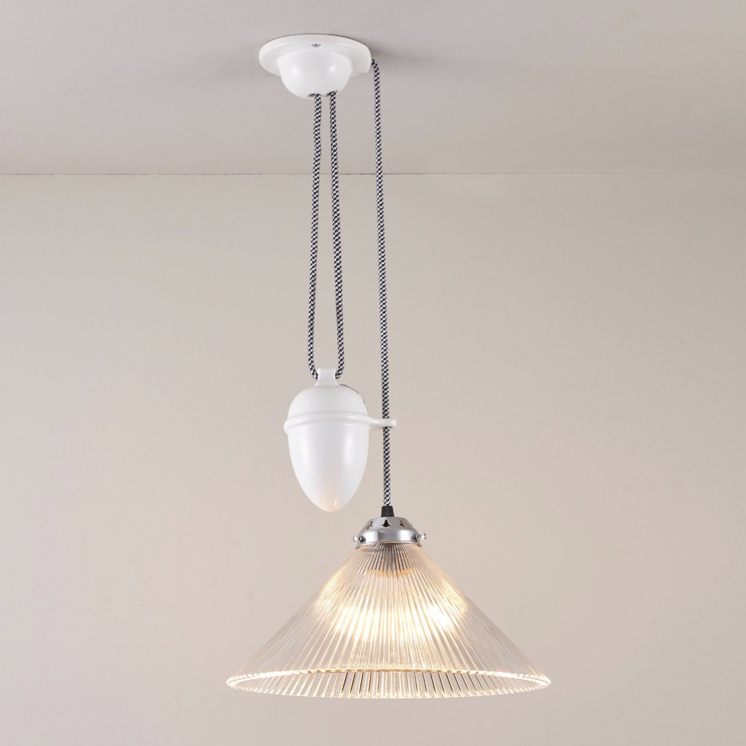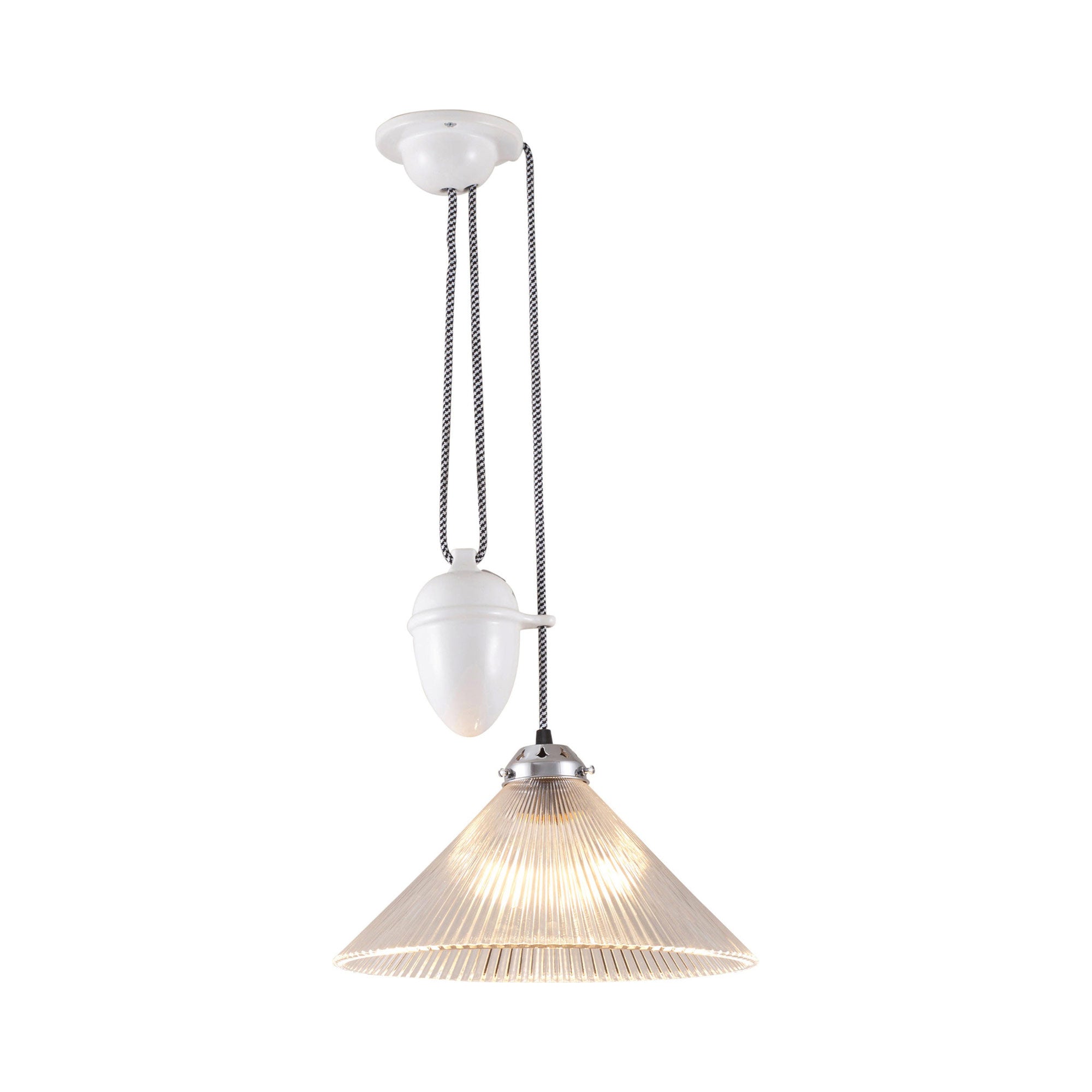 Function and style coexist in an approachable design with classic materials showing up to impress. A conical shade made of textural prismatic glass sets the pace as the Conical Rise & Fall Pendant Light from Original BTC adds a hint of glam to a timeless design that works in a number of settings. Adjust its drop for perfect customized light delivery, using a cheeky cobb element mounted right next to its shade.