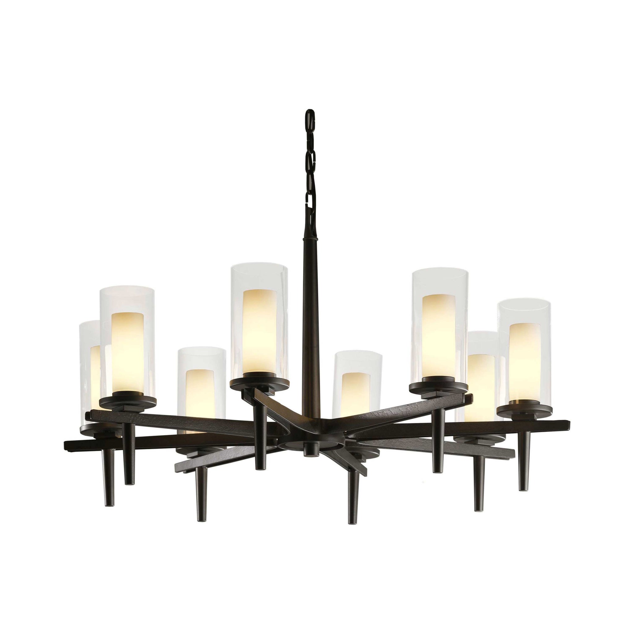 Eight radiating arms capped with two-layer shades decorate the Constellation Chandelier from Hubbardton Forge.