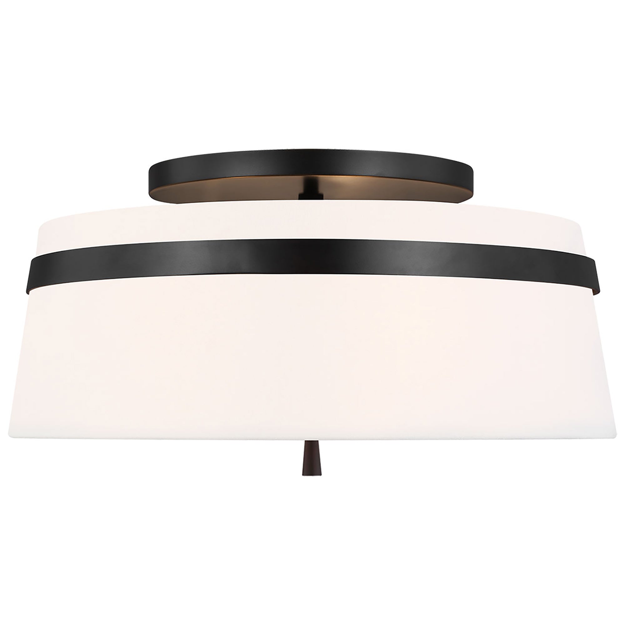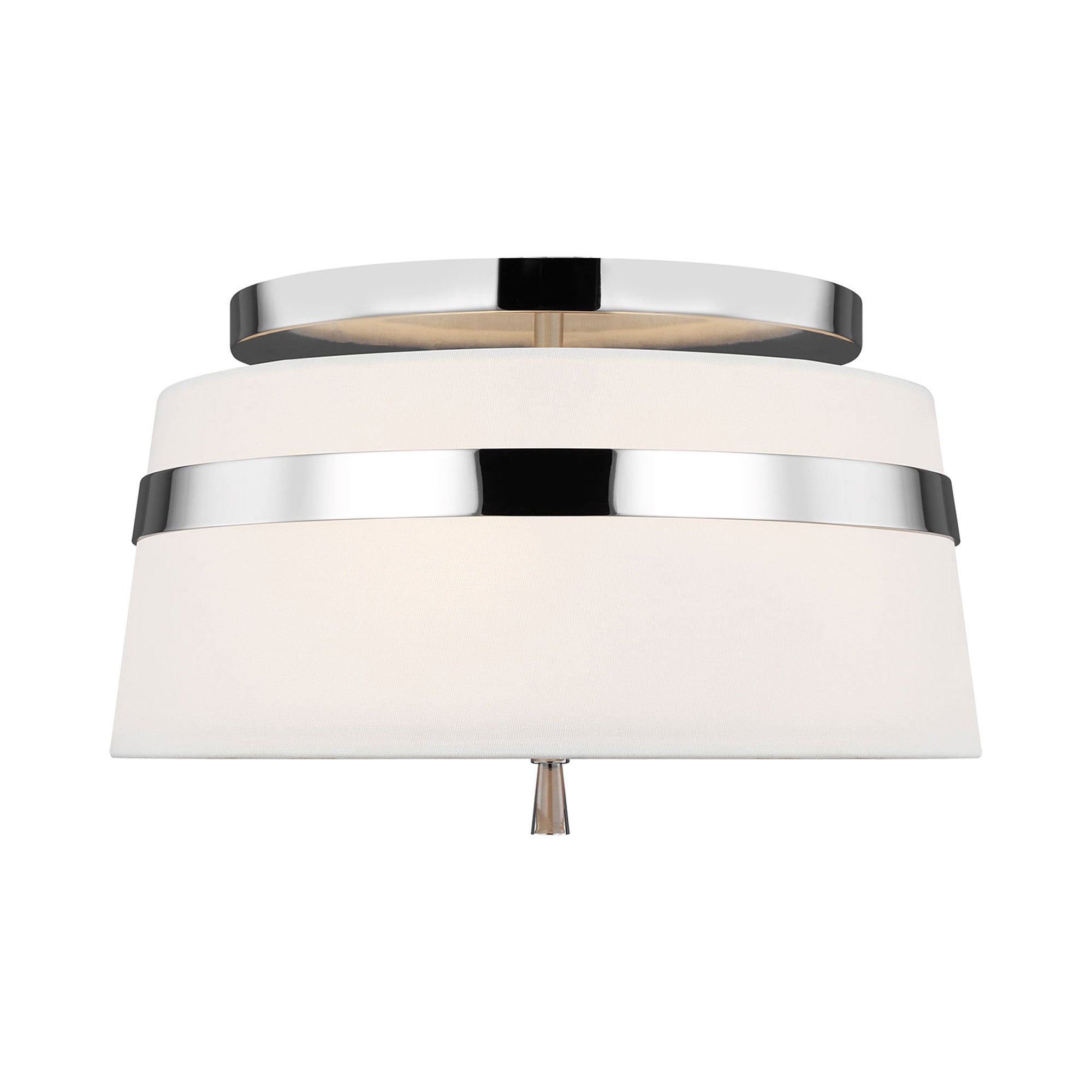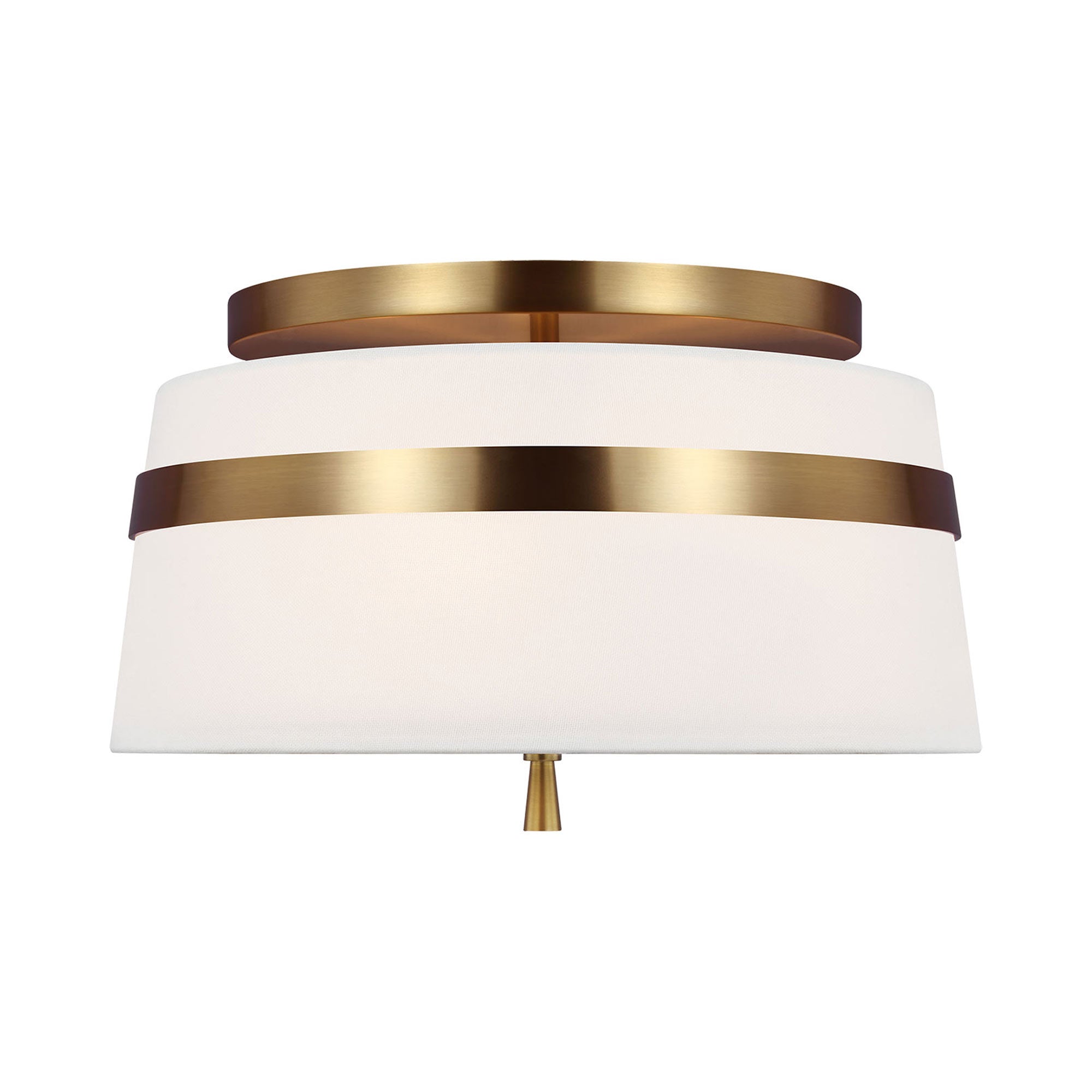 Delicate bands enhance the sleek simplicity of the Cordtlandt Semi-Flush Mount Ceiling Light from Visual Comfort Studio. Its refined design delivers alluring illumination with a white linen drum shade with slight taper, paired with a metallic finish that adds the perfect dose of contrast over a bedroom, den, or seating group.