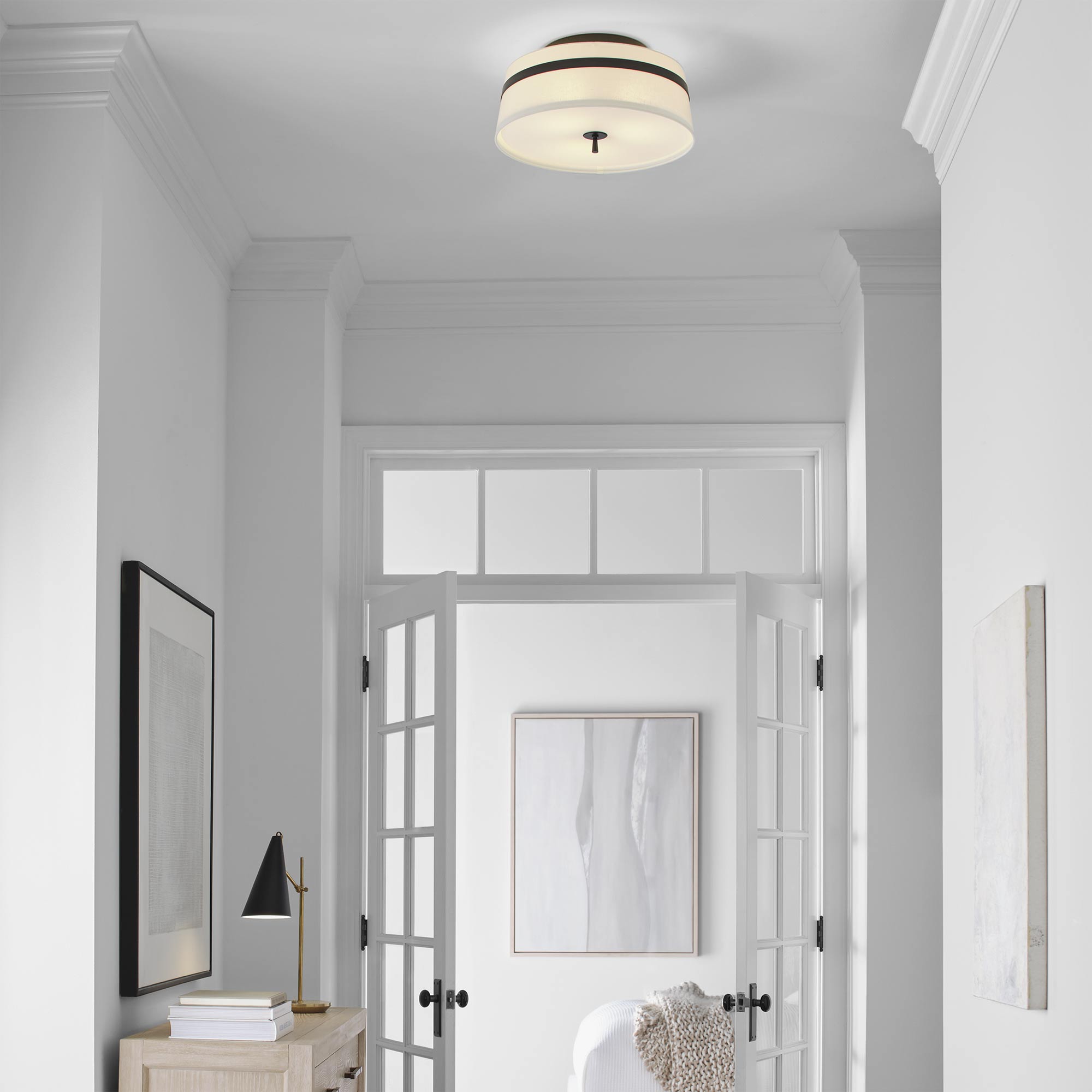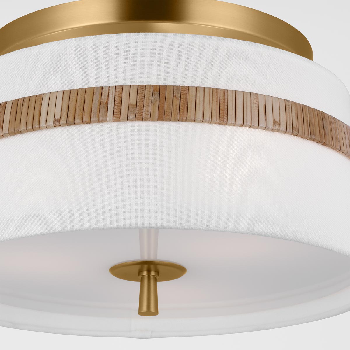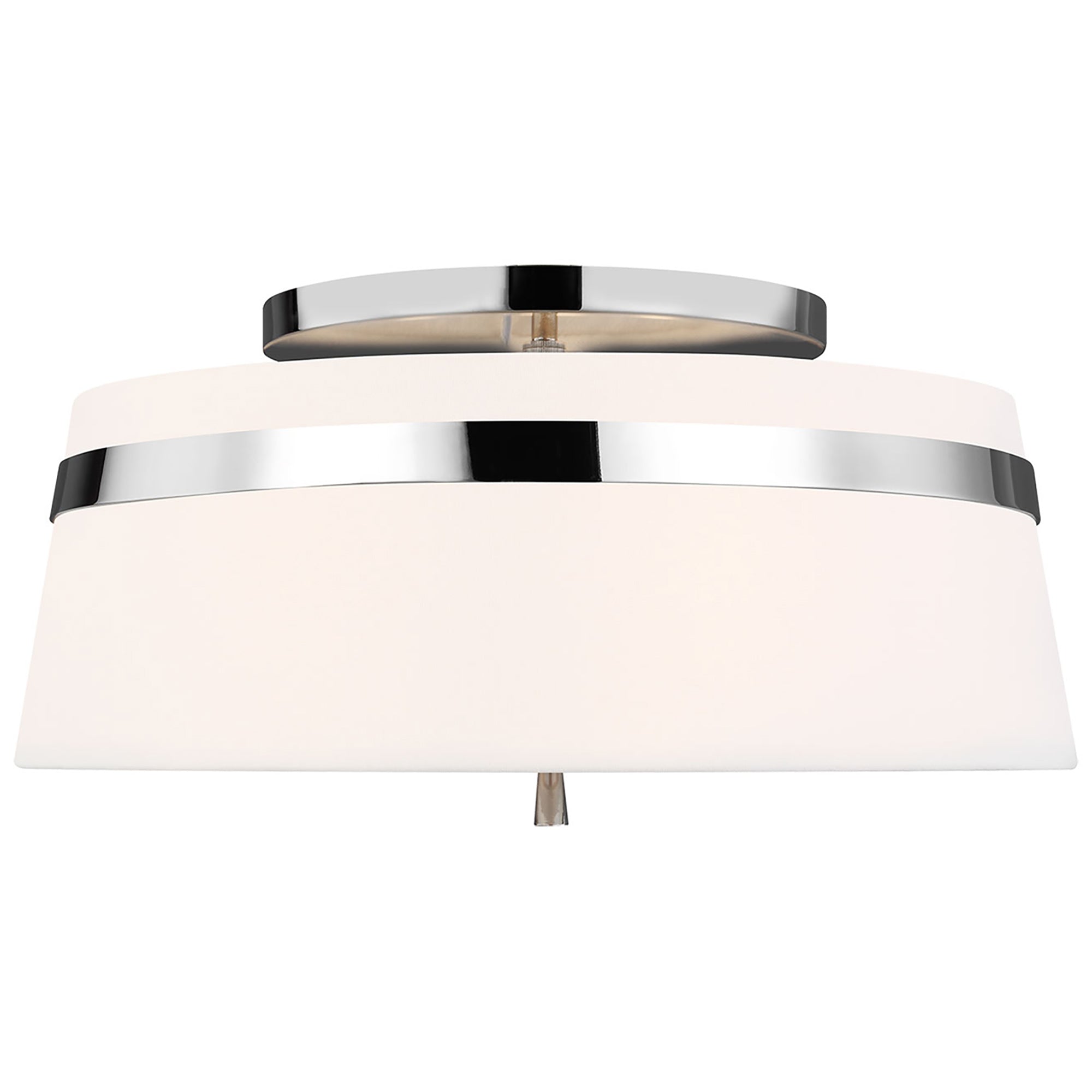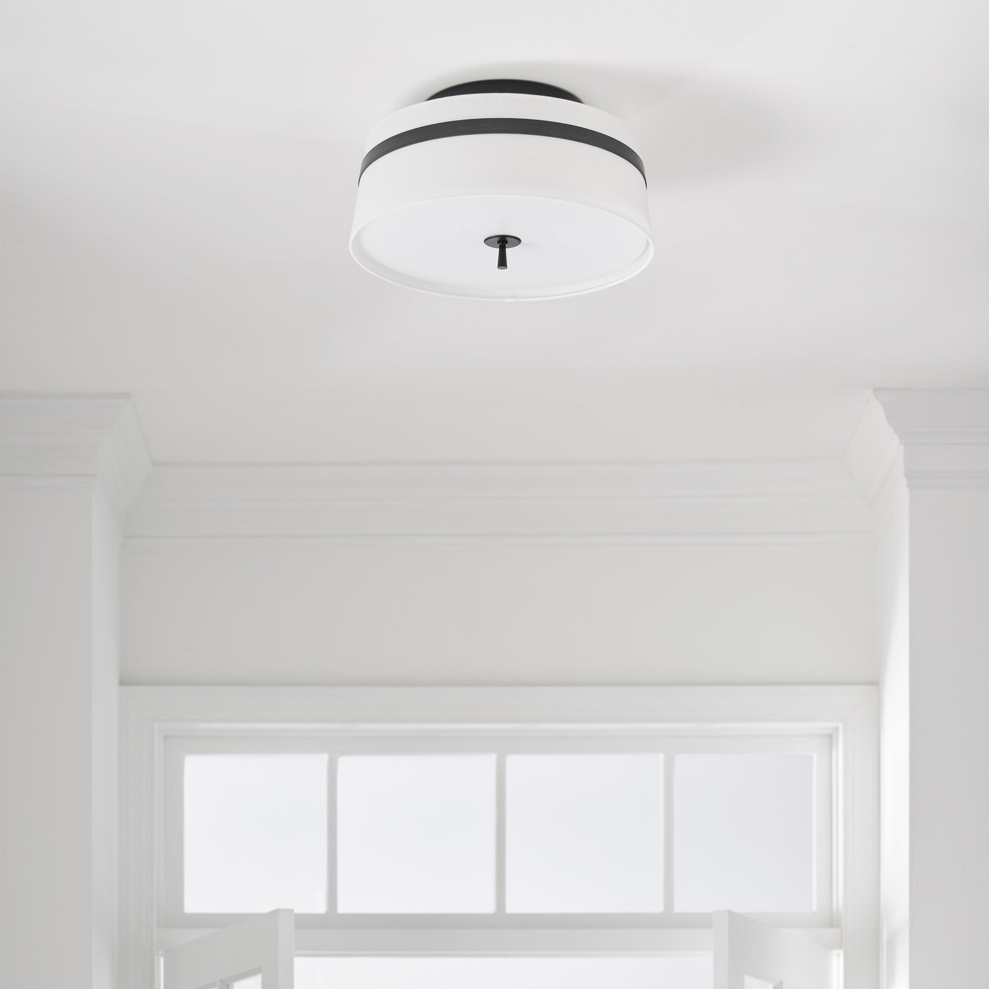 Delicate bands enhance the sleek simplicity of the Cordtlandt Semi-Flush Mount Ceiling Light from Visual Comfort Studio. Its refined design delivers alluring illumination with a white linen drum shade with slight taper, paired with a metallic finish that adds the perfect dose of contrast over a bedroom, den, or seating group.