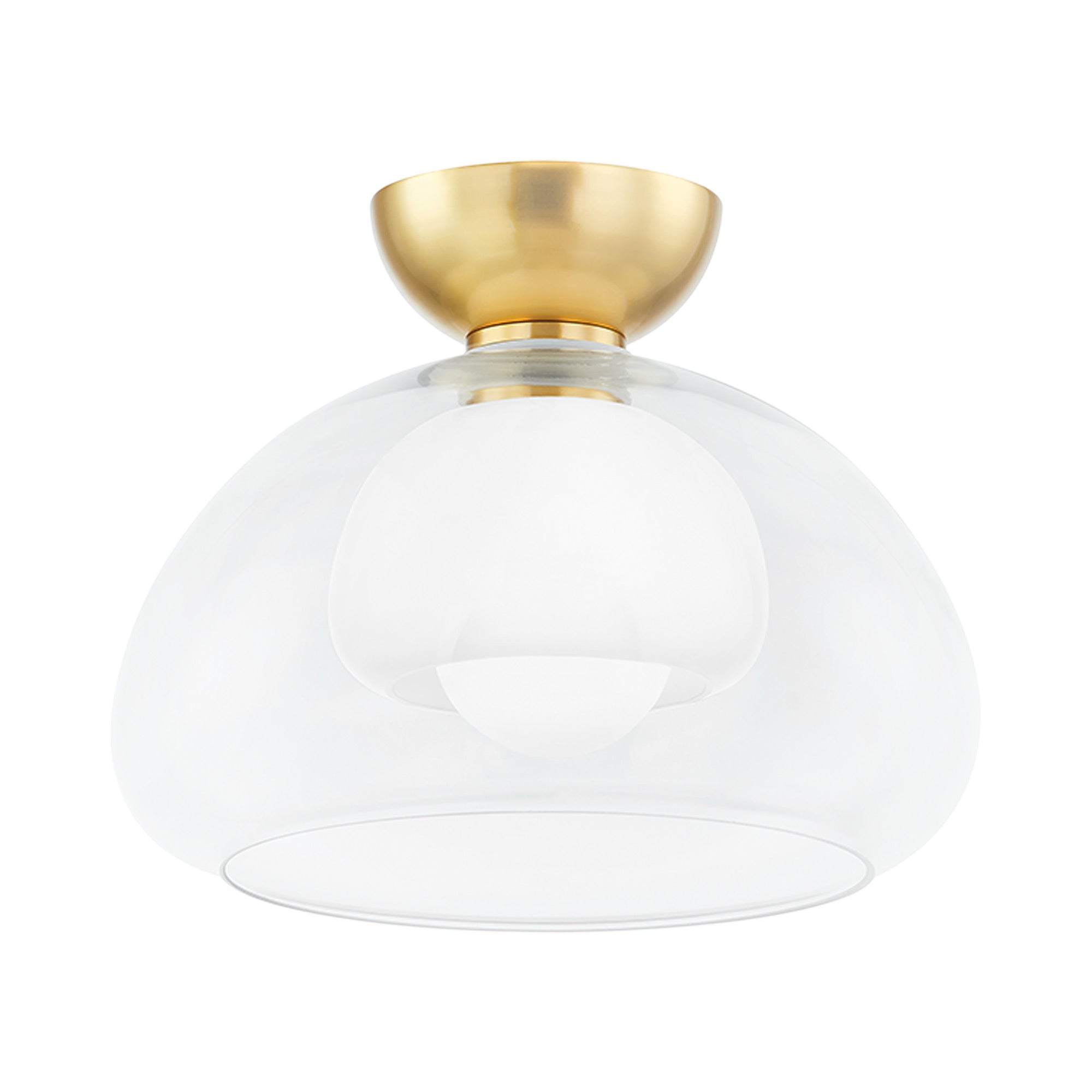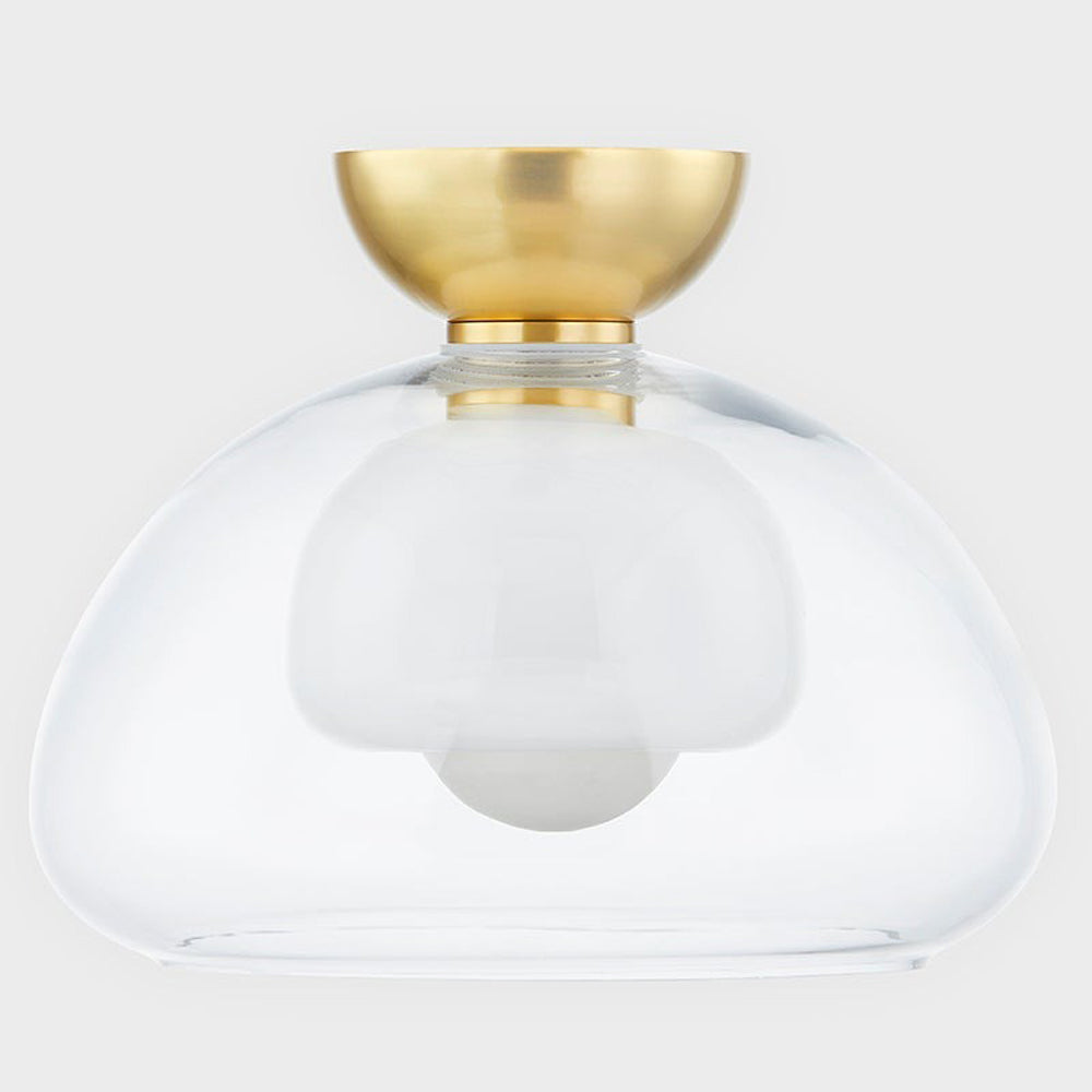 Graceful curves enhance the simplicity and elegance of the modern Cortney Semi Flush Mount Ceiling Light from Mitzi. An impressive upgrade in a bedroom or den, it showcases a layered shade presentation with glossy opal glass captured within an outer shade of clear glass. Its domed profile is echoed in the ceiling plate, offering refined flair in a hall, den, or living area.