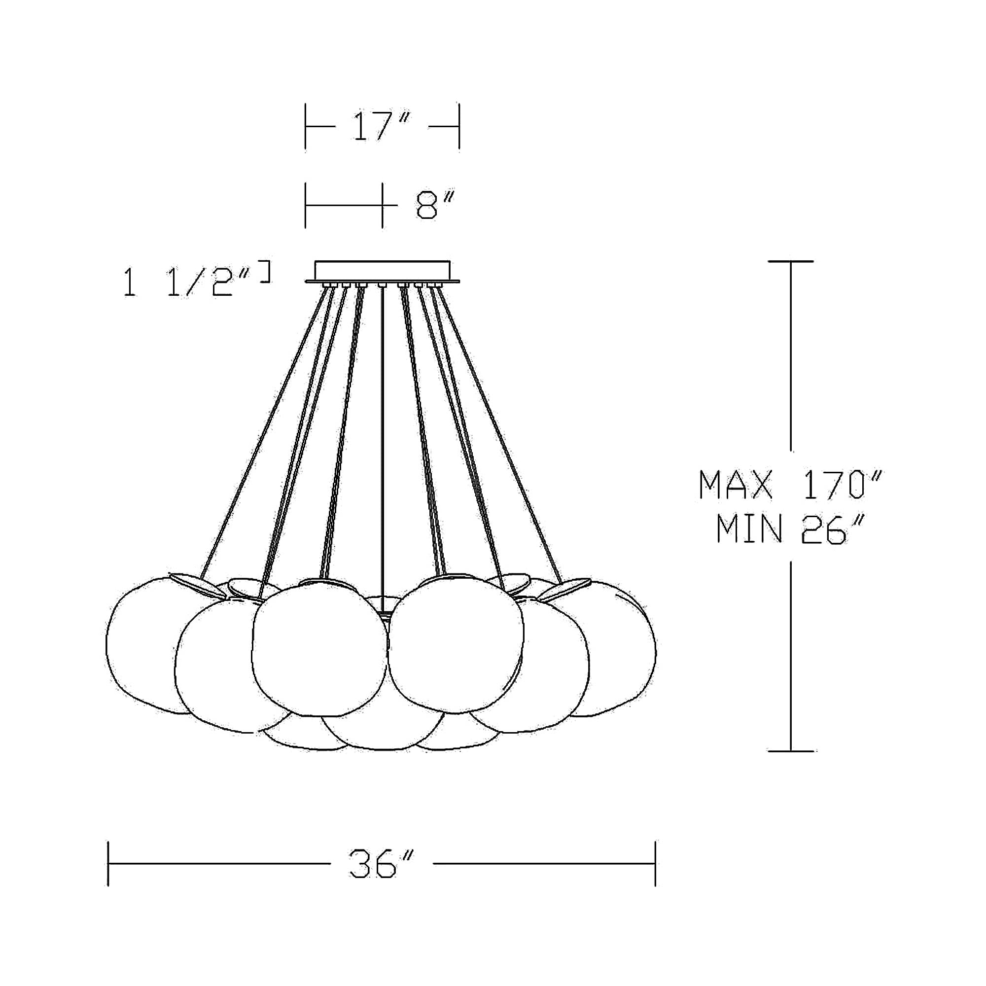 - 12-Light: 36"D X 10"H; 180" max height