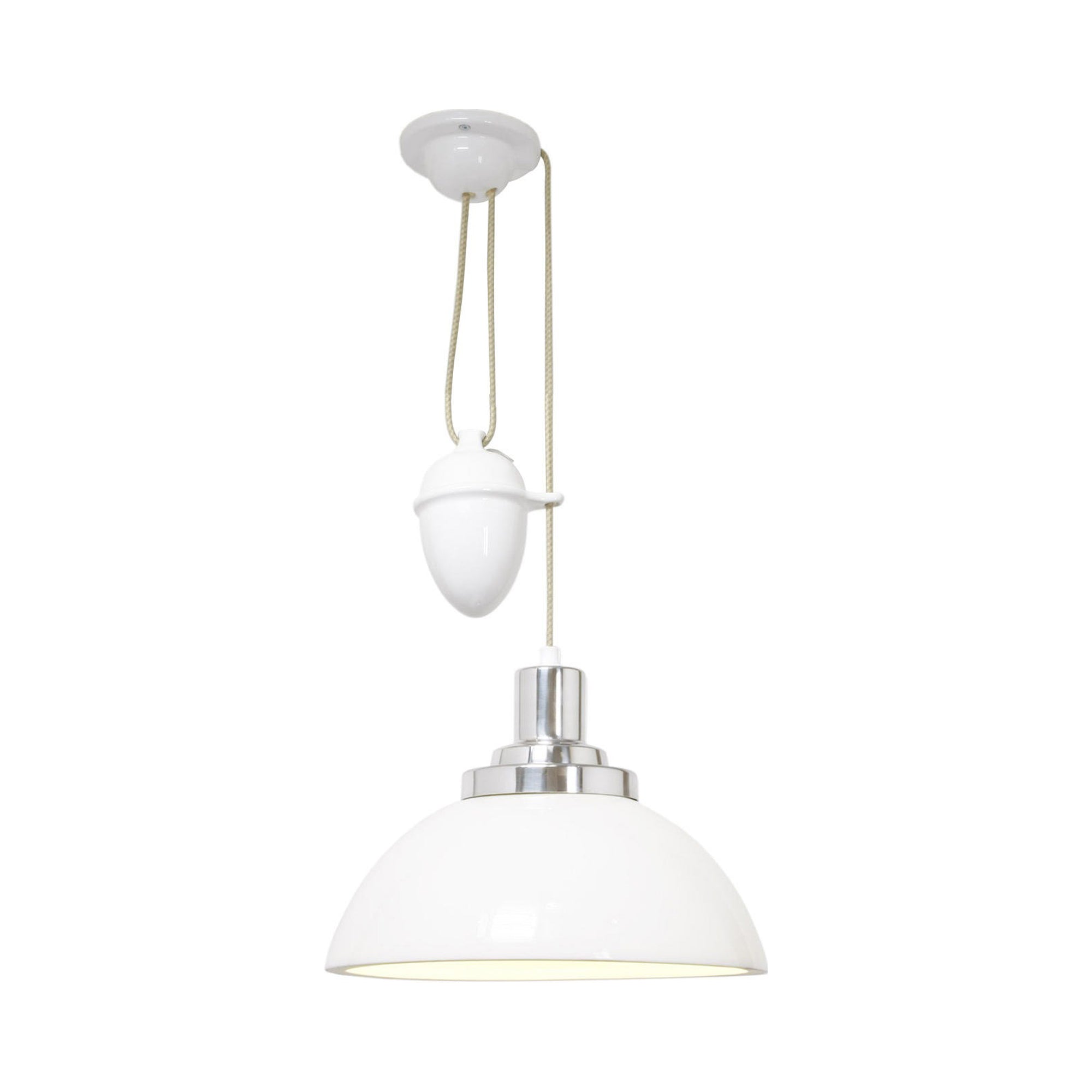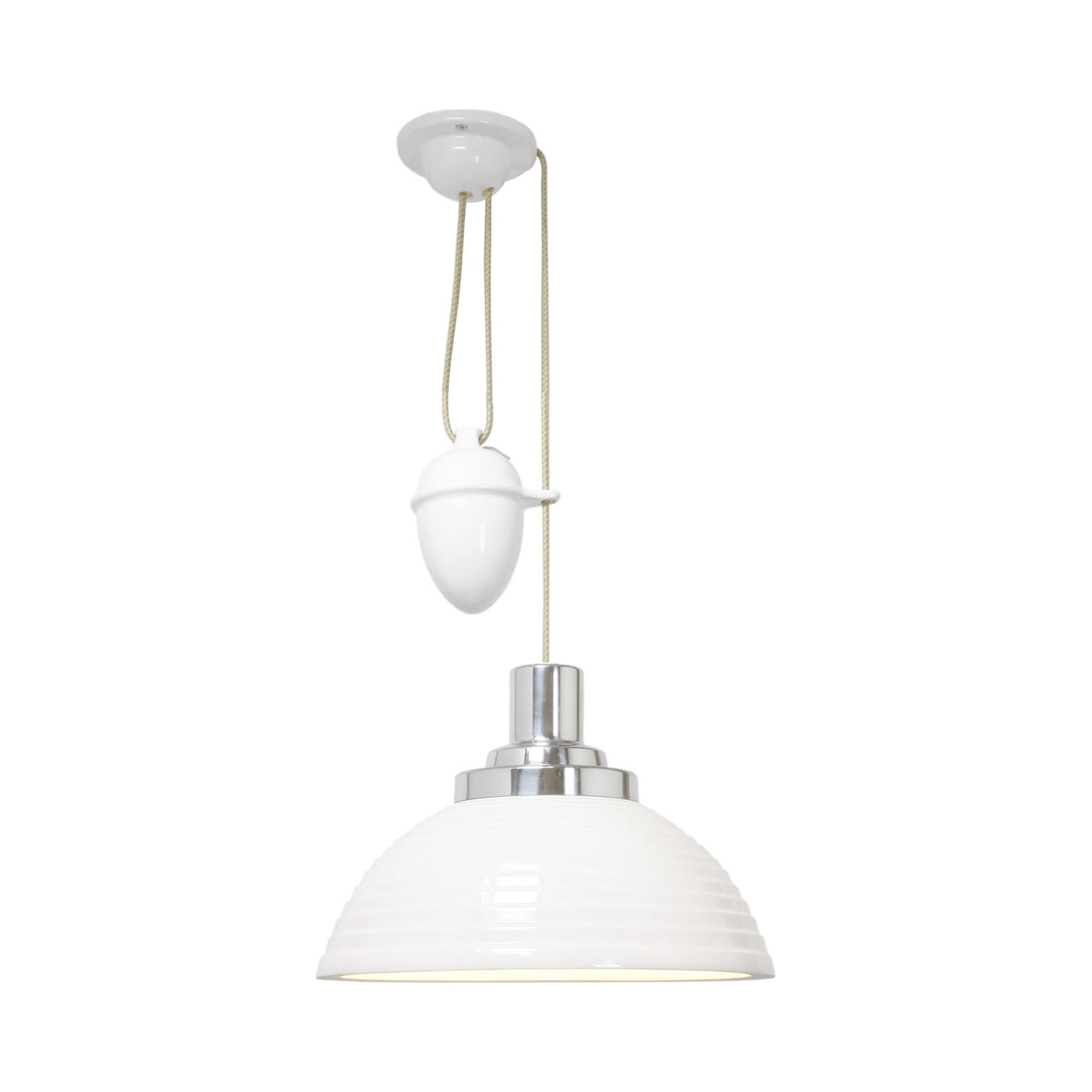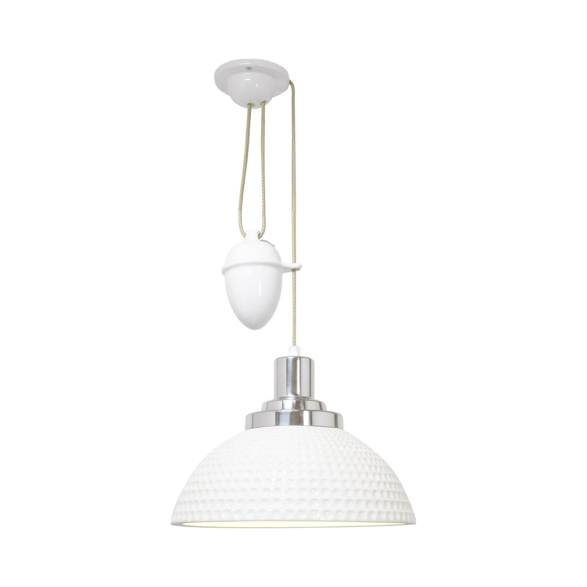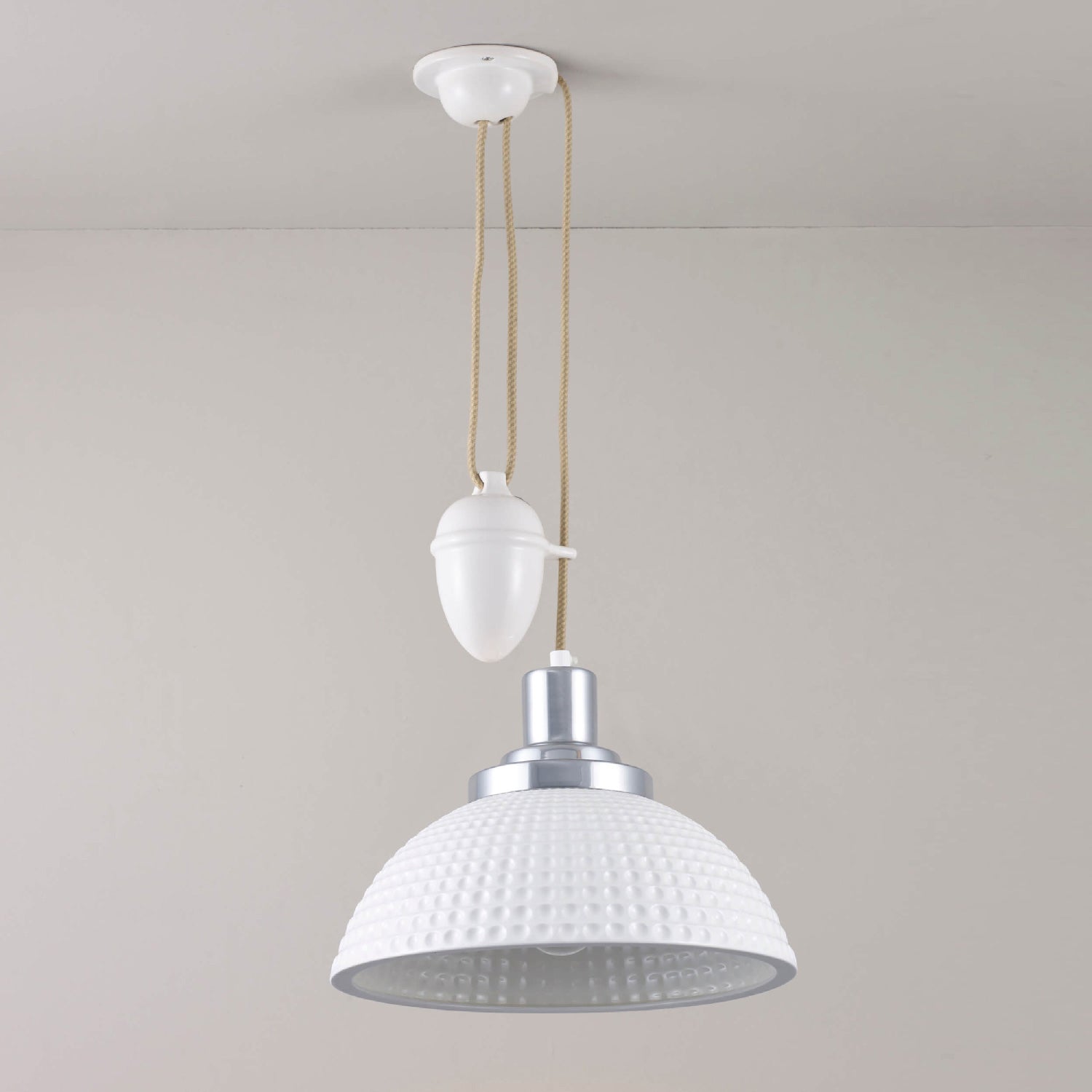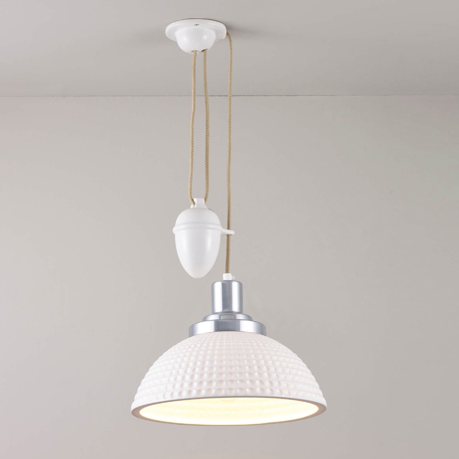 Ceramic brings a lot to the table as the Cosmo Rise And Fall Pendant Light from Original BTC reflects blended motifs of artisanal style and farmhouse modern. Natural white bone china creates a semi-circle shade with textural patterning, suspended by a fabric cord and showing off a stylish metal holder. A cobb element creates quick access to a pulley-like configuration allowing frequent adjustments to this pendant's length.